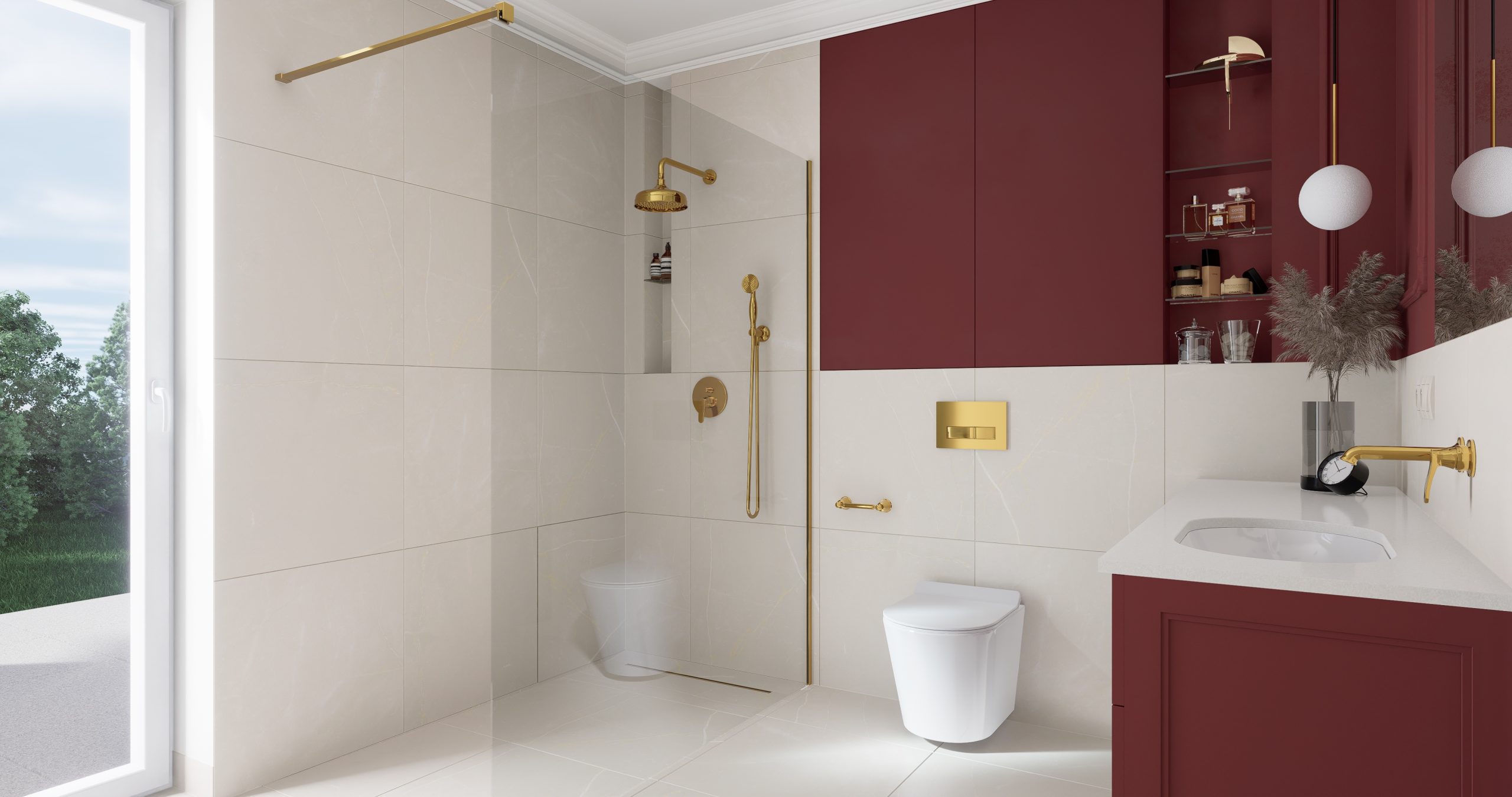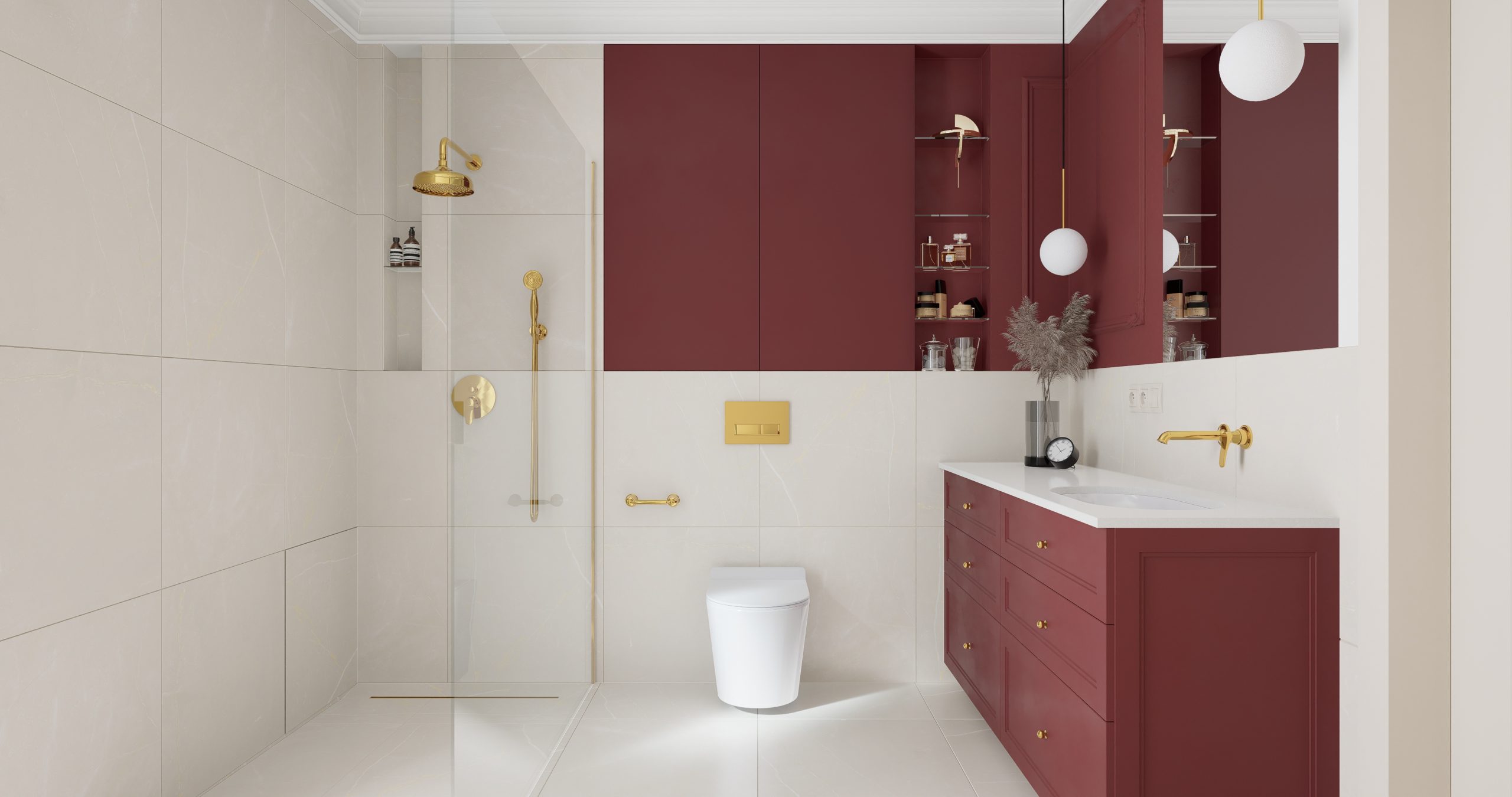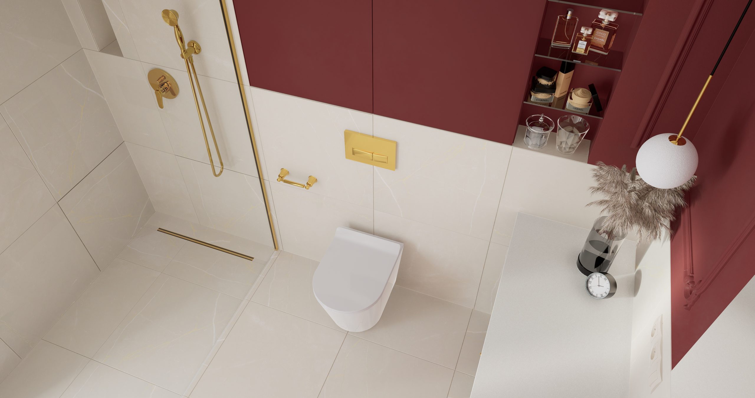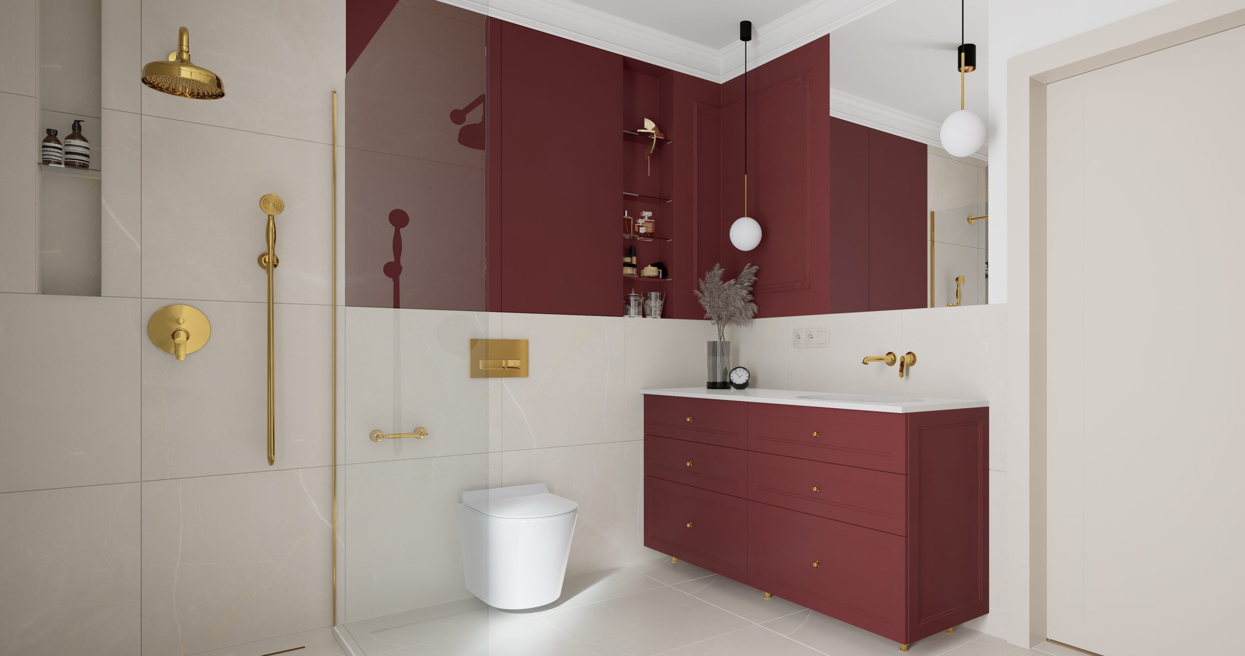 Kolor bordowy, który króluje w tym wnętrzu, jest symbolem pewności siebie oraz wyrafinowania. To nie tylko barwa, to manifestacja charakteru i stylu. Subtelnie stylizowana złota armatura dodaje blasku i prestiżu, tworząc harmonijny kontrast z delikatnym beżem, który wprowadza do wnętrza subtelną harmonię. Projektując łazienki chcemy, aby nie były one jedynie miejscem codziennych rytuałów, ale również oazą relaksu i piękna!