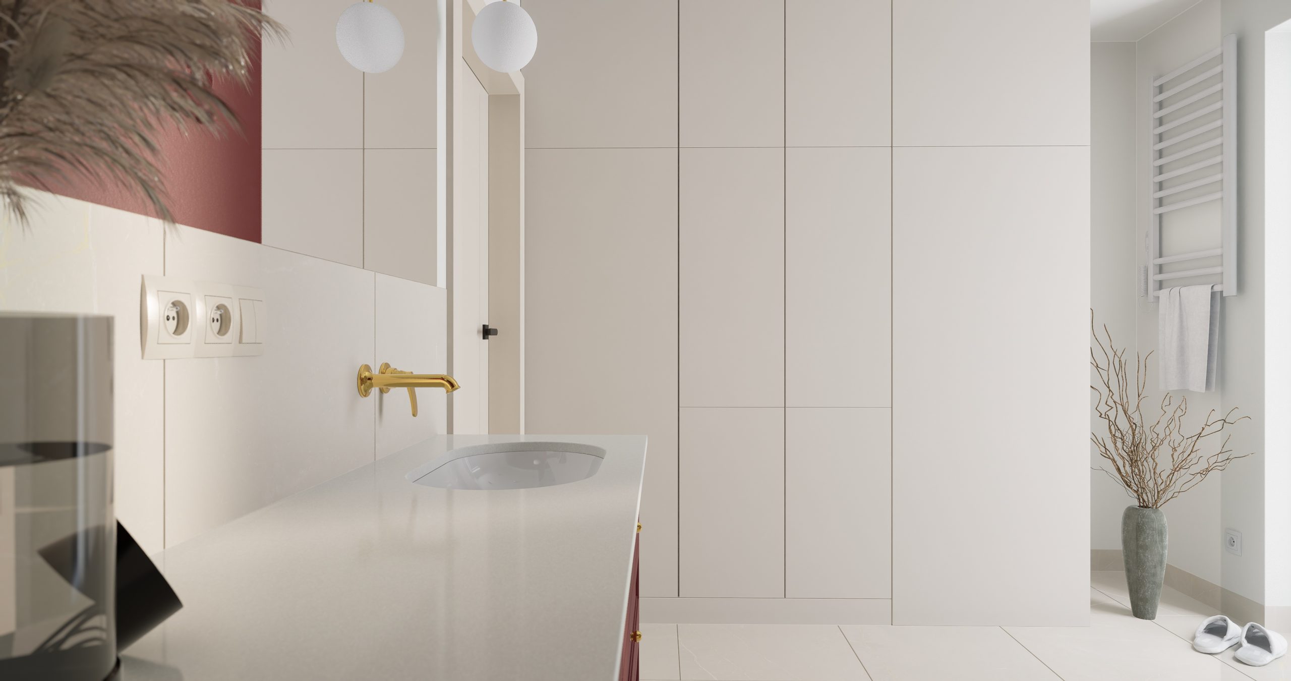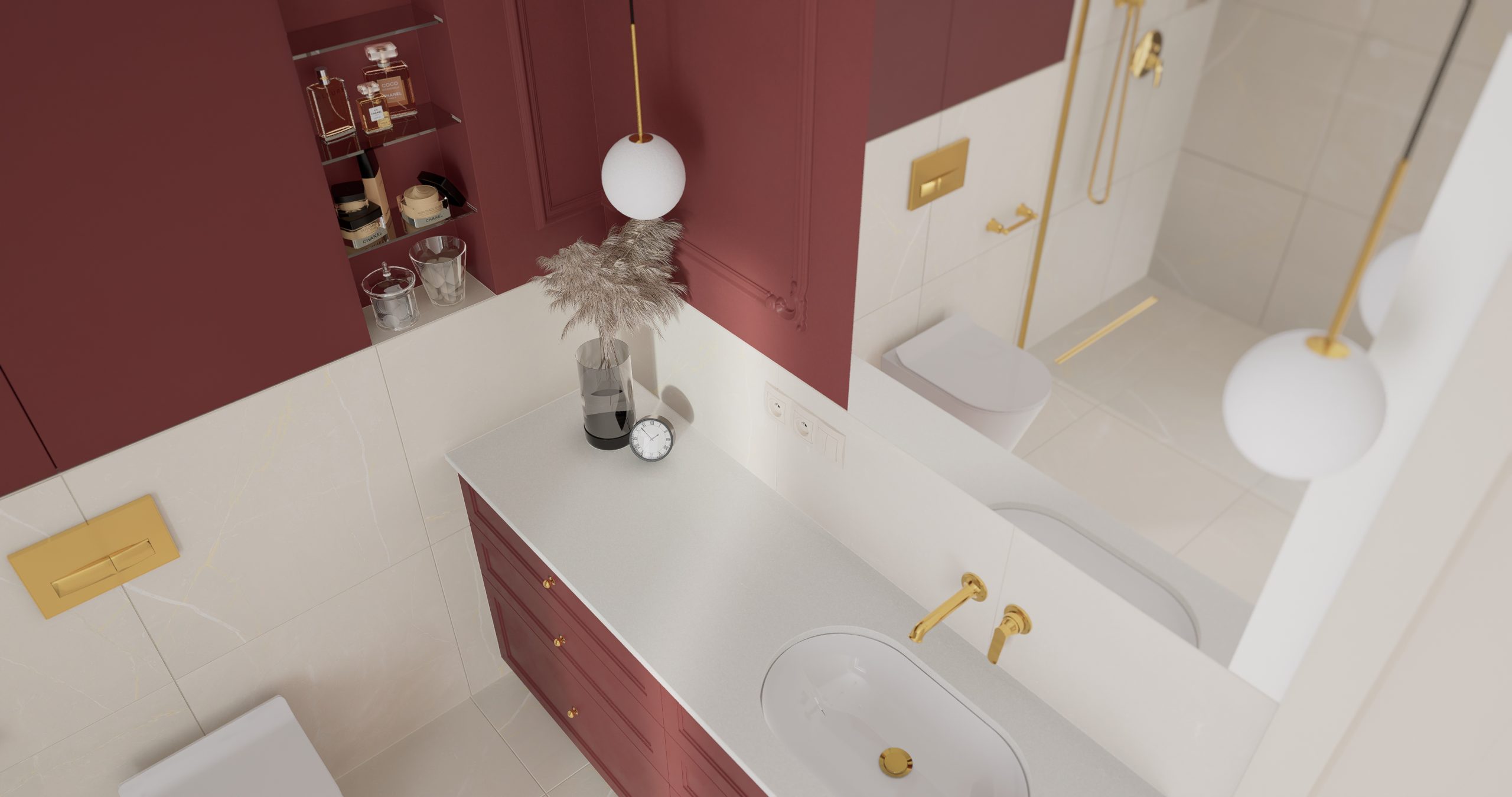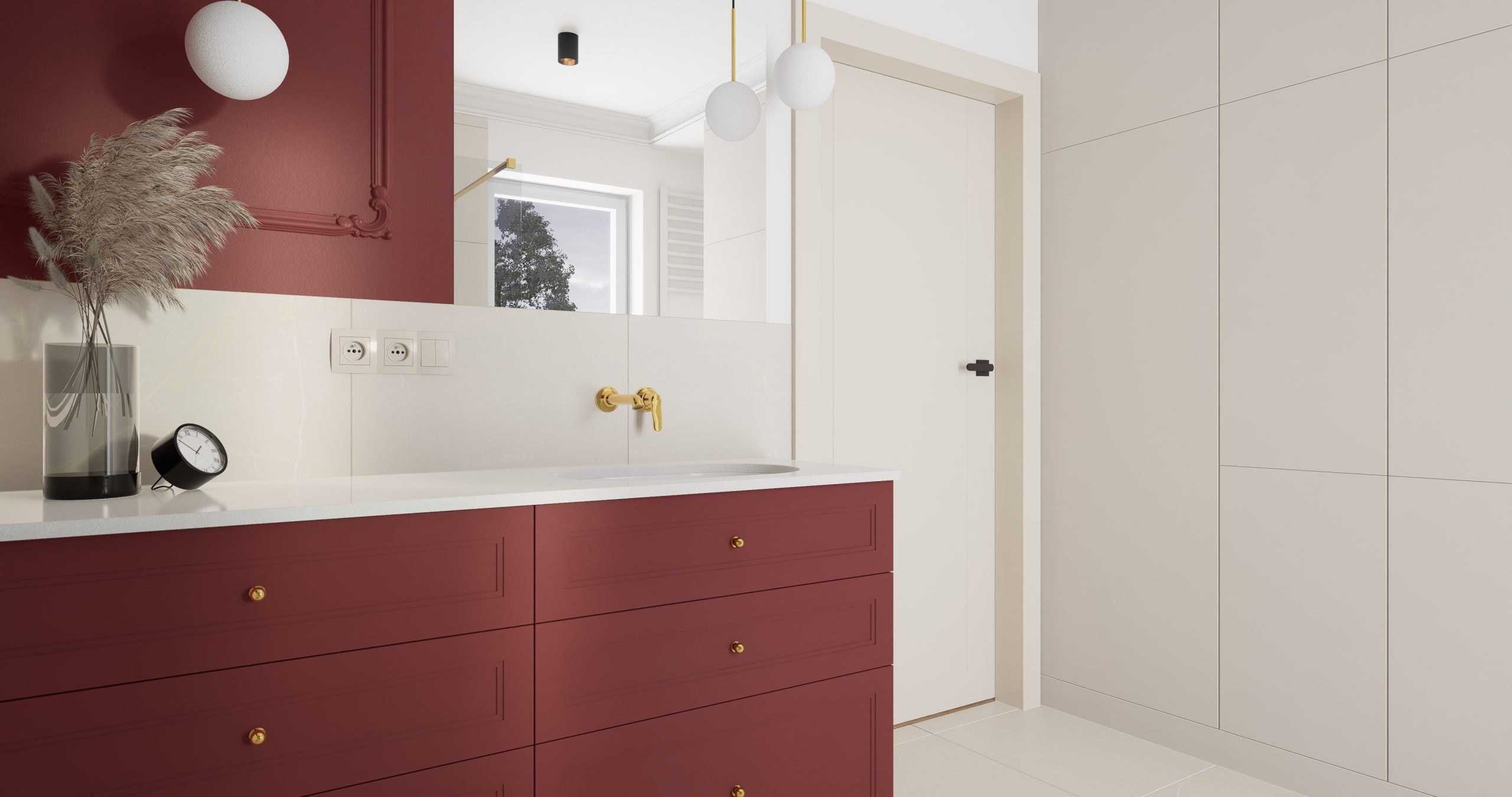 Kolor bordowy, który króluje w tym wnętrzu, jest symbolem pewności siebie oraz wyrafinowania. To nie tylko barwa, to manifestacja charakteru i stylu. Subtelnie stylizowana złota armatura dodaje blasku i prestiżu, tworząc harmonijny kontrast z delikatnym beżem, który wprowadza do wnętrza subtelną harmonię. Projektując łazienki chcemy, aby nie były one jedynie miejscem codziennych rytuałów, ale również oazą relaksu i piękna!