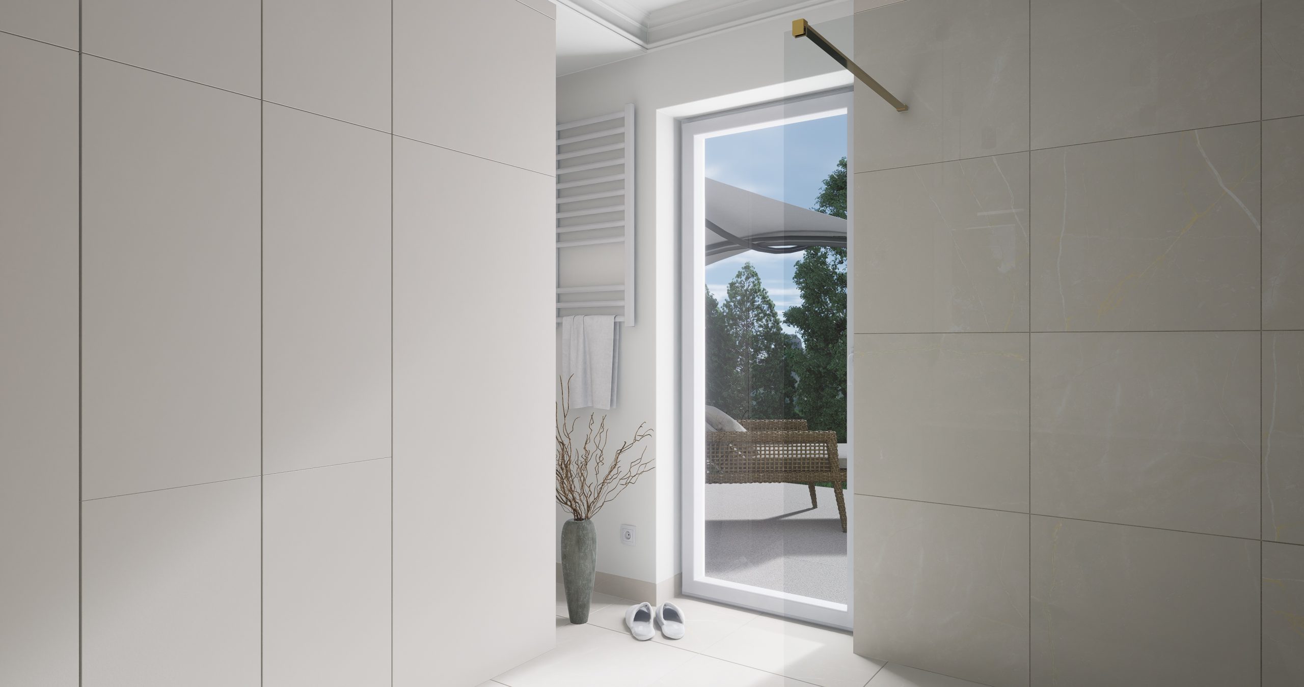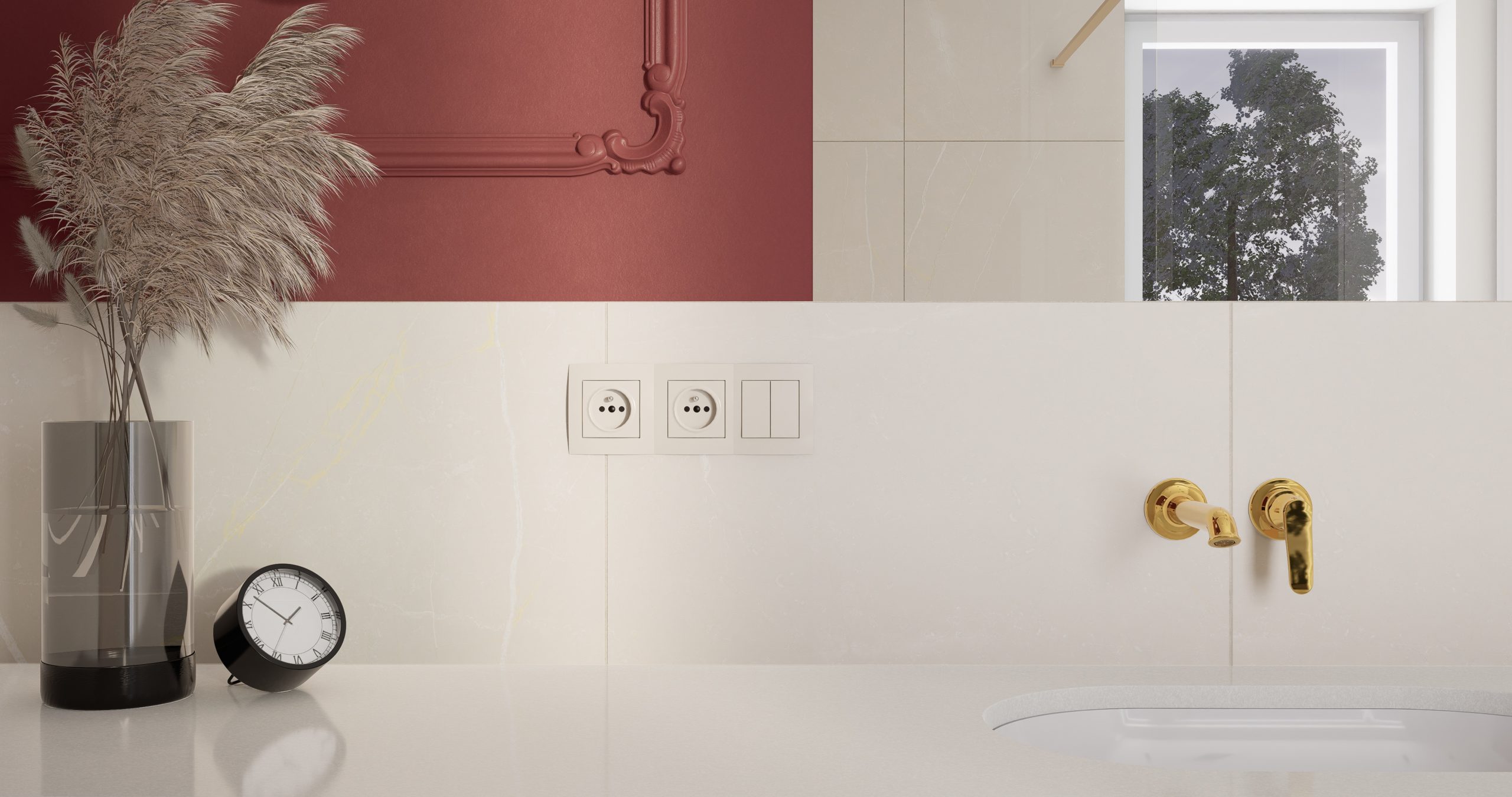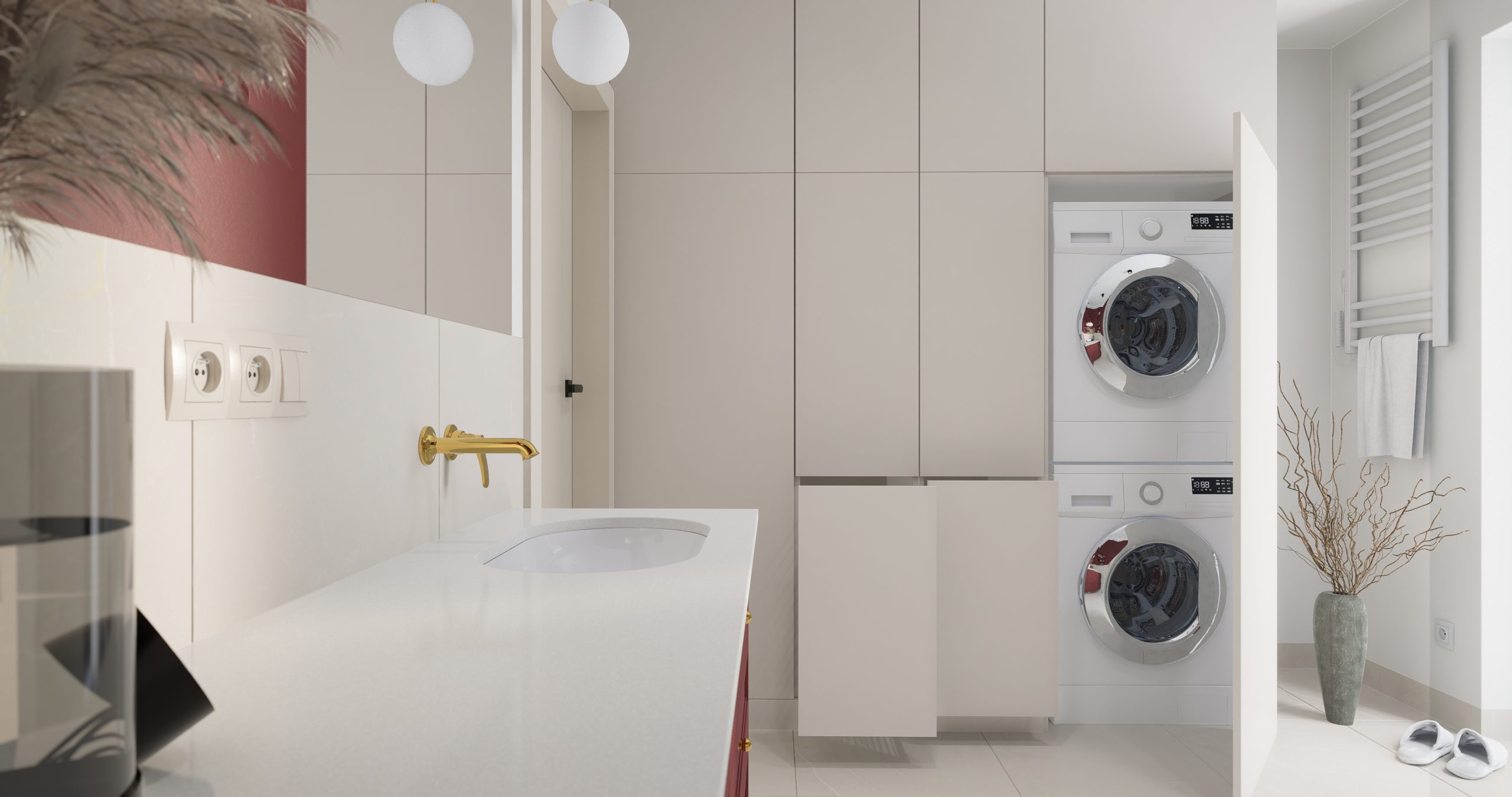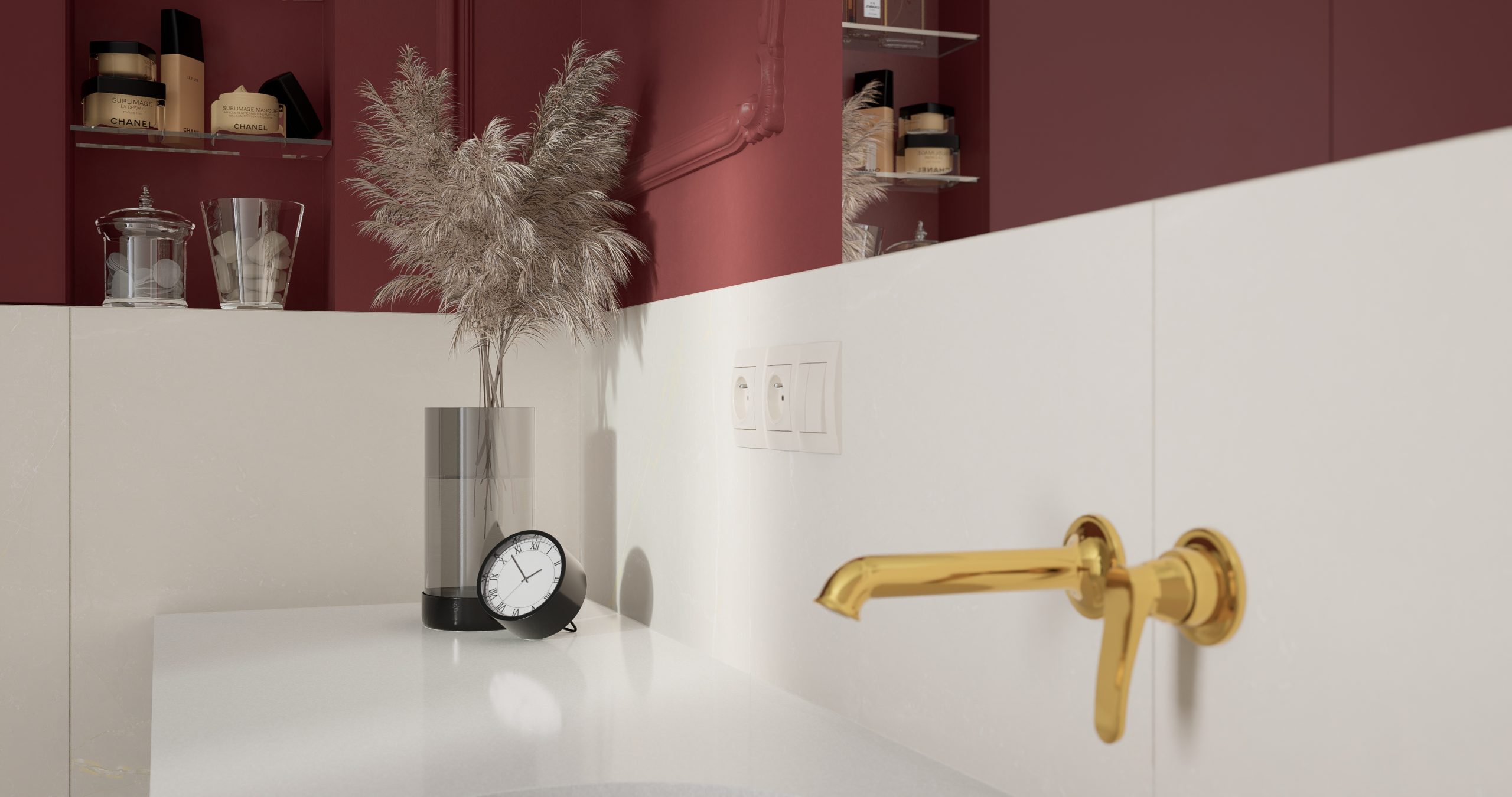 Kolor bordowy, który króluje w tym wnętrzu, jest symbolem pewności siebie oraz wyrafinowania. To nie tylko barwa, to manifestacja charakteru i stylu. Subtelnie stylizowana złota armatura dodaje blasku i prestiżu, tworząc harmonijny kontrast z delikatnym beżem, który wprowadza do wnętrza subtelną harmonię. Projektując łazienki chcemy, aby nie były one jedynie miejscem codziennych rytuałów, ale również oazą relaksu i piękna!