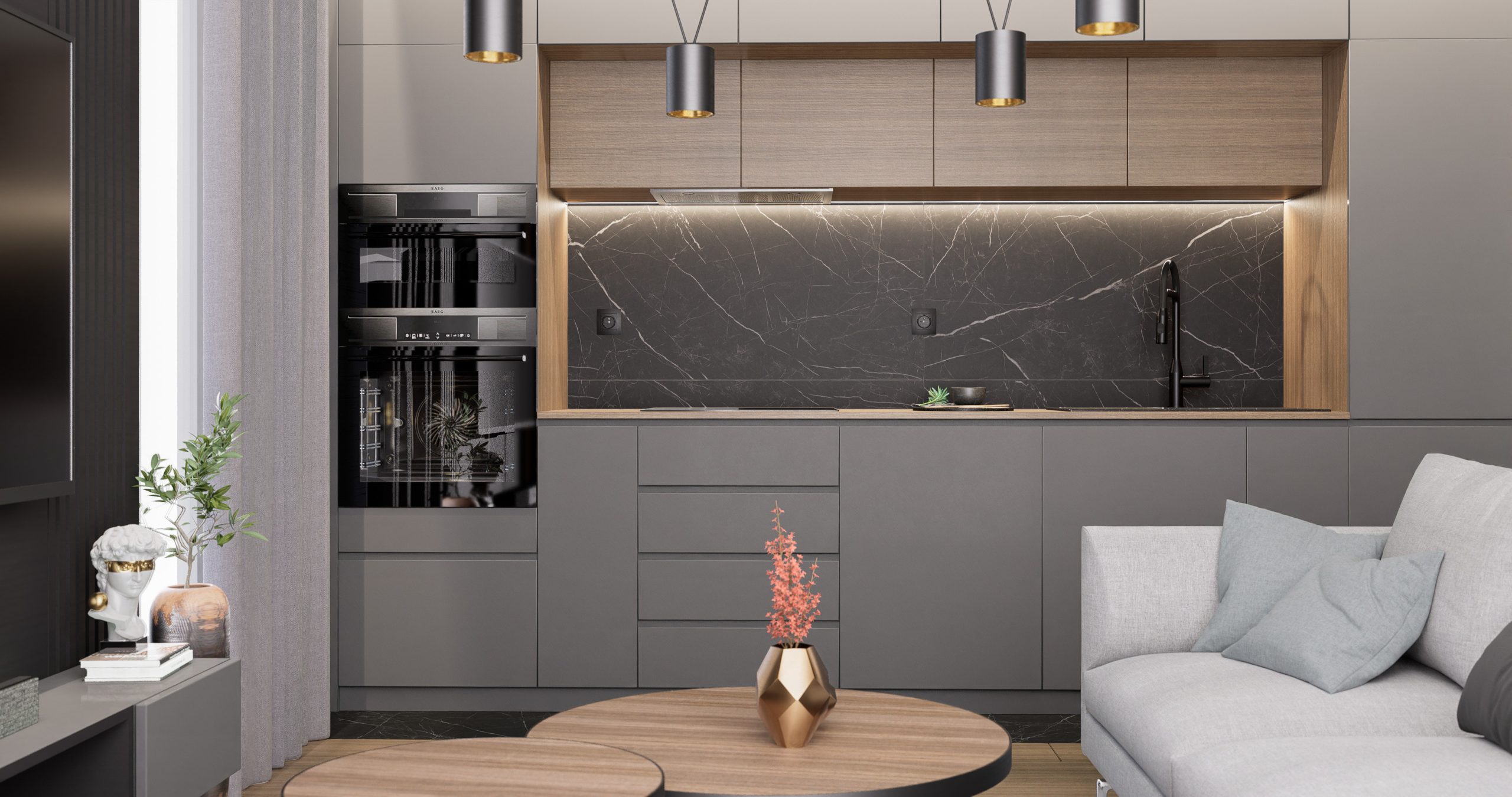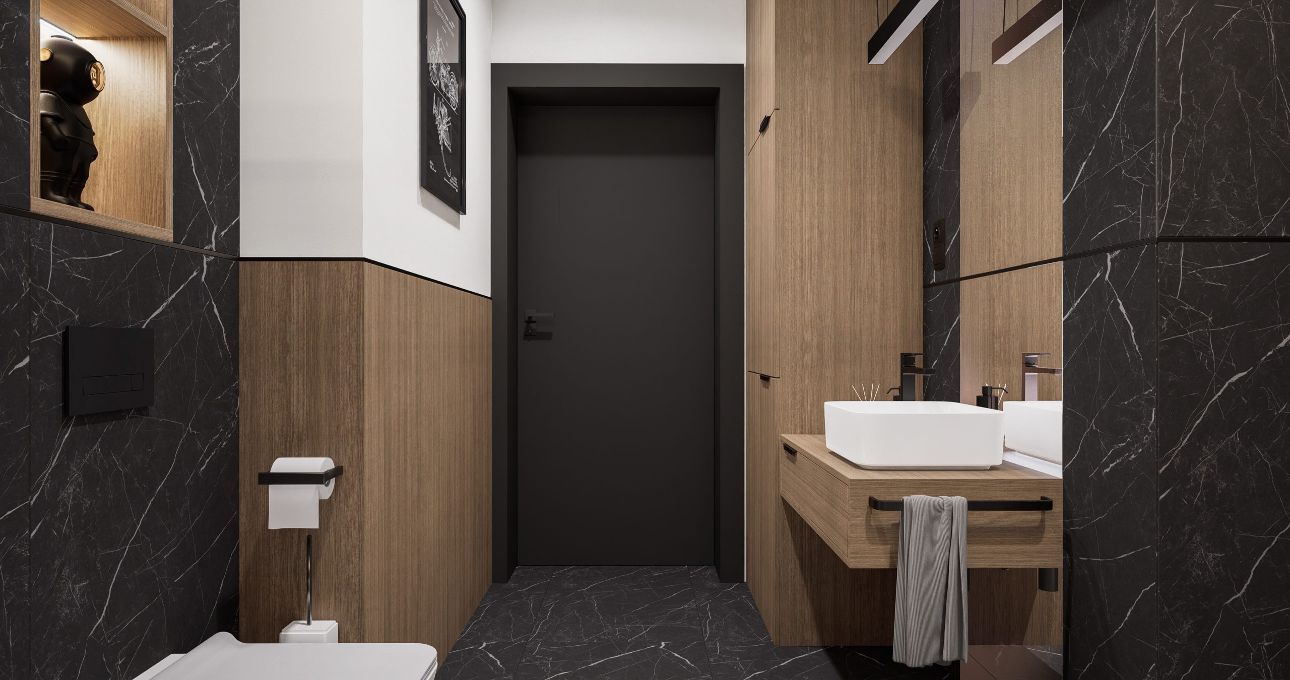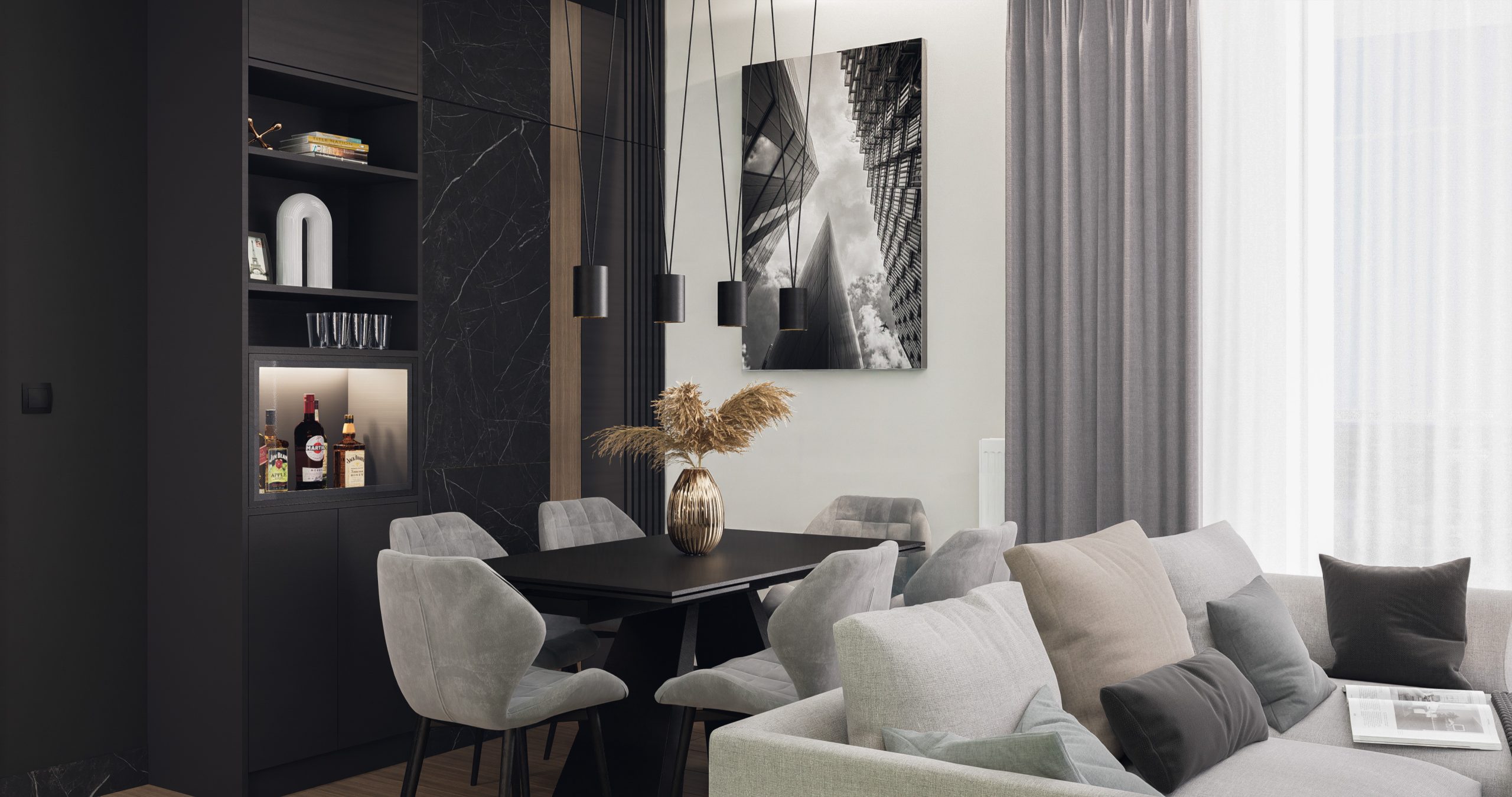 W części dziennej tego ekskluzywnego mieszkania, na niewielkiej przestrzeni, z sukcesem wydzieliłem strefę wypoczynkową, aneks kuchenny oraz jadalnię. Dominują tu czernie i odcienie szarości, a drewno dodaje przyjemnego ciepła. Subtelne akcenty w kolorze mosiądzu nadają całości charakteru.