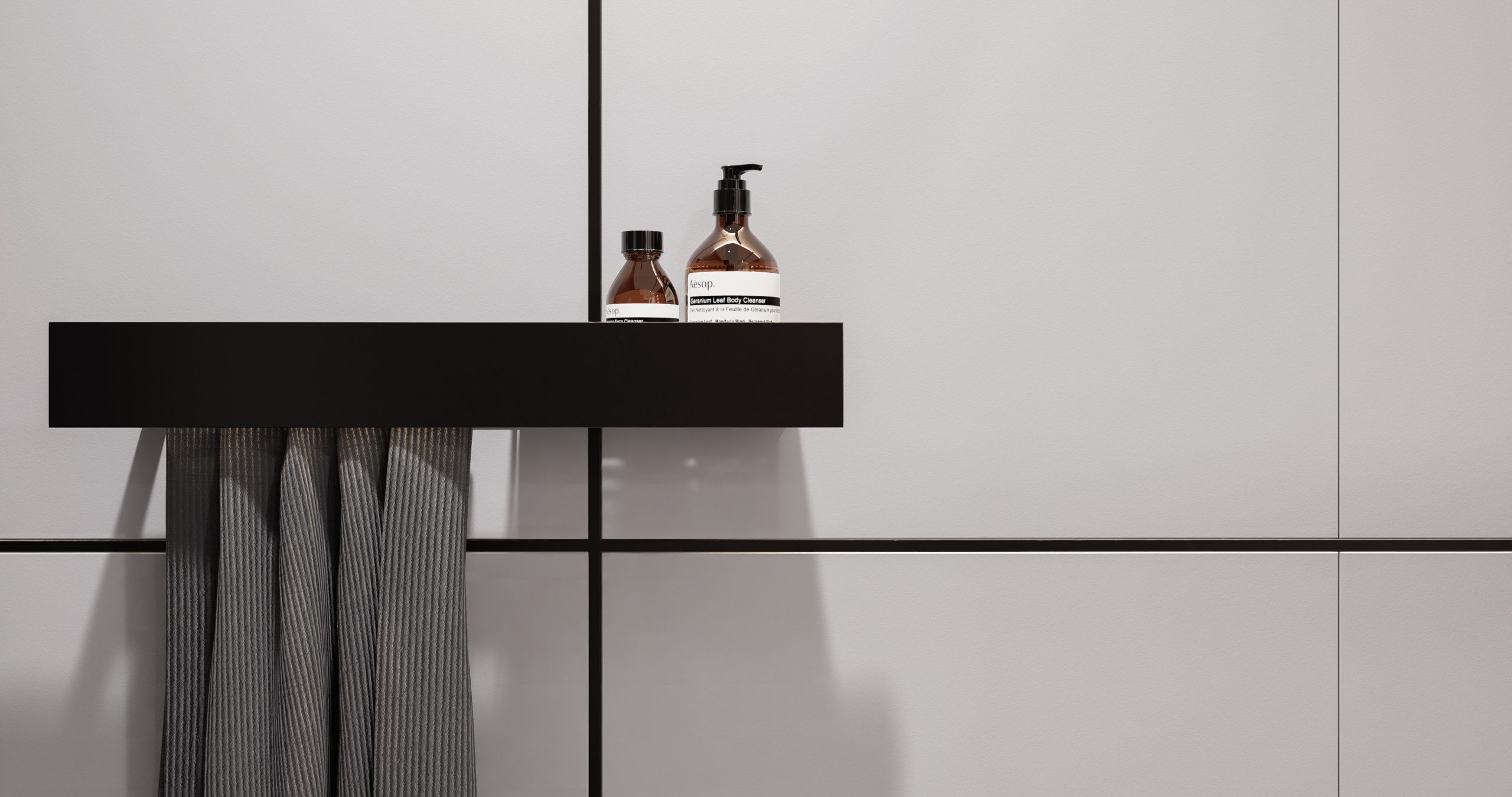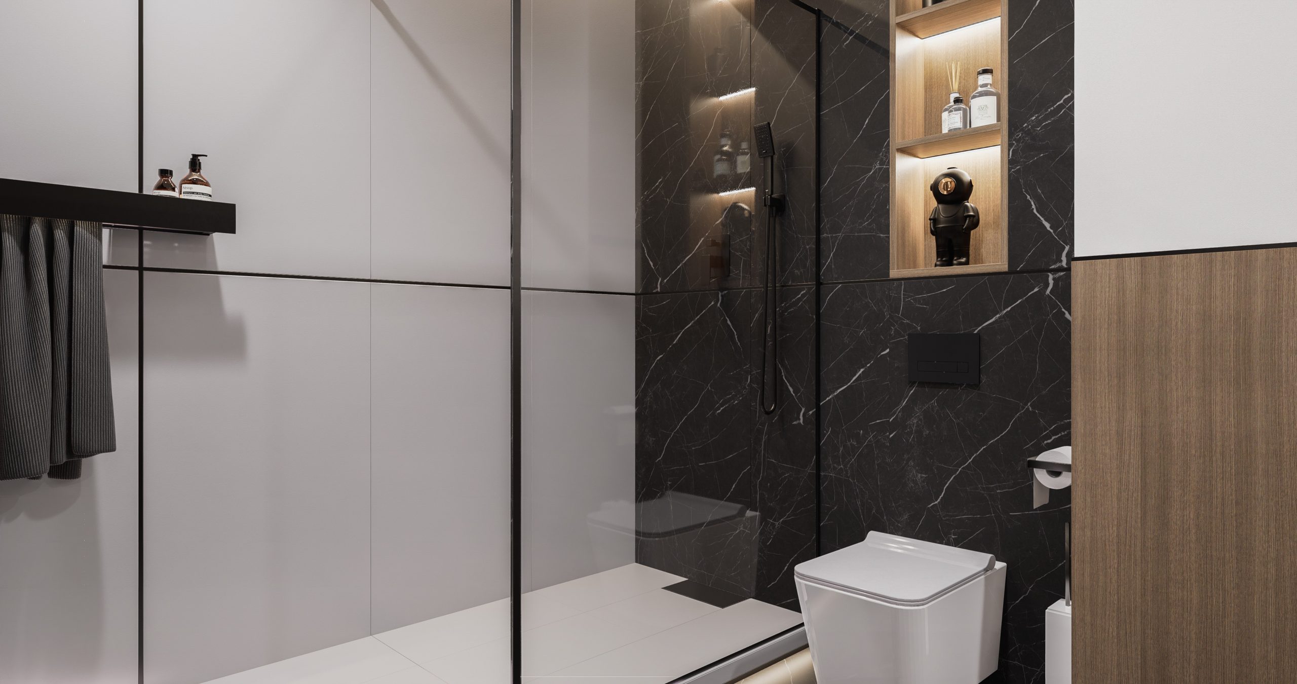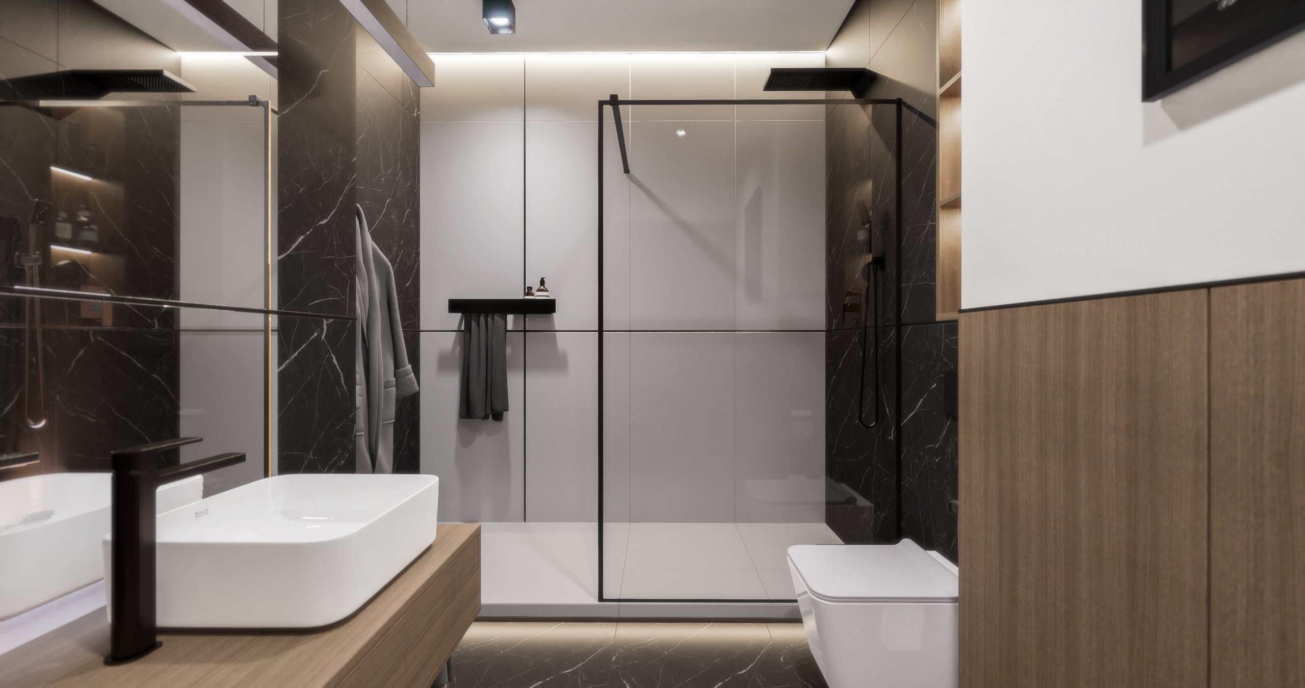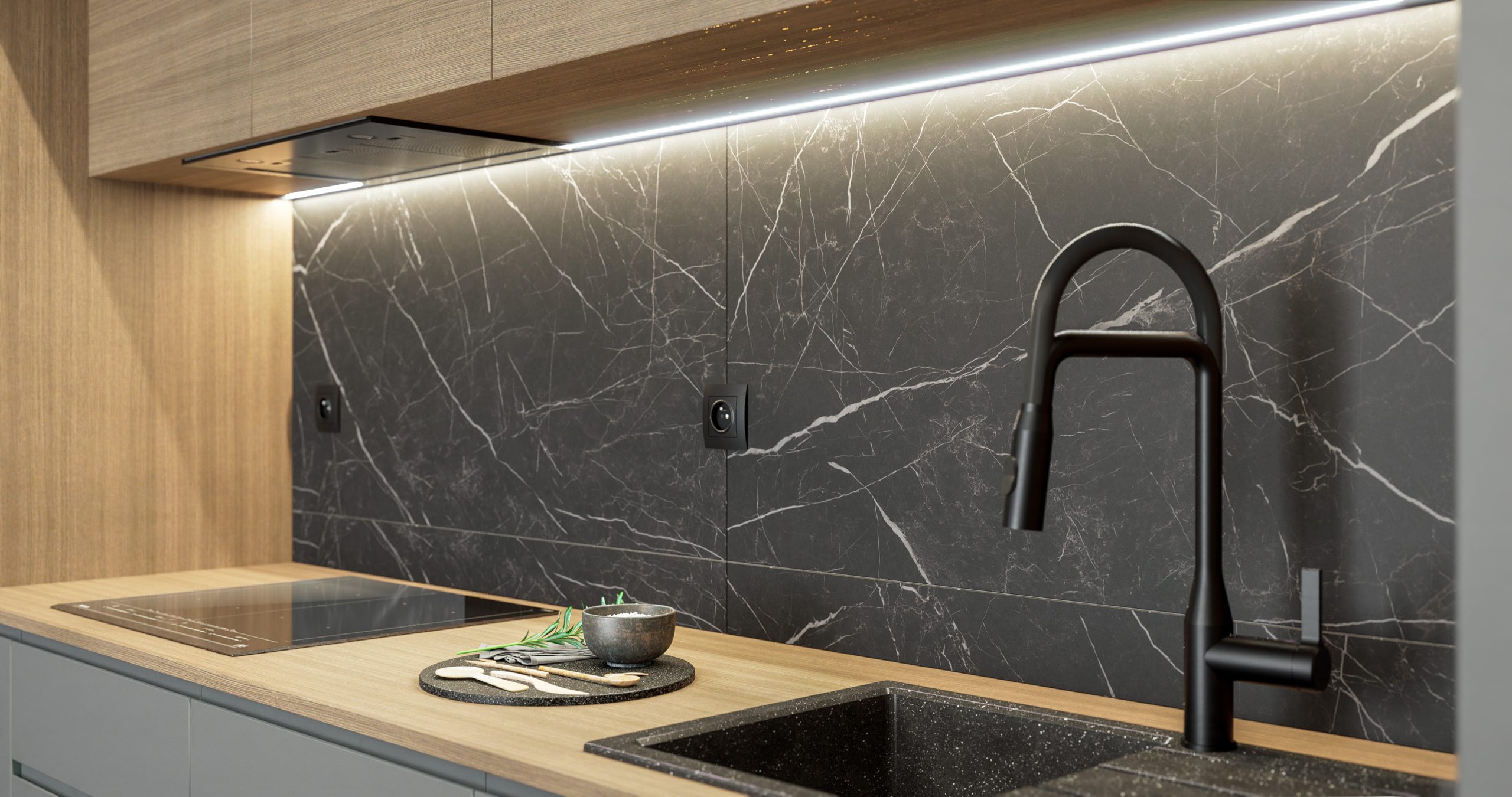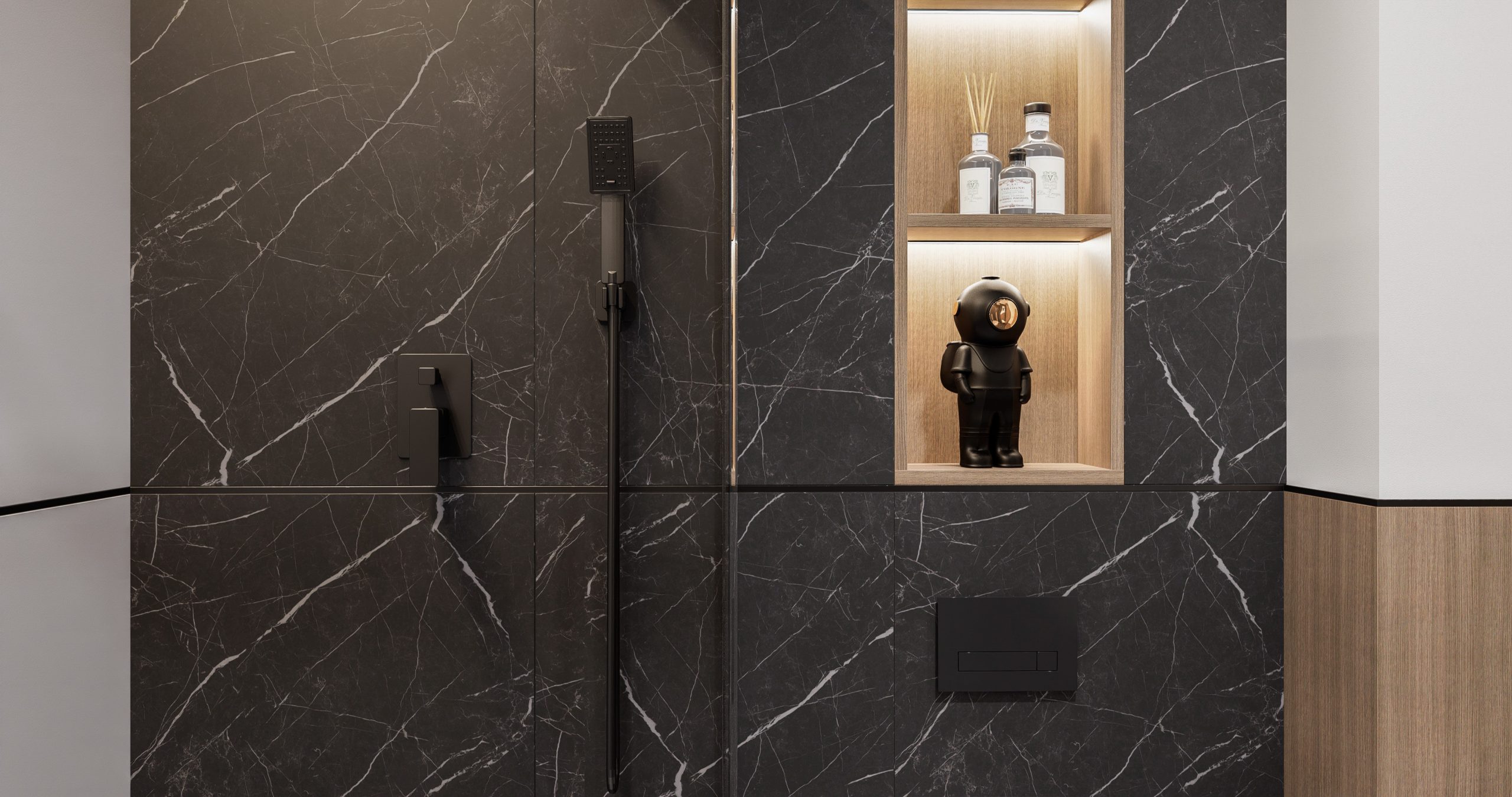 Dodatkowo, optymalne oświetlenie zostało skomponowane w taki sposób, aby podkreślić każdy element tej harmonijnej kompozycji. Jasne punkty świetlne uwydatniają strukturę czarnego gresu, tworząc atmosferę pełną kontrastów i elegancji.