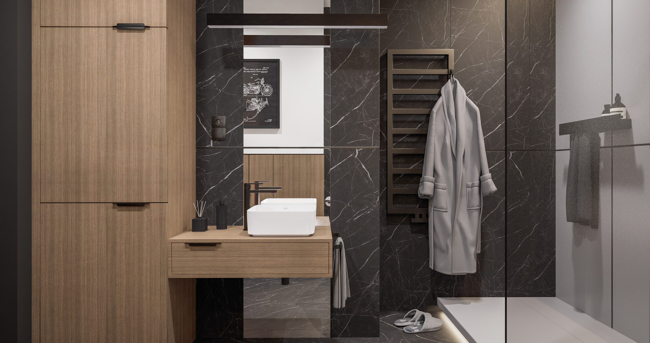 Łazienka, będąca emanacją nowoczesnego stylu loft, przykuwa uwagę swoją surowością i niepowtarzalnym klimatem. W tej przestrzeni każdy element został starannie dobrany, aby stworzyć unikalną harmonię. Każdy detal tej łazienki został starannie przemyślany, aby osiągnąć idealną równowagę między funkcjonalnością a estetyką. Nowoczesne elementy, takie jak designerska armatura czy minimalistyczne meble, doskonale współgrają z surowością klimatu loftowego.