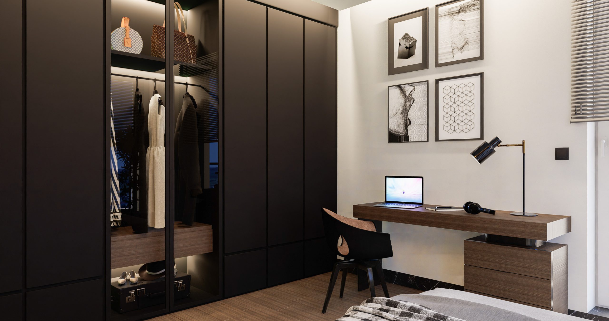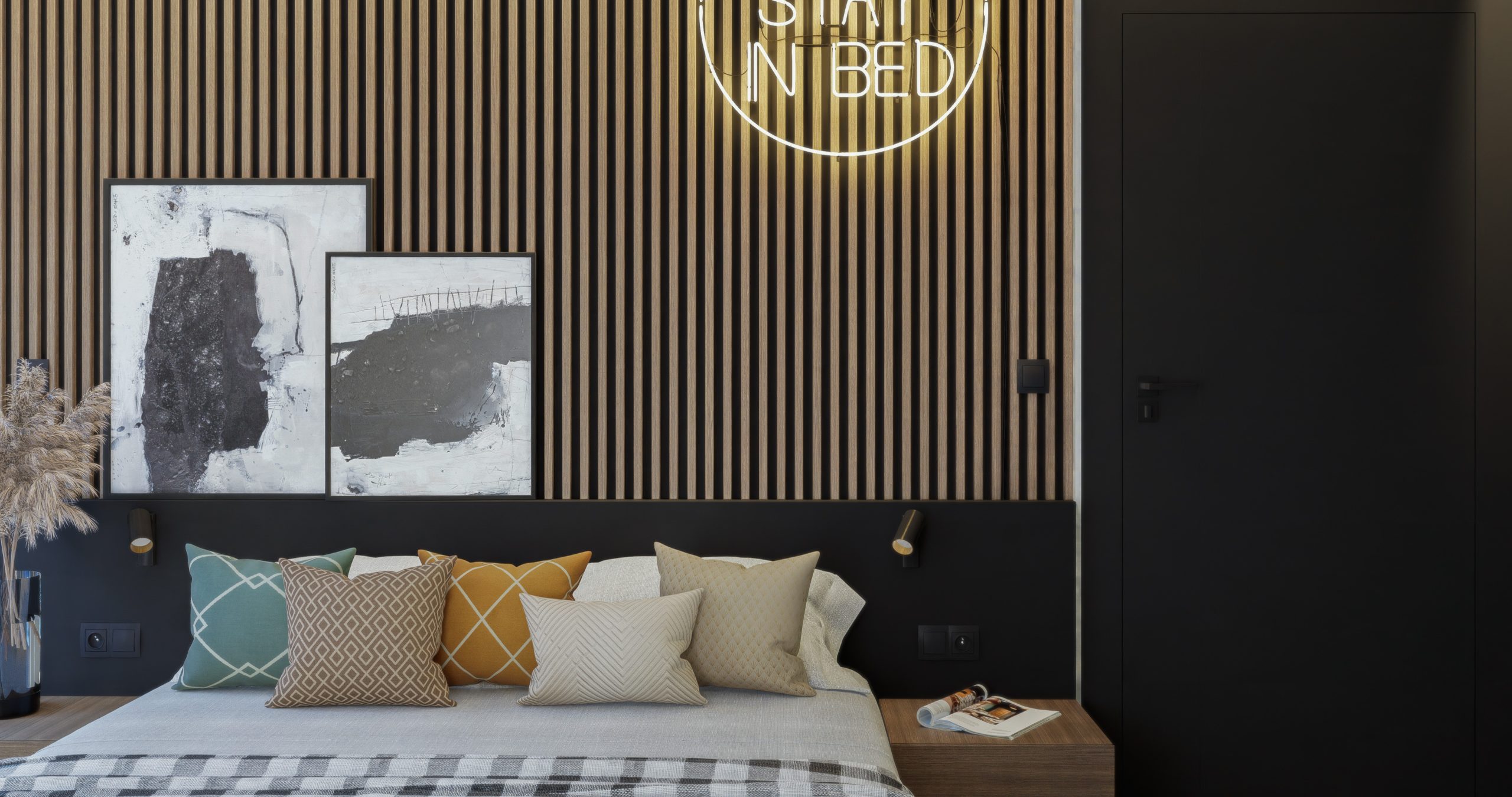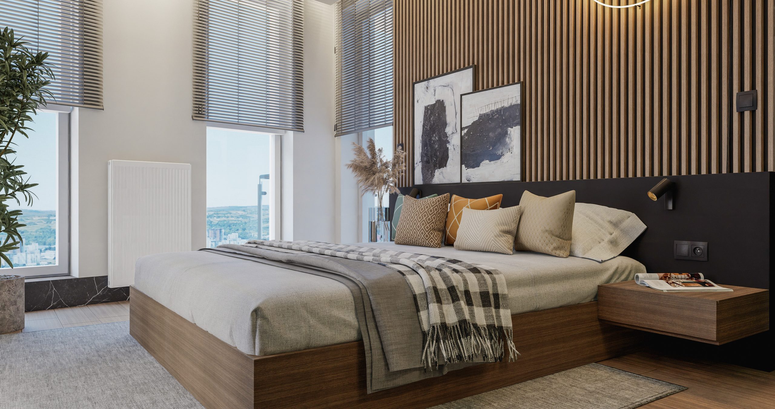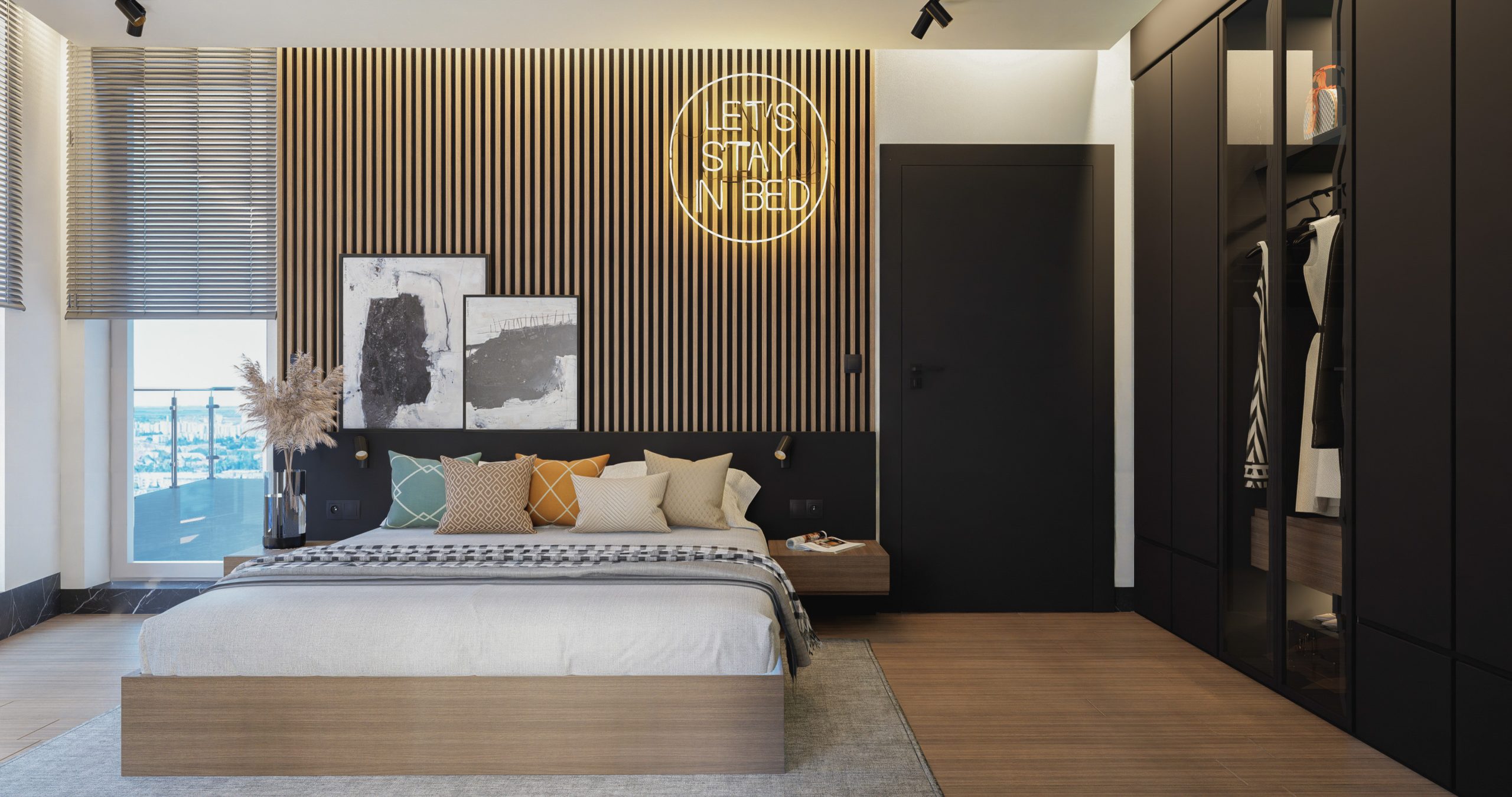 Sypialnia, będąca jednocześnie nowoczesna i przytulna, została zaaranżowana z myślą o funkcjonalności. Pojemna szafa, miejsce do pracy i ciemna zabudowa meblowa kontrastująca z jasną przeciwległą ścianą tworzą harmonijne wnętrze. Prosta, lecz efektowna ściana za łóżkiem, z lamelami na czarnym tle, uzupełniona fenomenalnym oświetleniem LED, nadaje pomieszczeniu niepowtarzalnego charakteru.