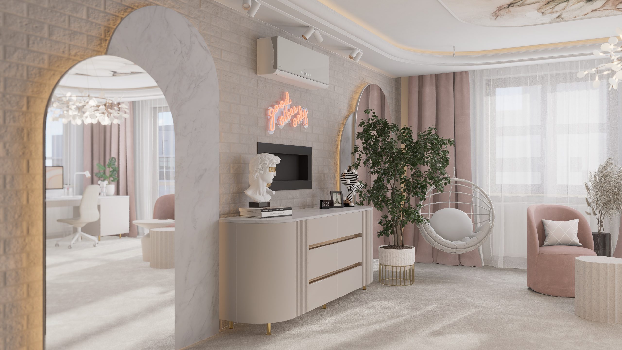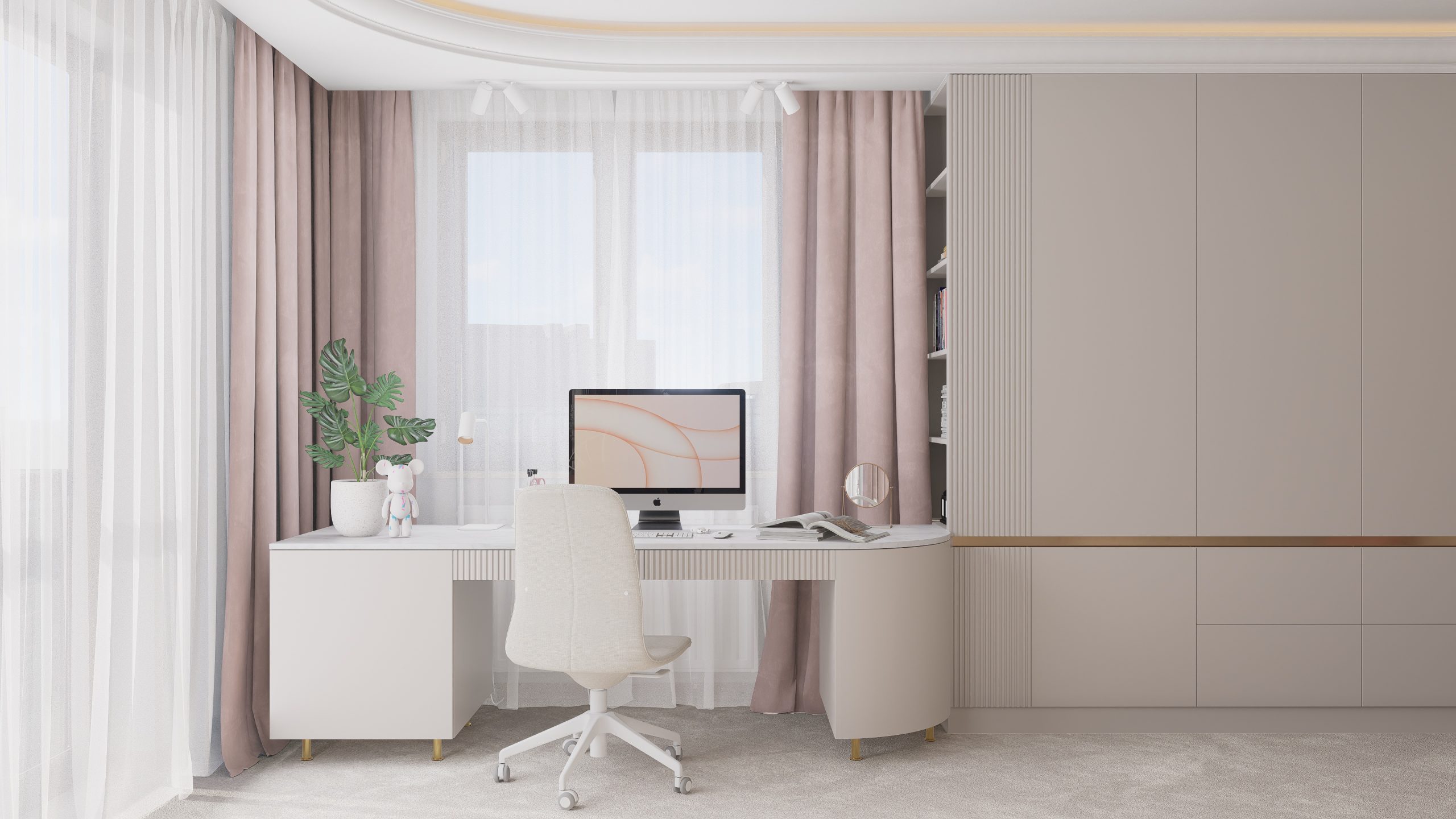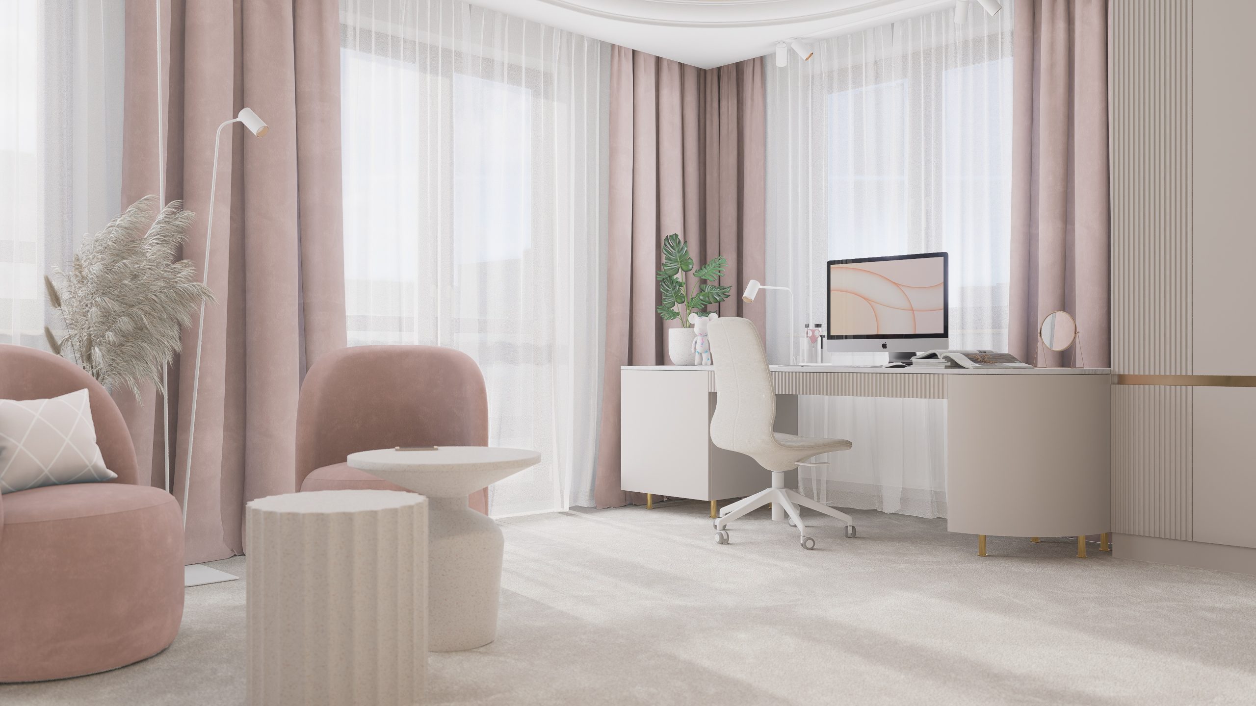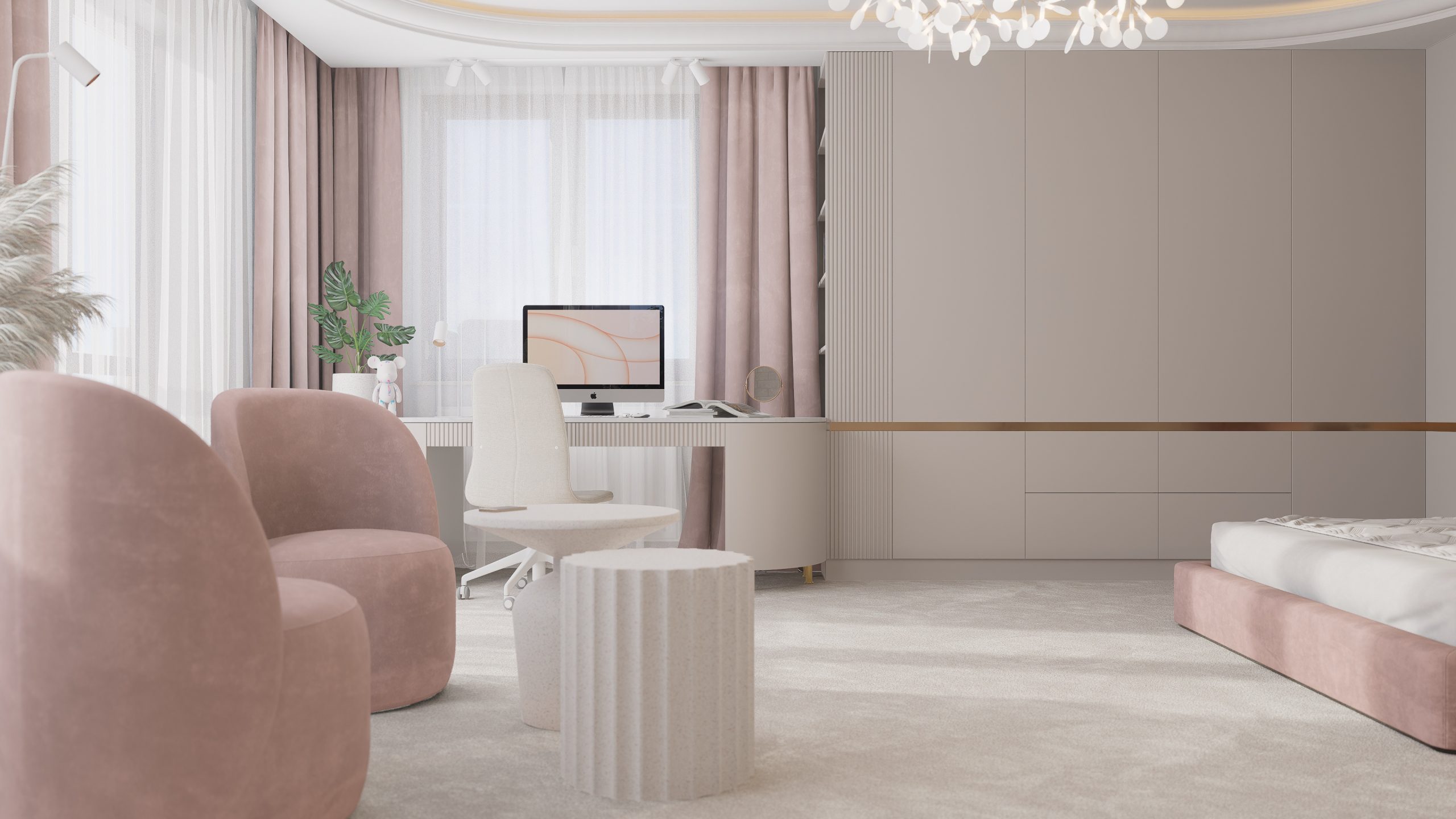 Podstawą całego projektu stała się zgrana paleta barw, obejmująca delikatne odcienie beżu, kaszmiru oraz pudrowego różu, które nadały projektowanej przestrzeni delikatny i dziewczęcy charakter.
