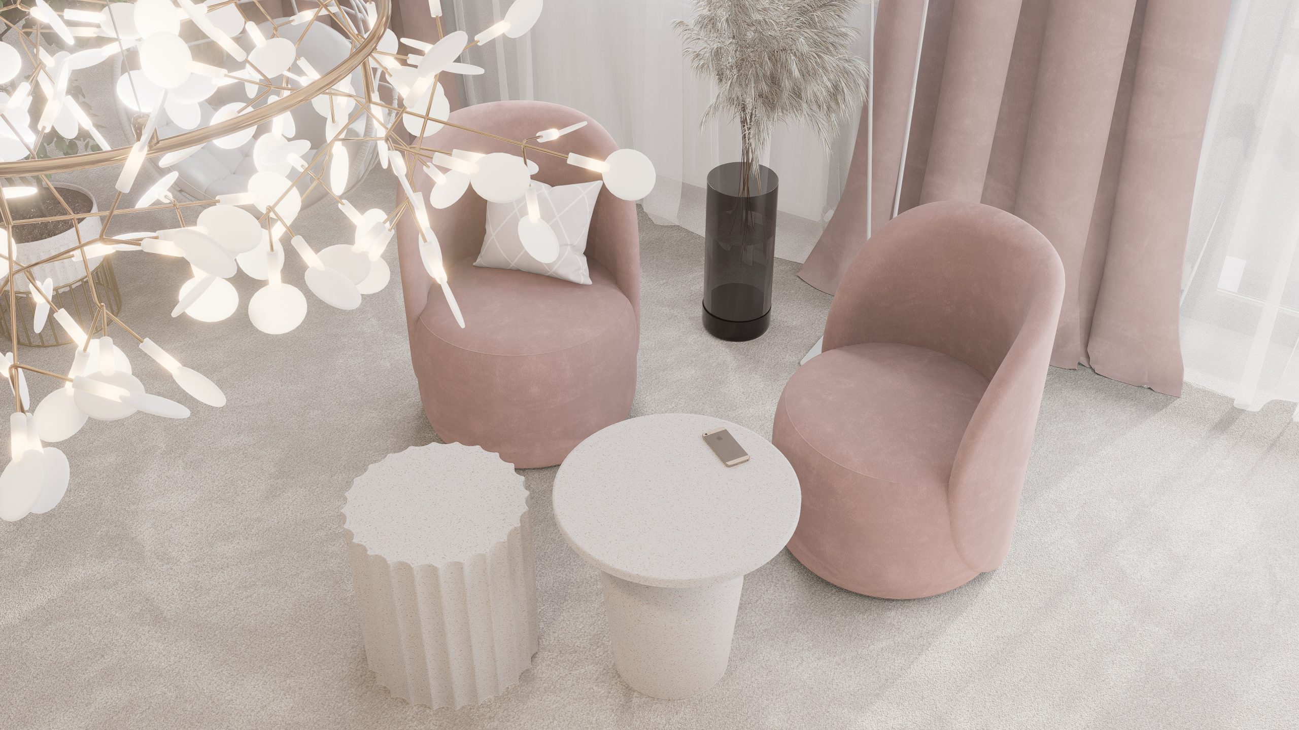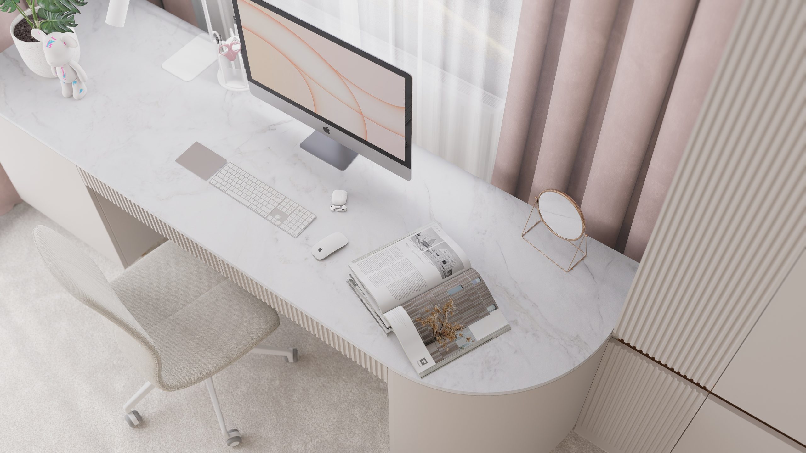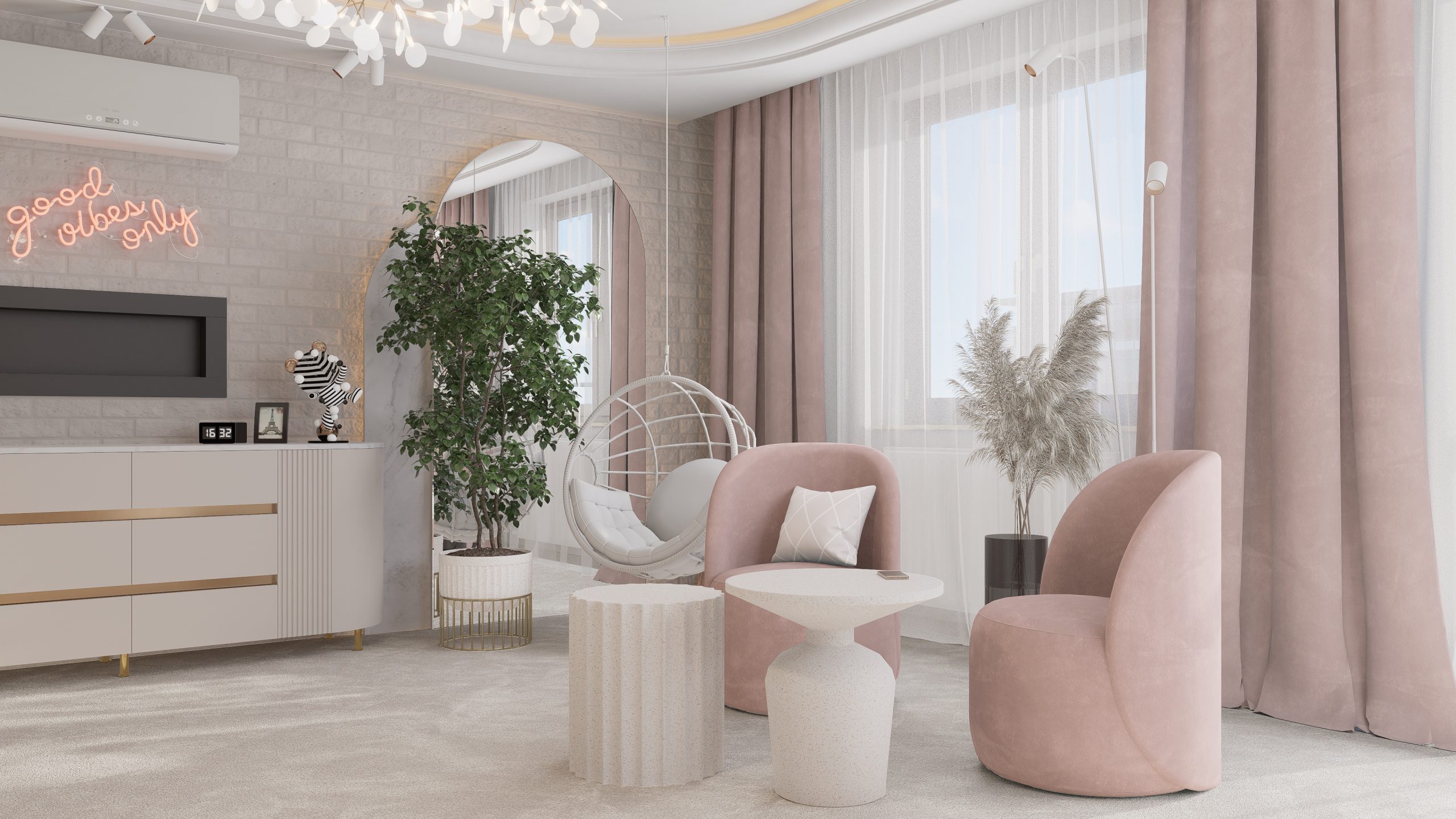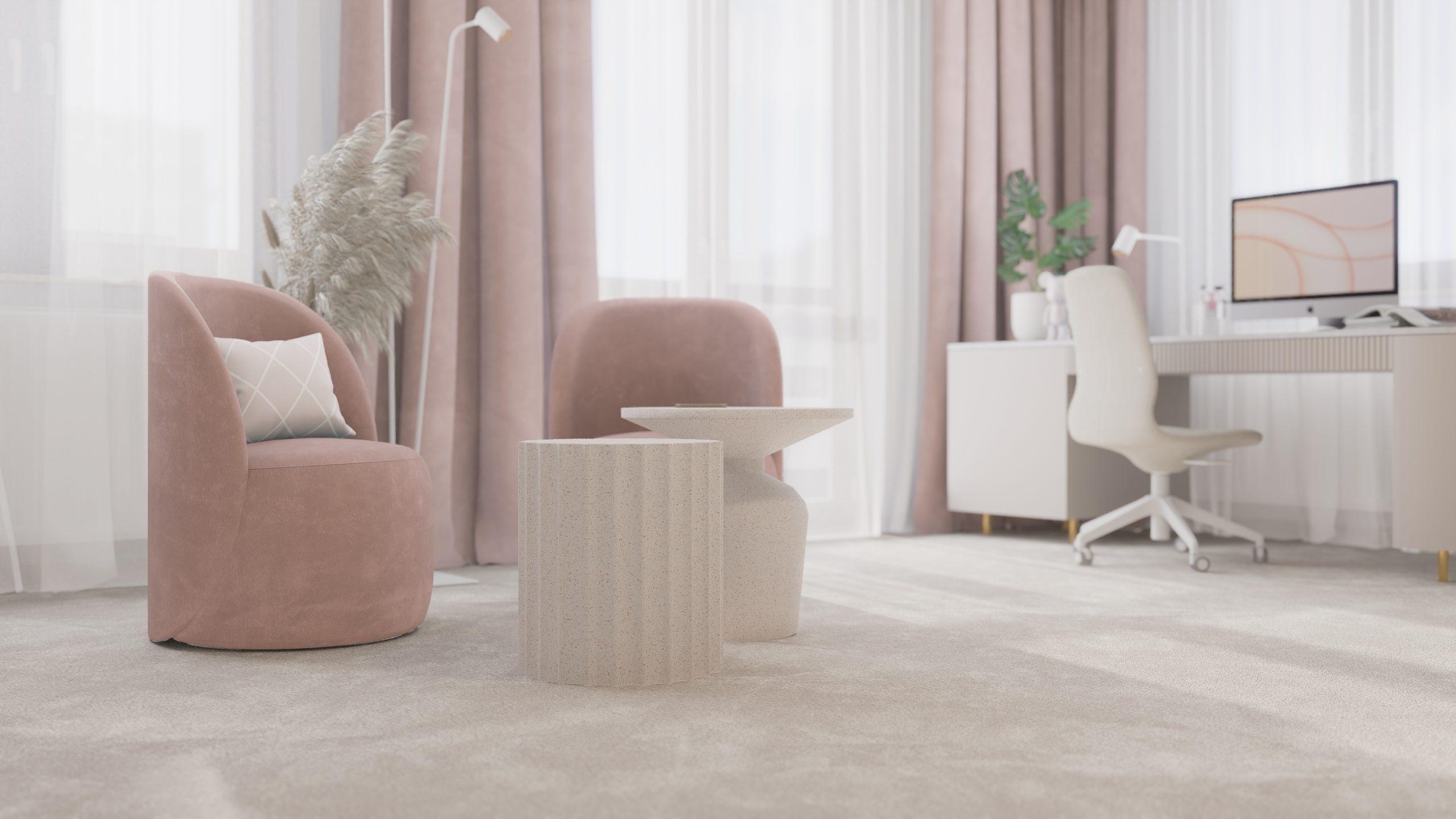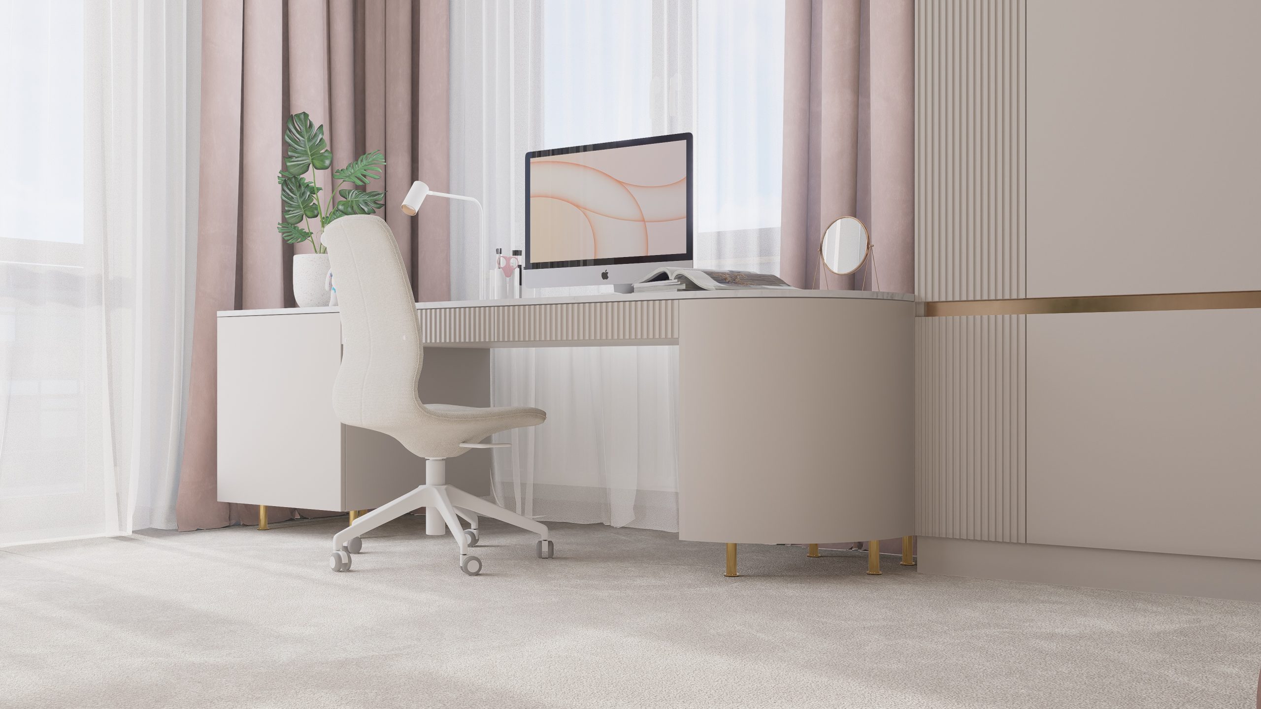 Podstawą całego projektu stała się zgrana paleta barw, obejmująca delikatne odcienie beżu, kaszmiru oraz pudrowego różu, które nadały projektowanej przestrzeni delikatny i dziewczęcy charakter.