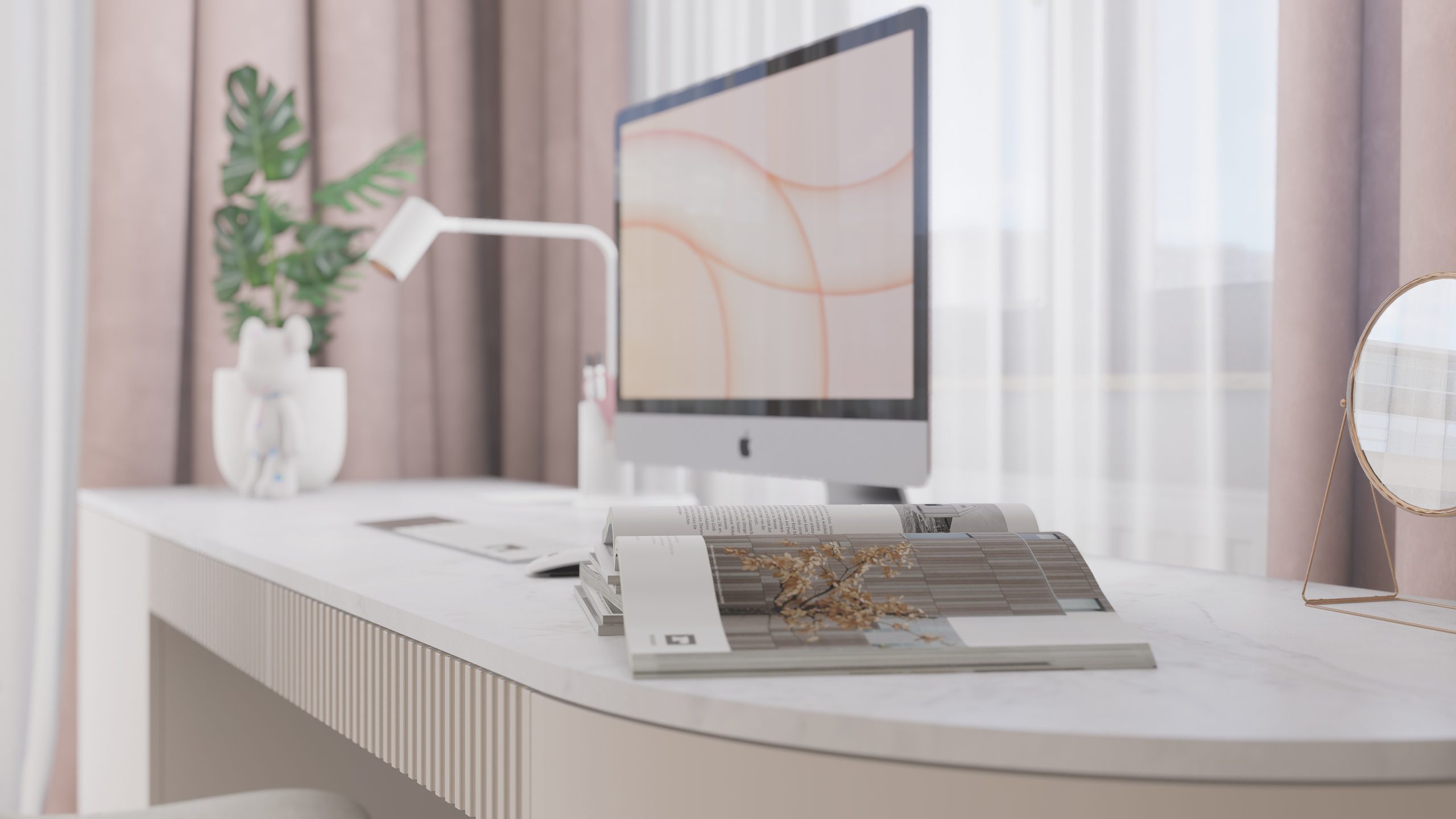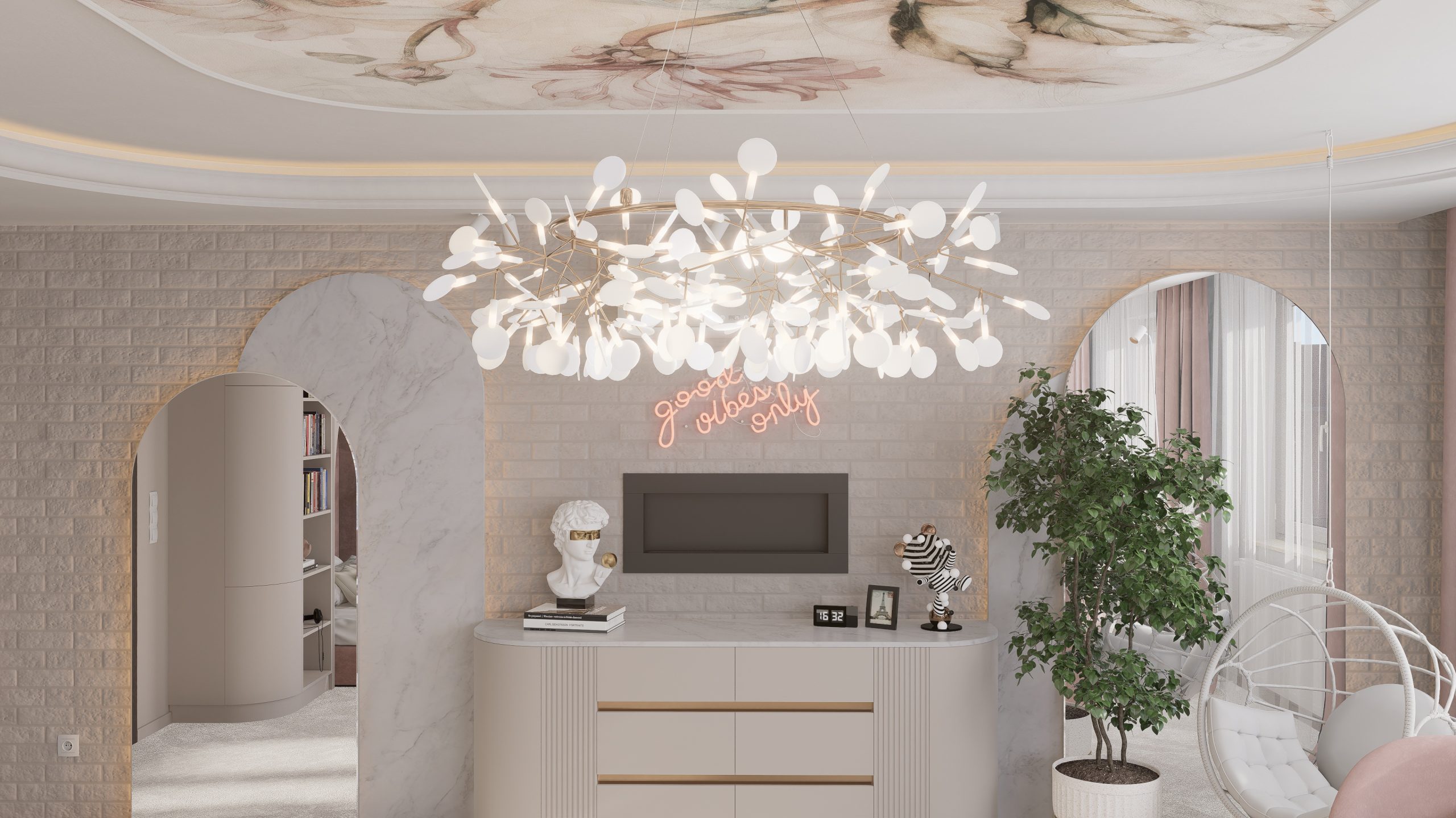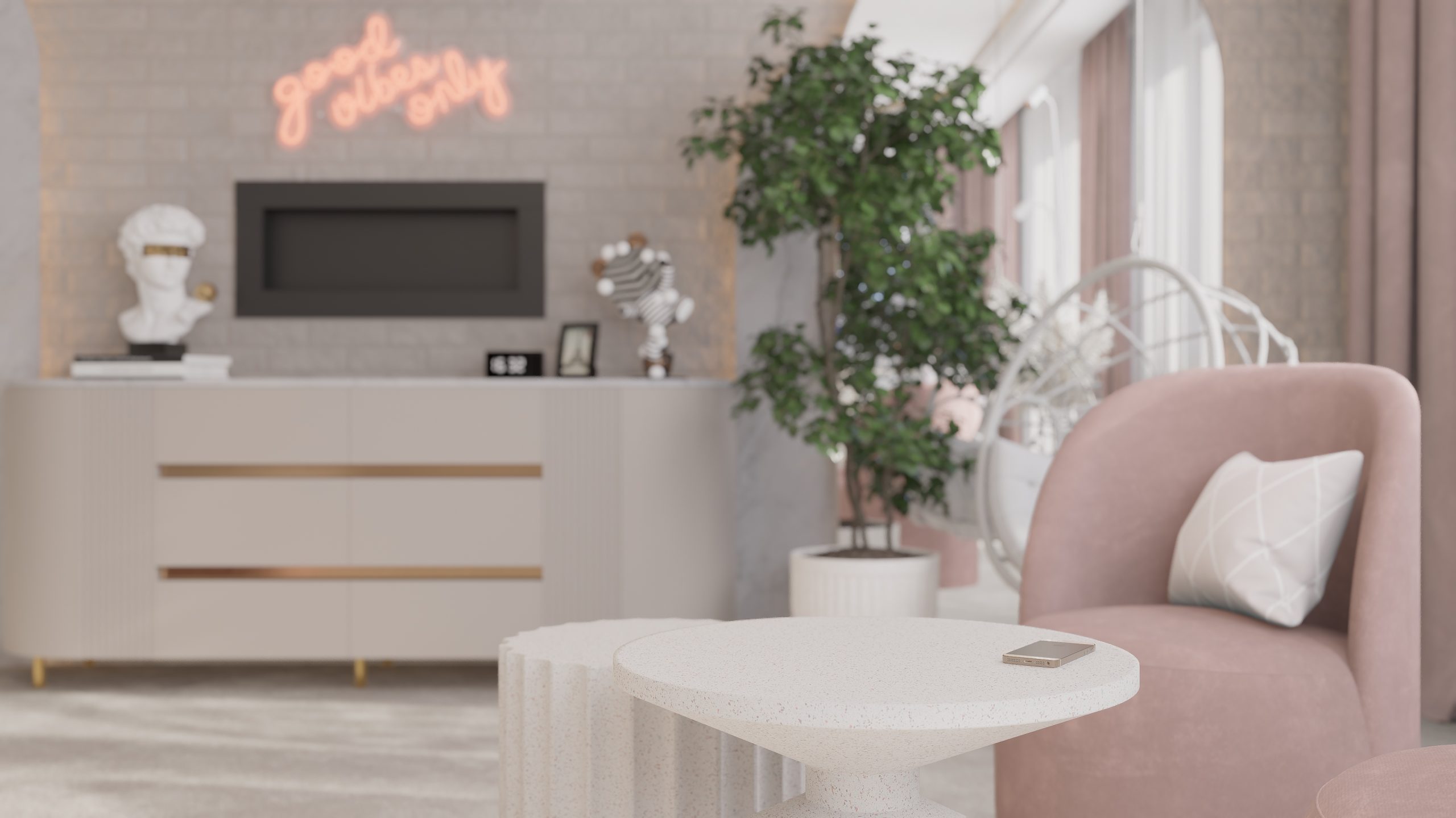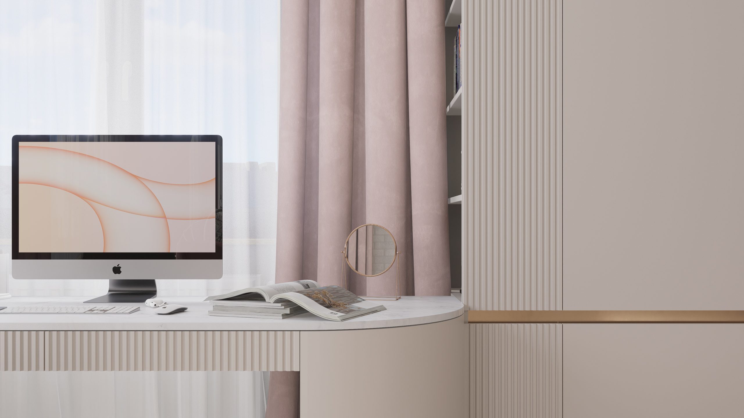 Podstawą całego projektu stała się zgrana paleta barw, obejmująca delikatne odcienie beżu, kaszmiru oraz pudrowego różu, które nadały projektowanej przestrzeni delikatny i dziewczęcy charakter.