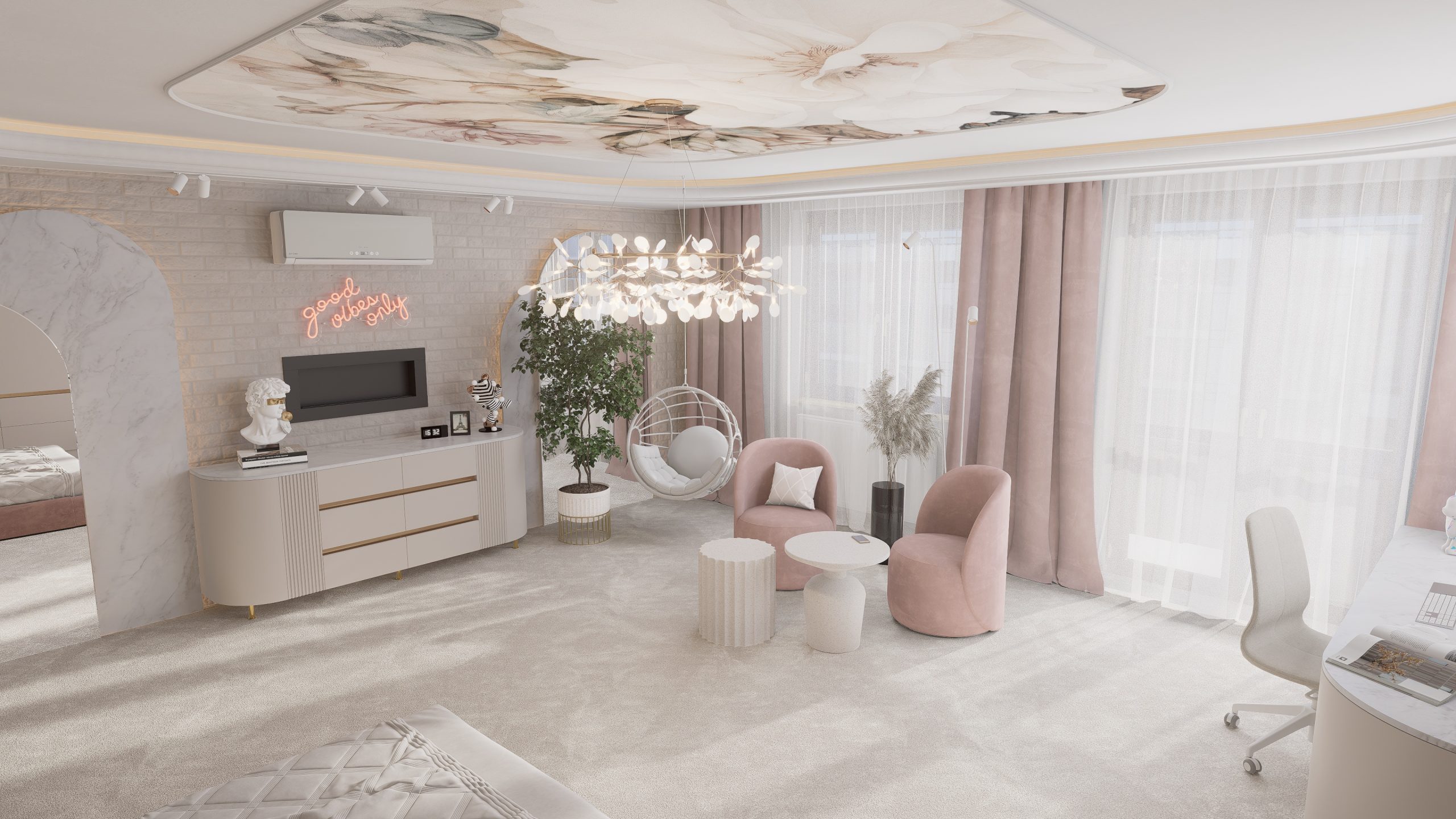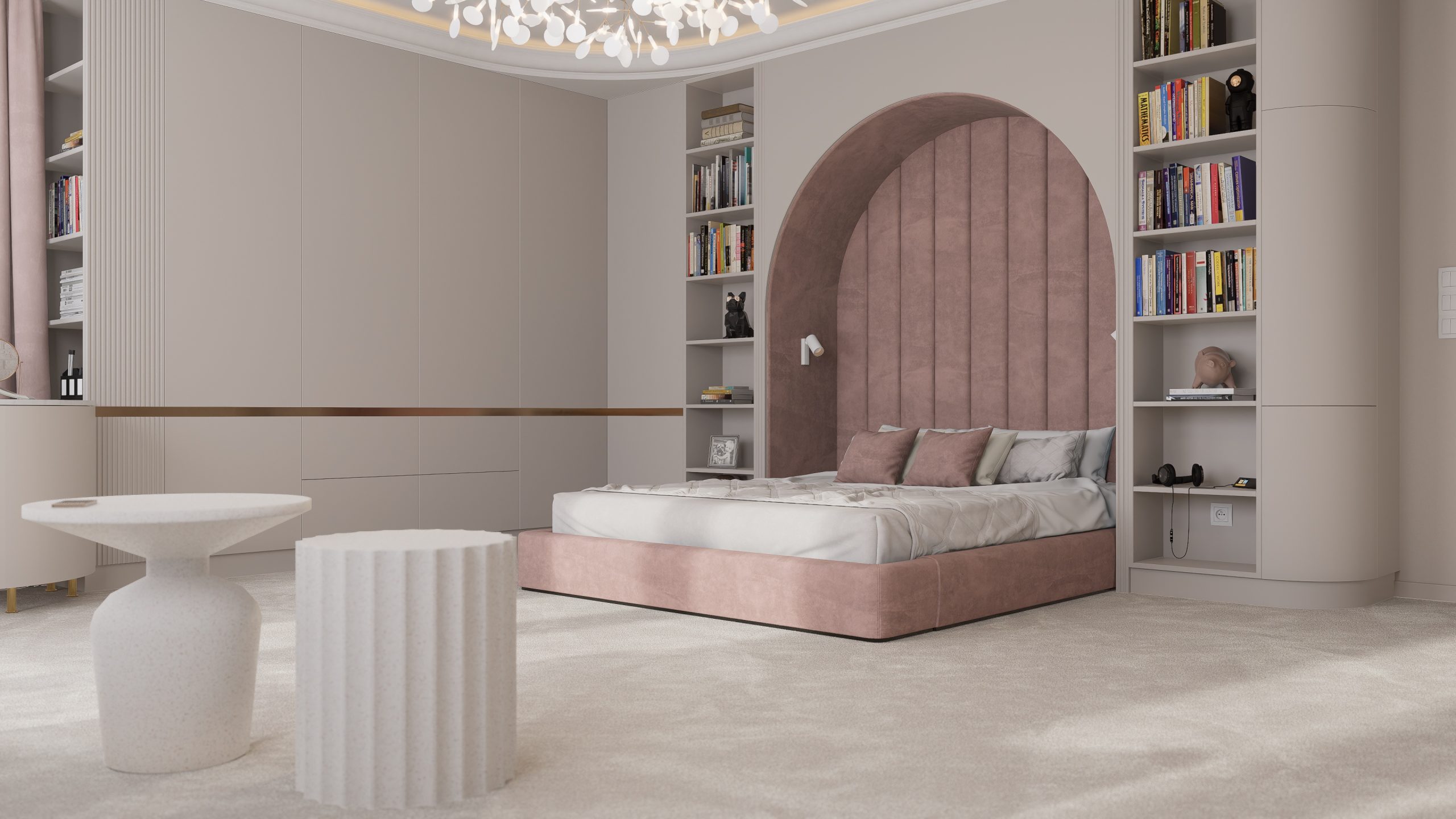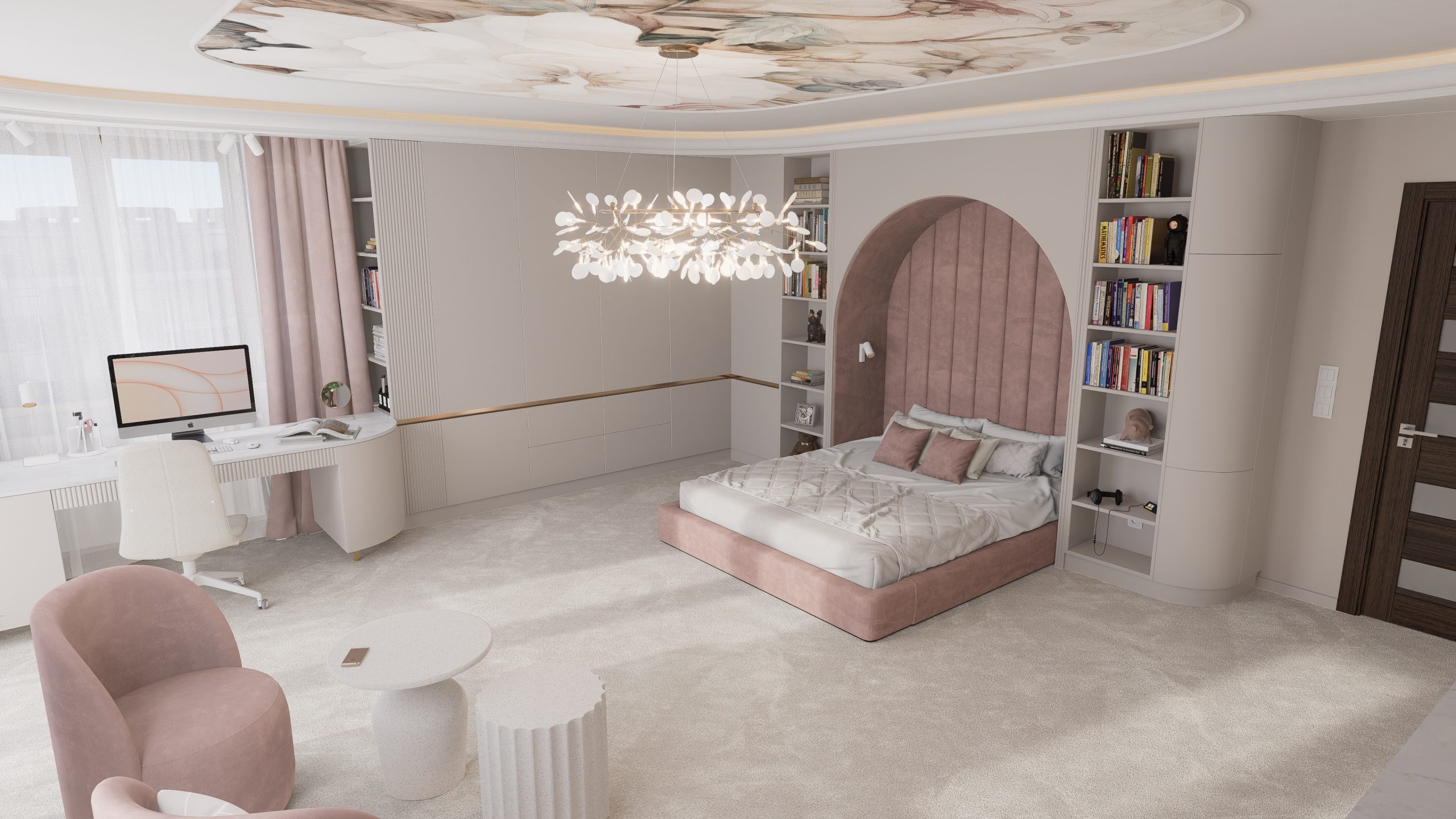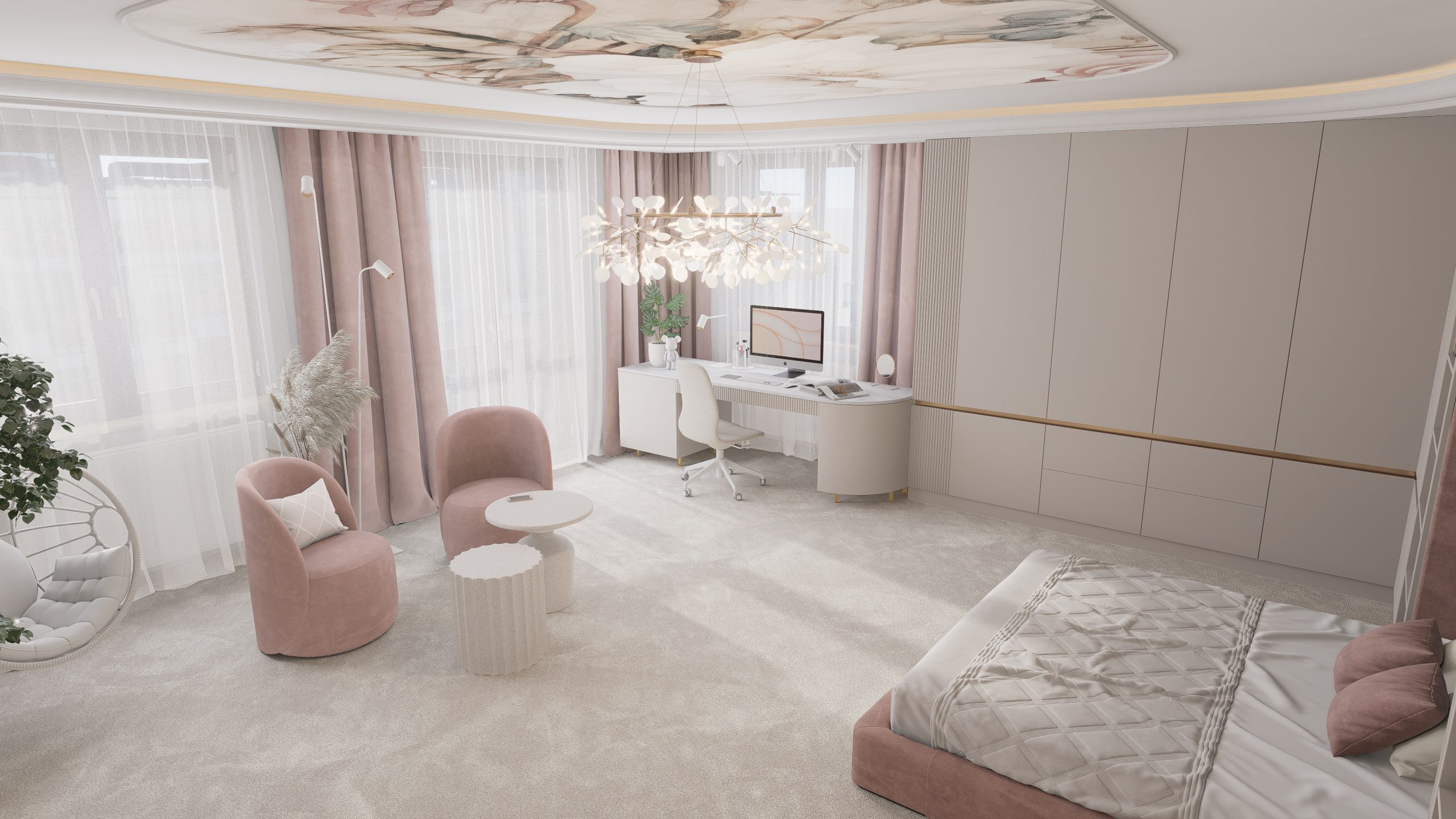 Tworząc pełną elegancji sypialnię dla nastolatki postawiłem na subtelne połączenie stonowanych, pastelowych kolorów, mających na celu wykreowanie atmosfery przytulnej i inspirującej.
