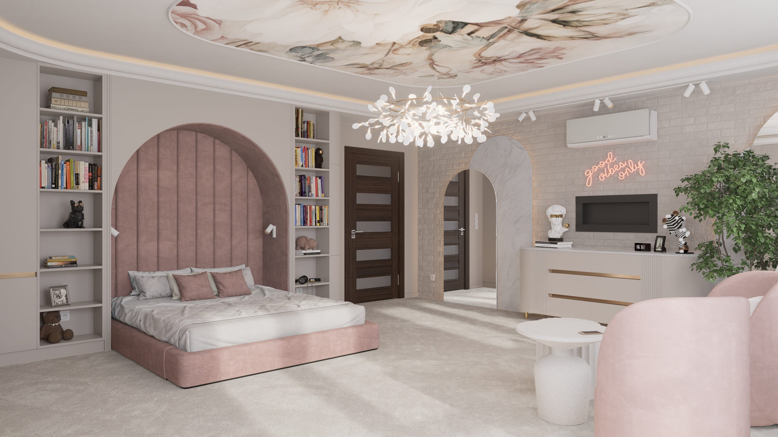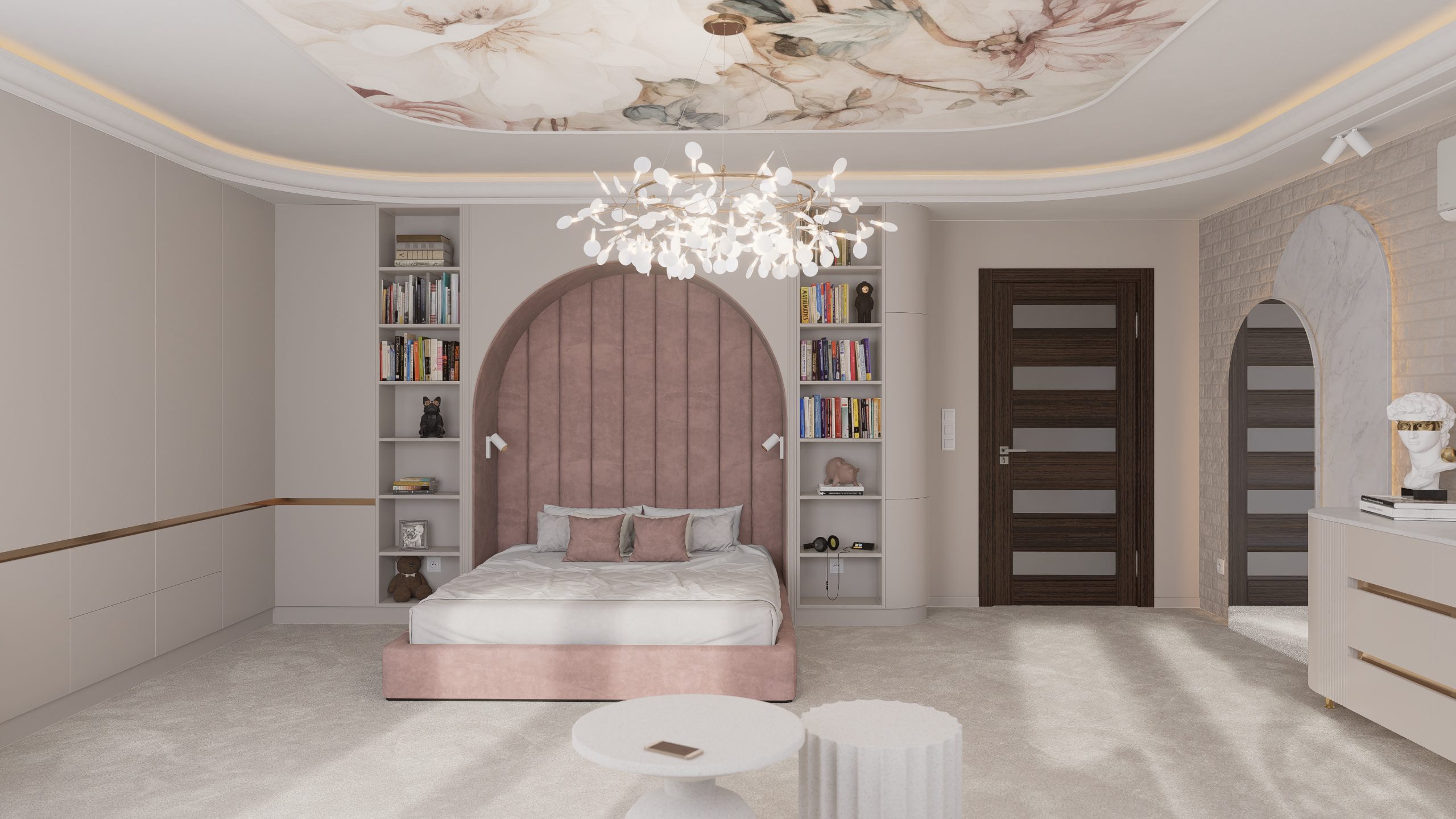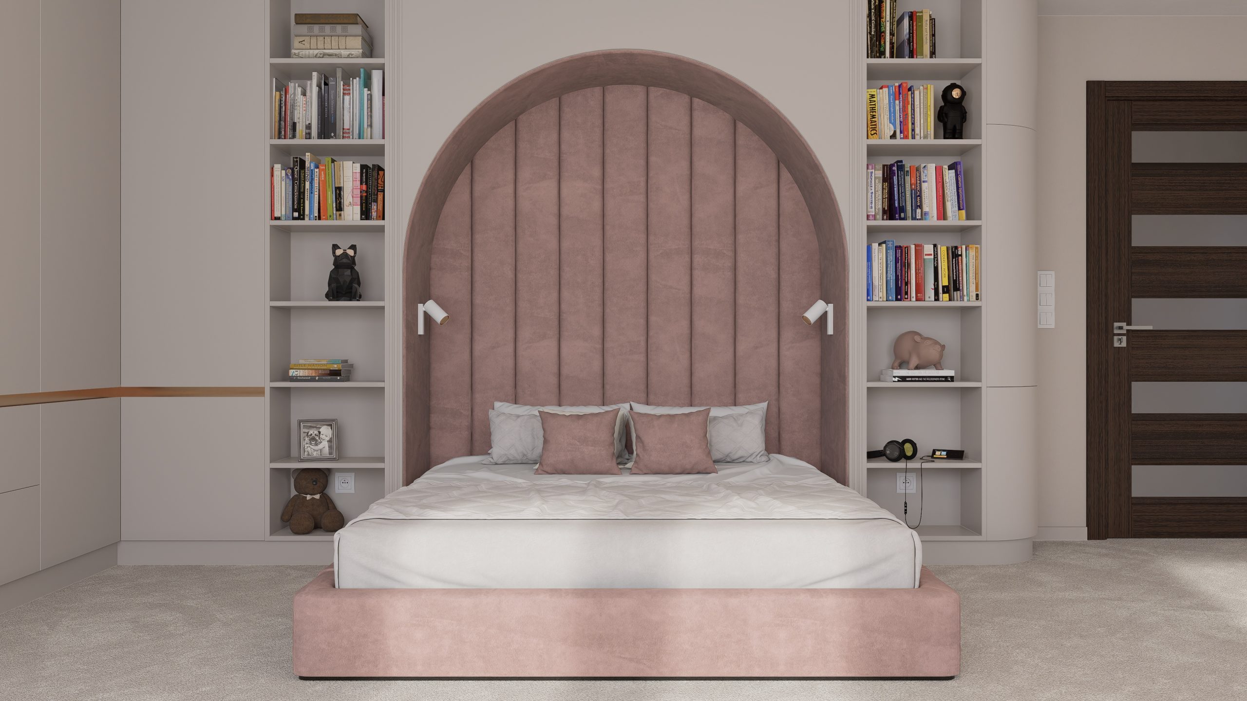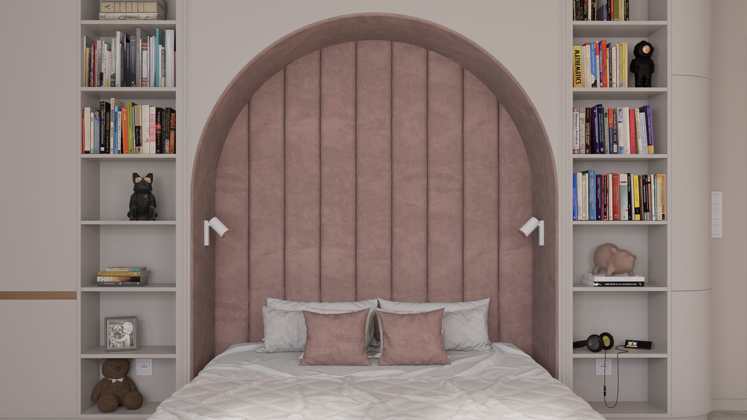 Tworząc pełną elegancji sypialnię dla nastolatki postawiłem na subtelne połączenie stonowanych, pastelowych kolorów, mających na celu wykreowanie atmosfery przytulnej i inspirującej.