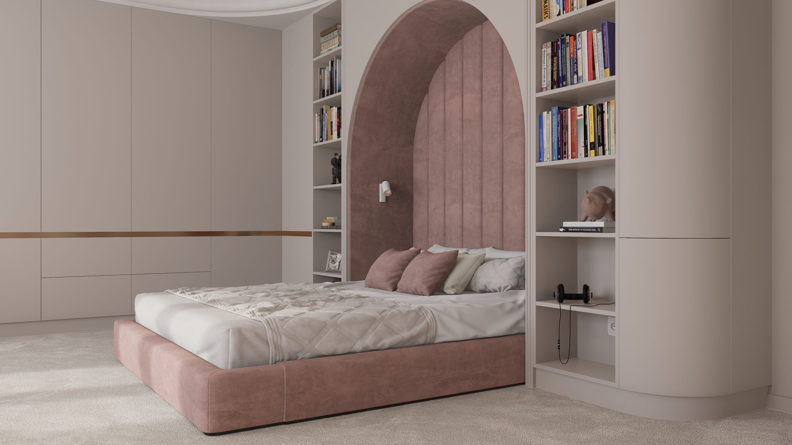 Głównym elementem kompozycji jest piękne tapicerowane łóżko z fantastycznym zagłówkiem, harmonijnie zintegrowane z zabudową meblową.