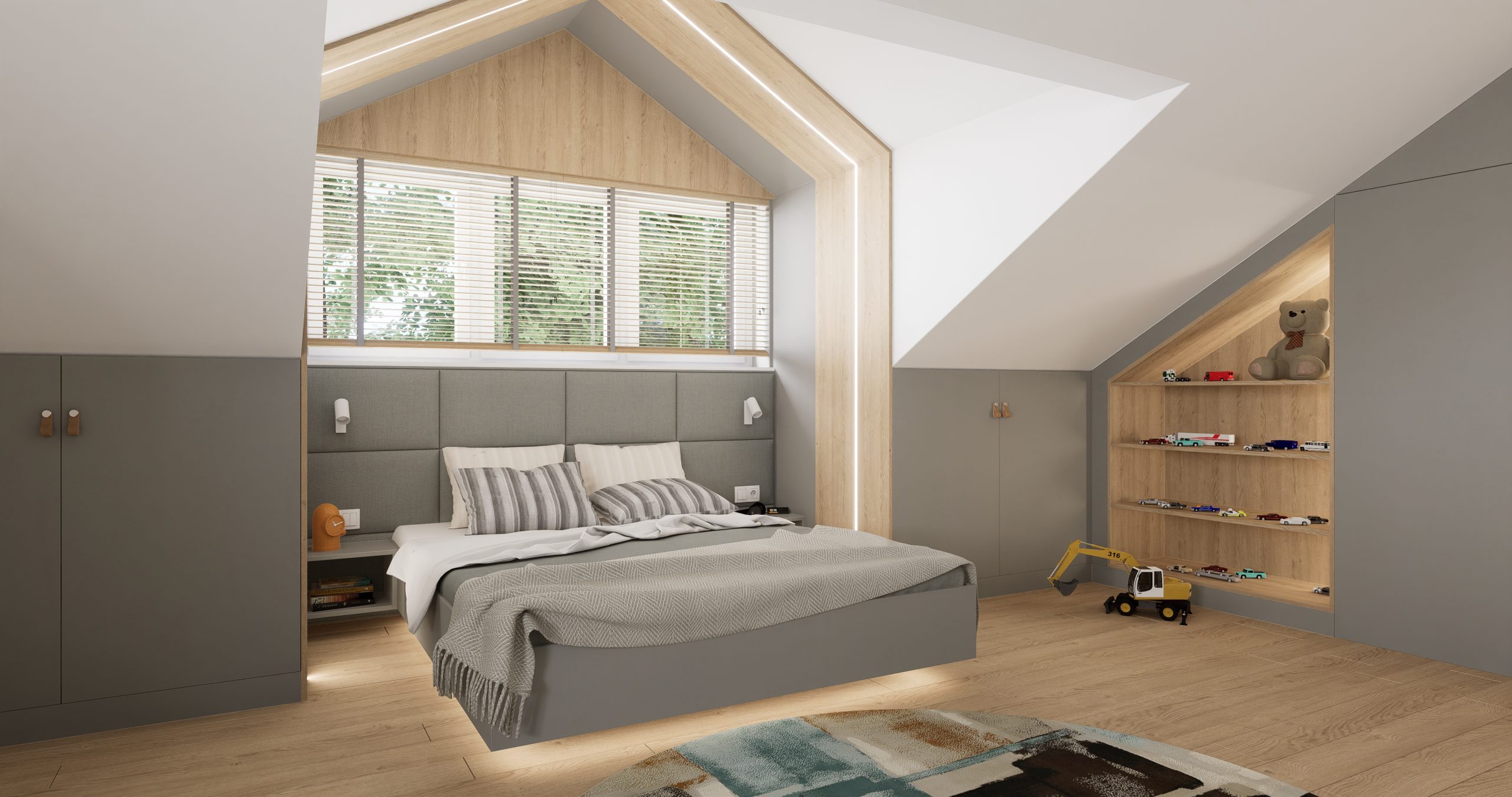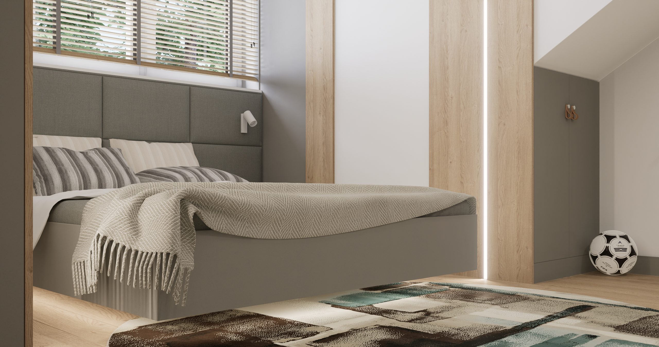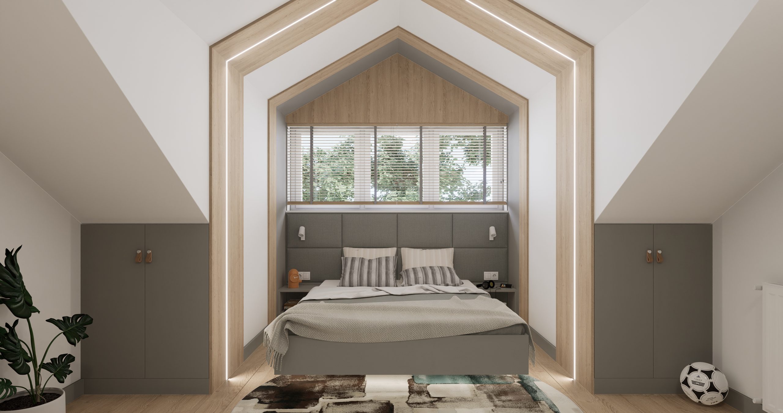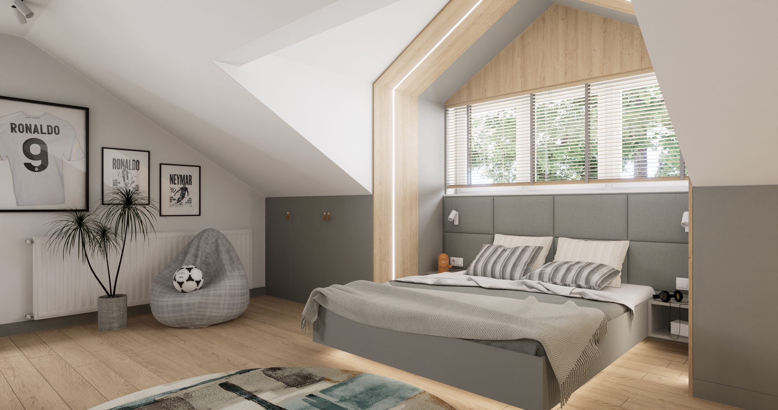 W projekcie wnętrza dwóch bliźniaczych sypialni, postawiłem na nowoczesny styl, gdzie szarości idealnie komponują się z jasnymi, ciepłymi odcieniami drewna. Pokoje na poddaszu z charakterystycznymi skosami zyskały nowe życie, stając się niepowtarzalnym azylem dla młodych piłkarskich entuzjastów.