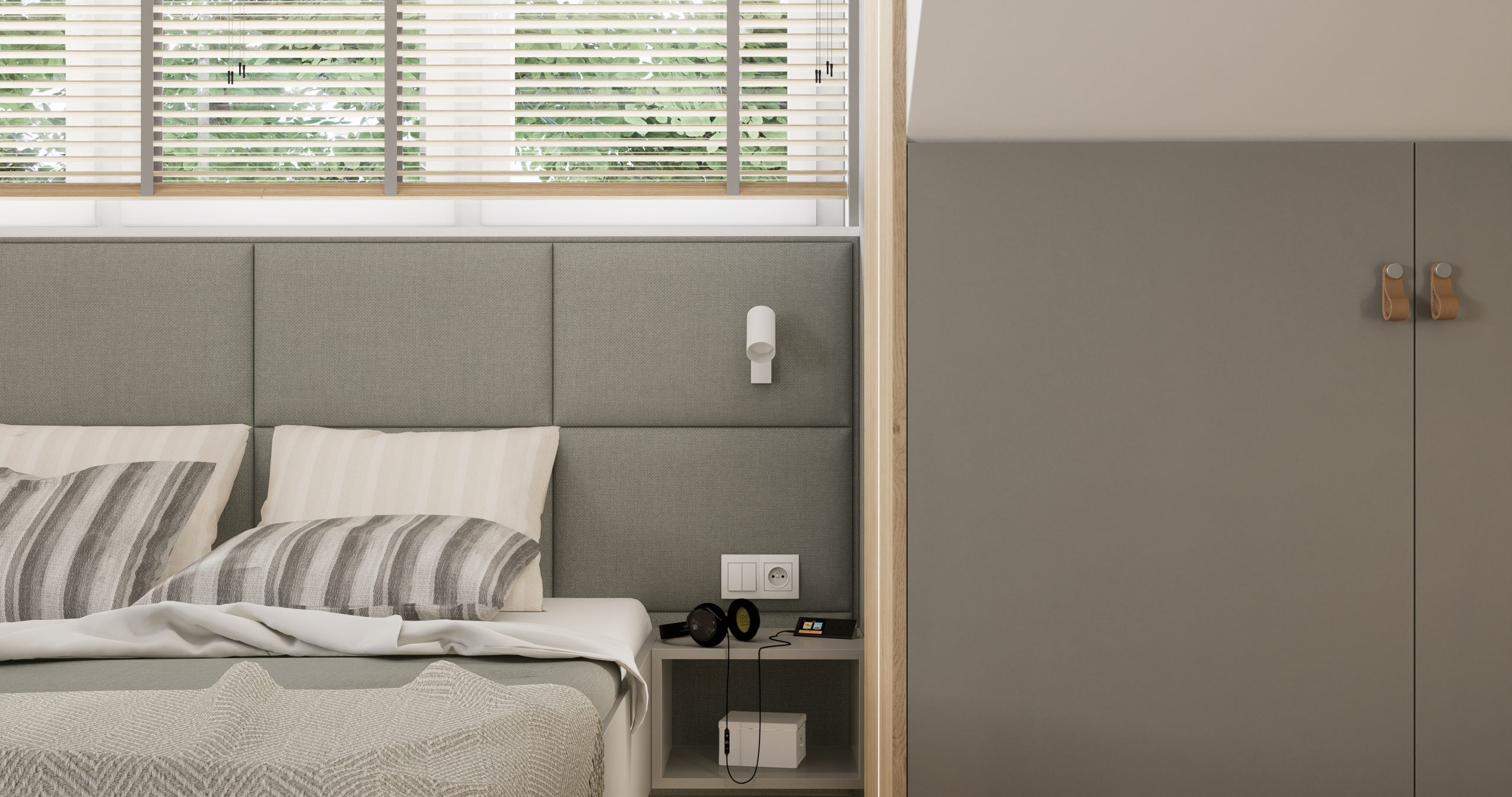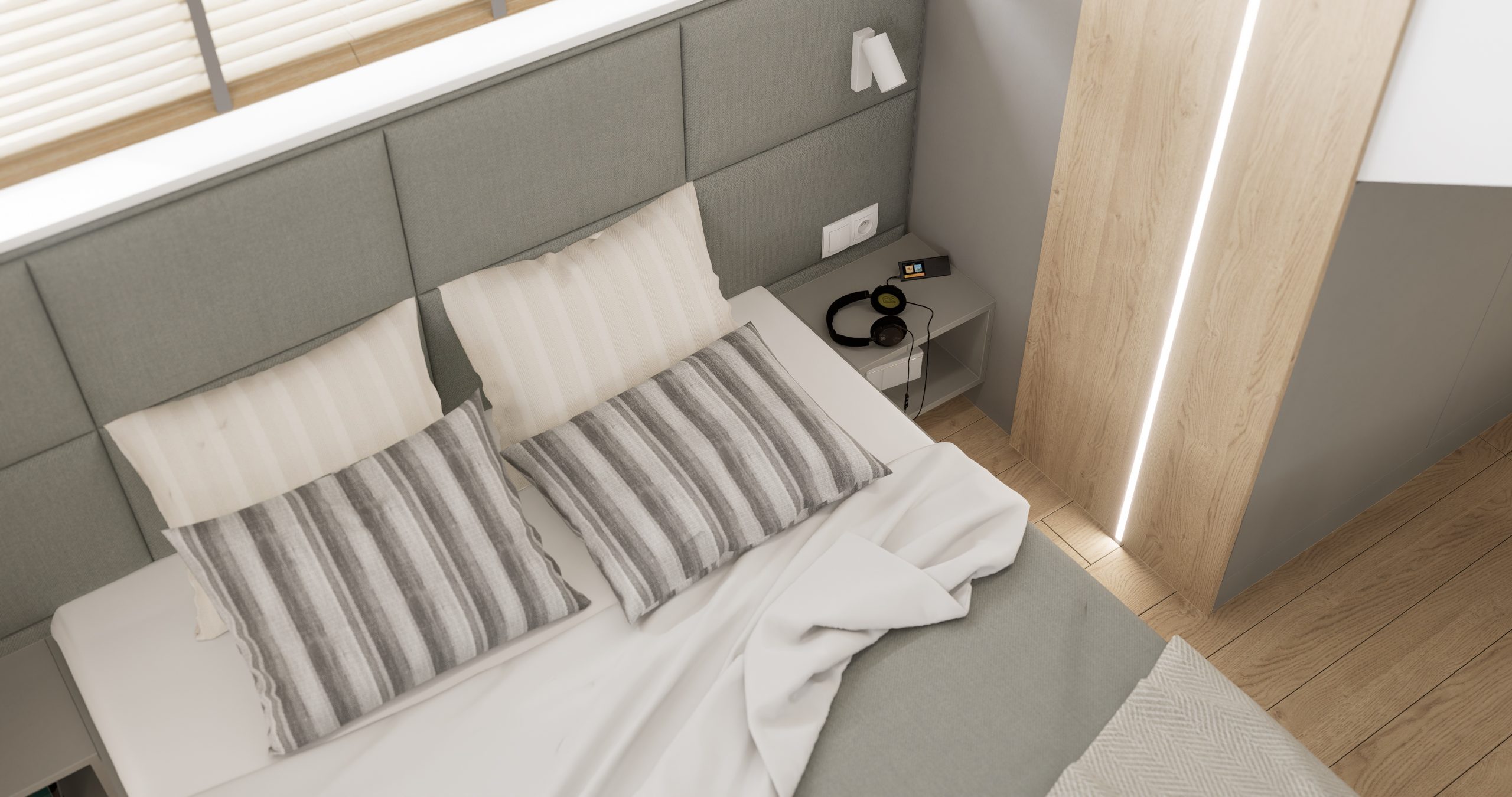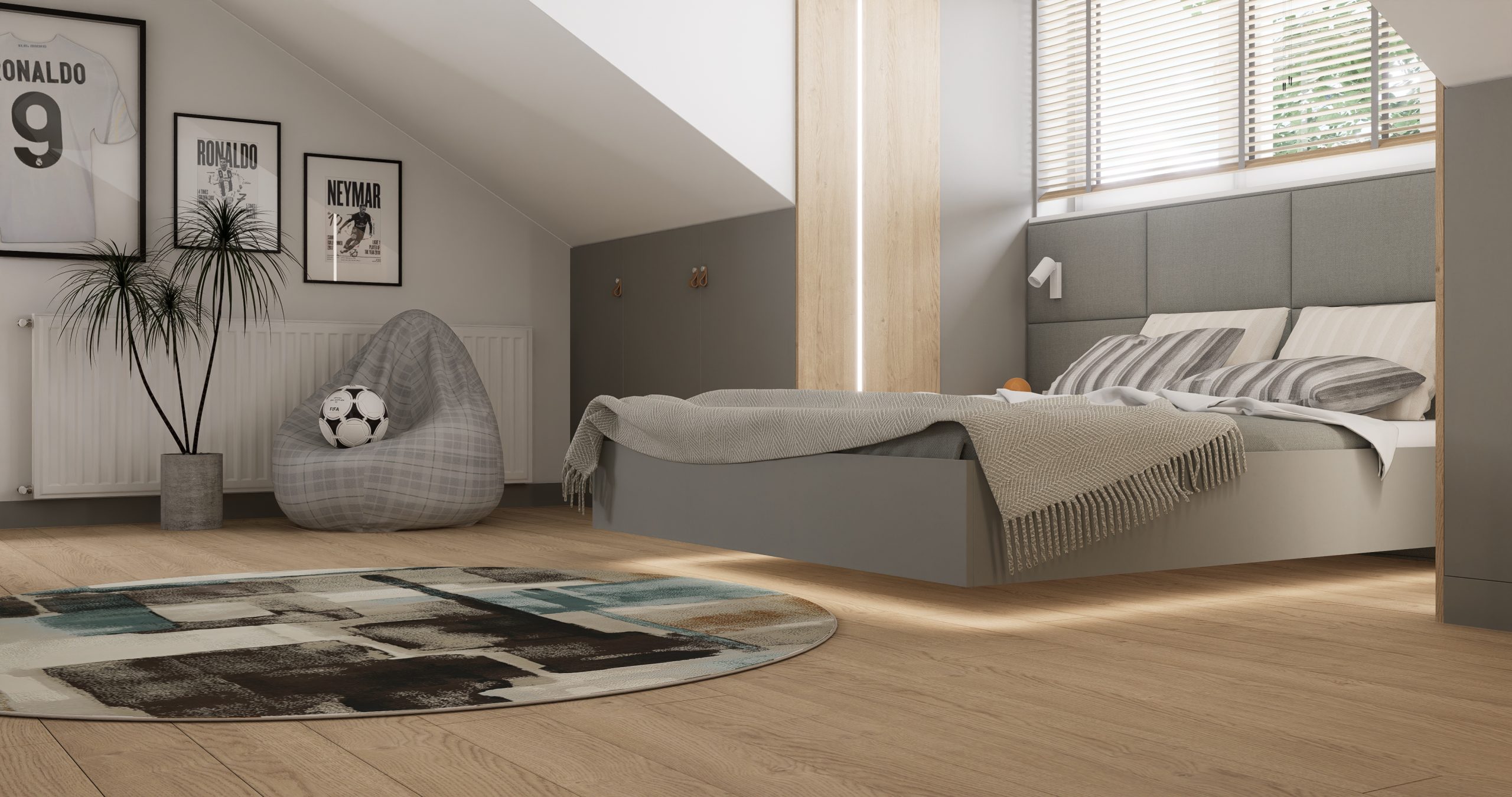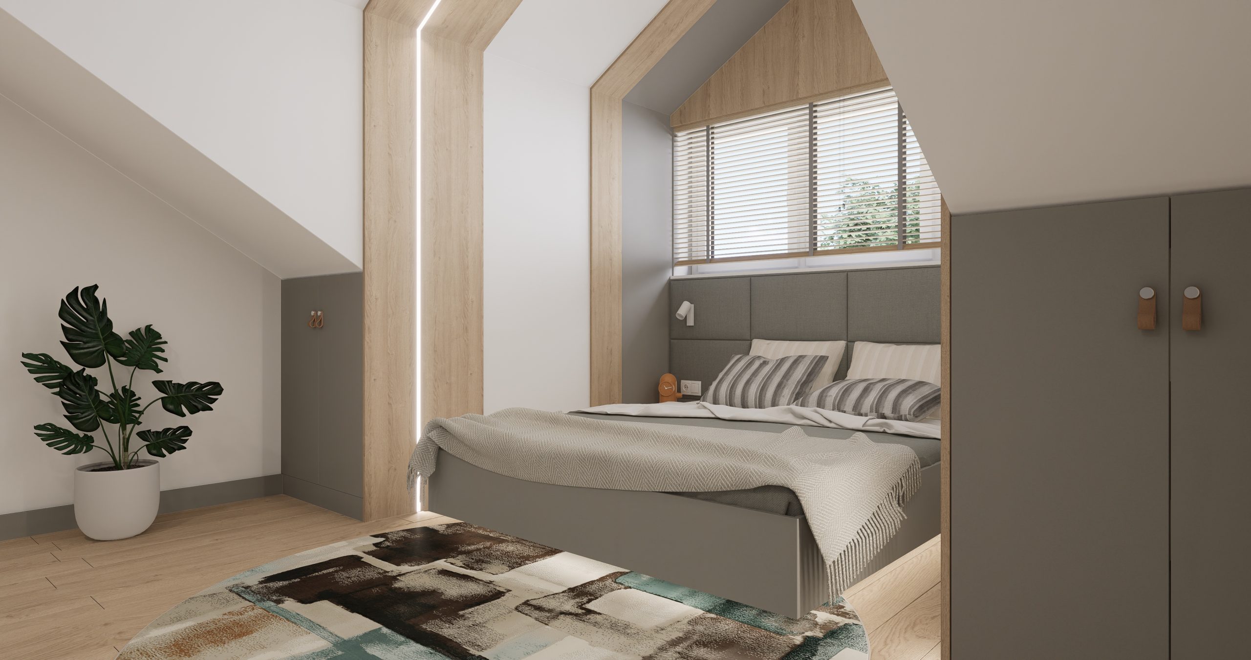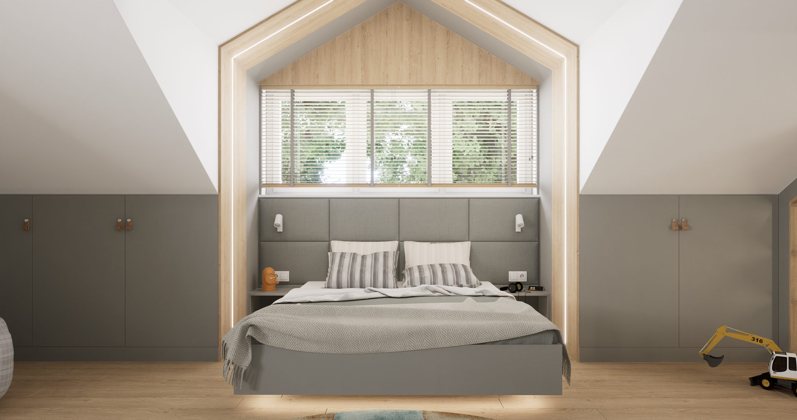 W projekcie wnętrza dwóch bliźniaczych sypialni, postawiłem na nowoczesny styl, gdzie szarości idealnie komponują się z jasnymi, ciepłymi odcieniami drewna. Pokoje na poddaszu z charakterystycznymi skosami zyskały nowe życie, stając się niepowtarzalnym azylem dla młodych piłkarskich entuzjastów.