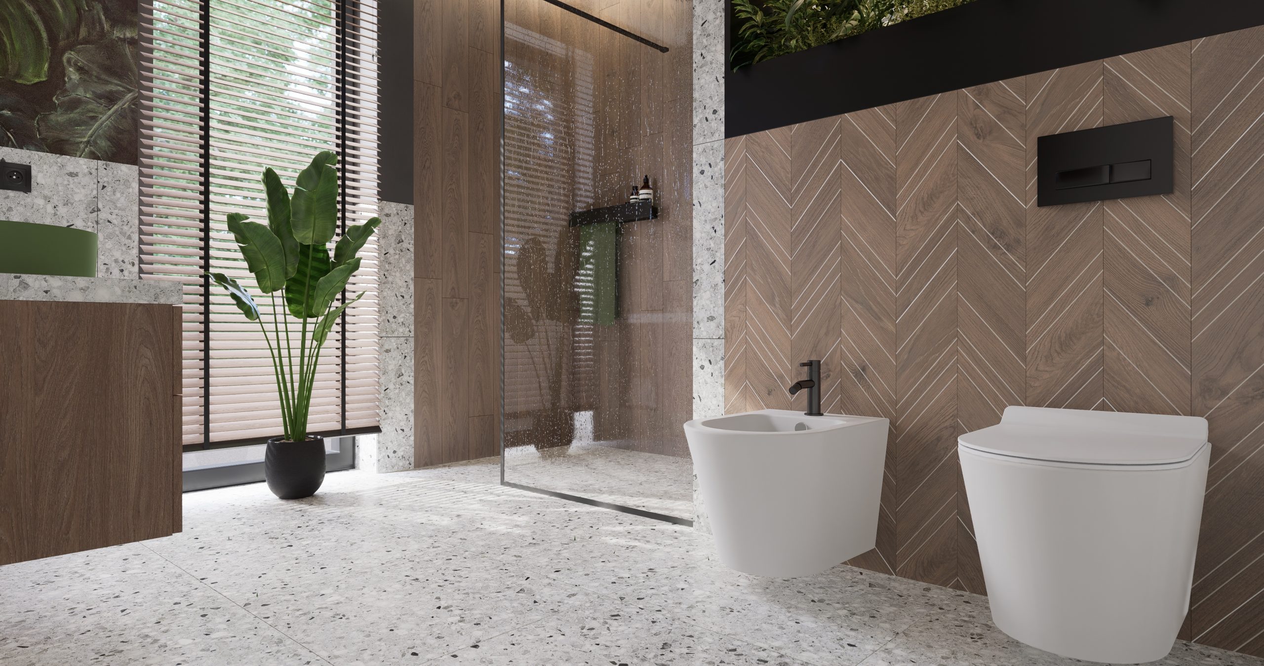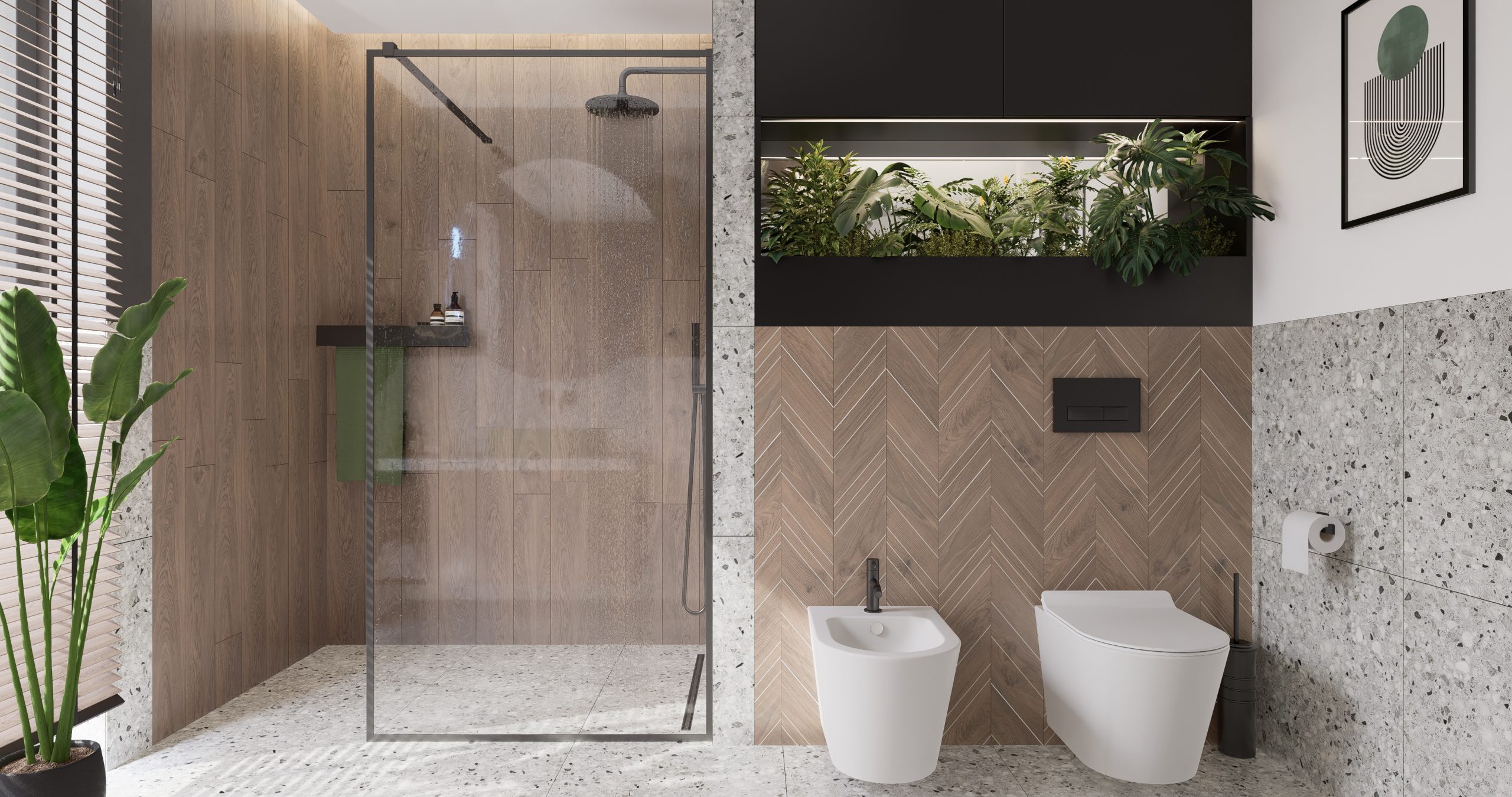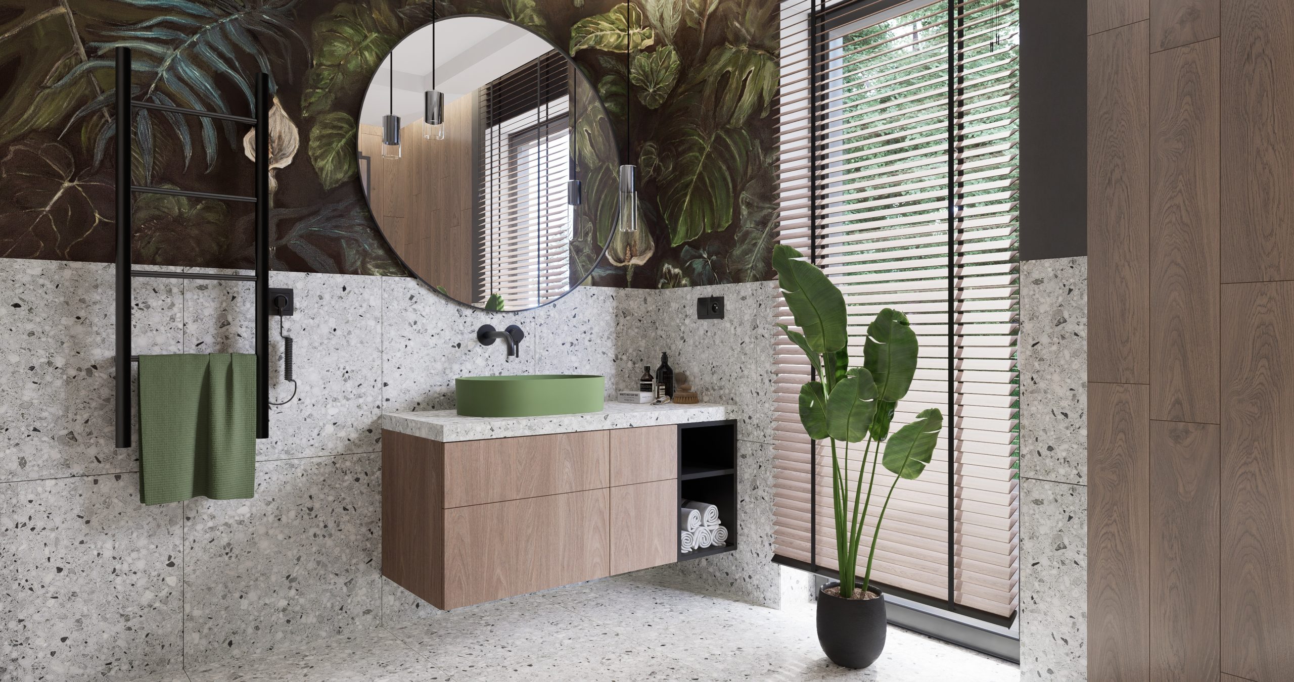 Łazienka utrzymana w nowoczesnym stylu z obfitością zieleni stanowi idealne miejsce na relaks po ciężkim dniu. Drewniane elementy dodają ciepła, a czarne dodatki wprowadzają nutę nowoczesności. Fototapeta z tropikalnym motywem nadaje wnętrzu wyjątkowego klimatu, tworząc oazę spokoju i idealne miejsce na relaksujący prysznic.