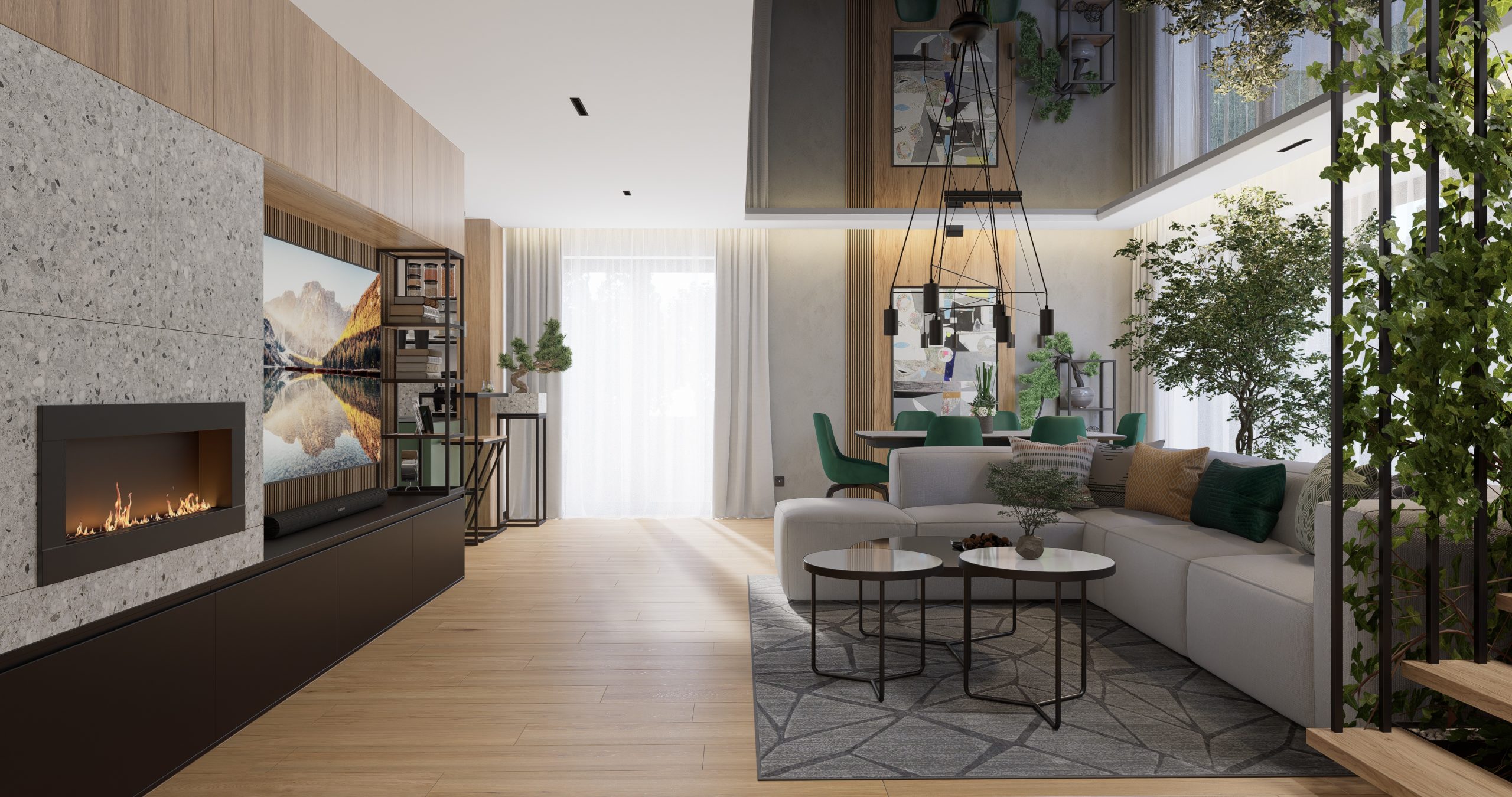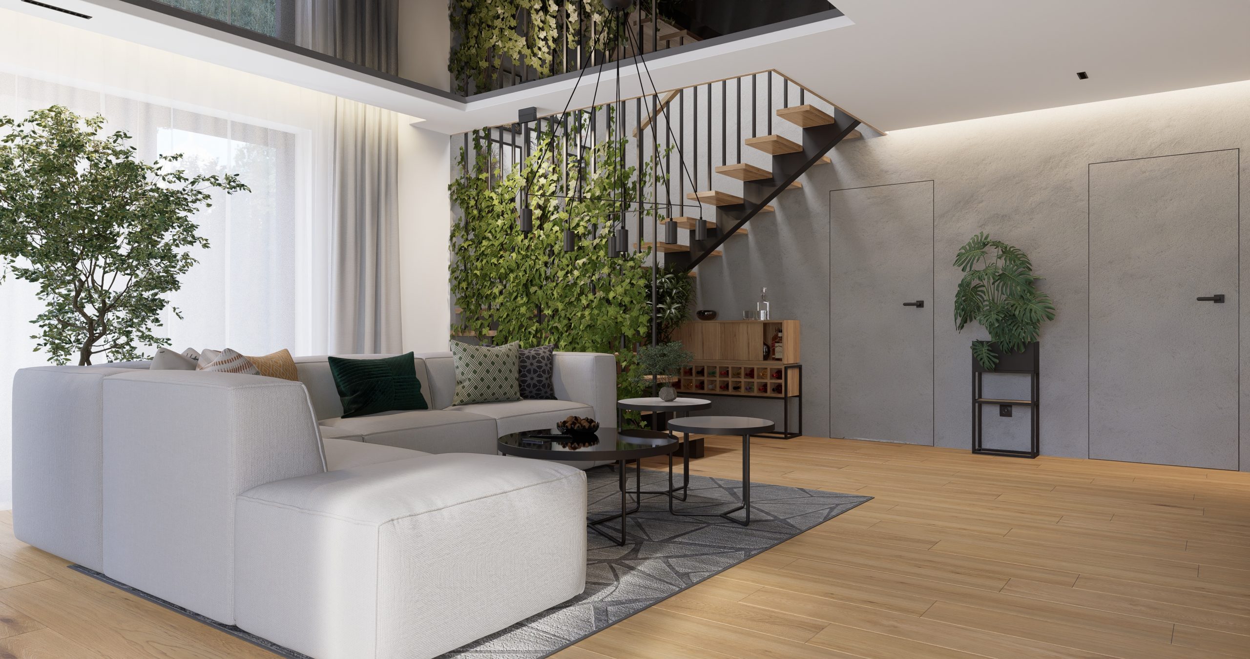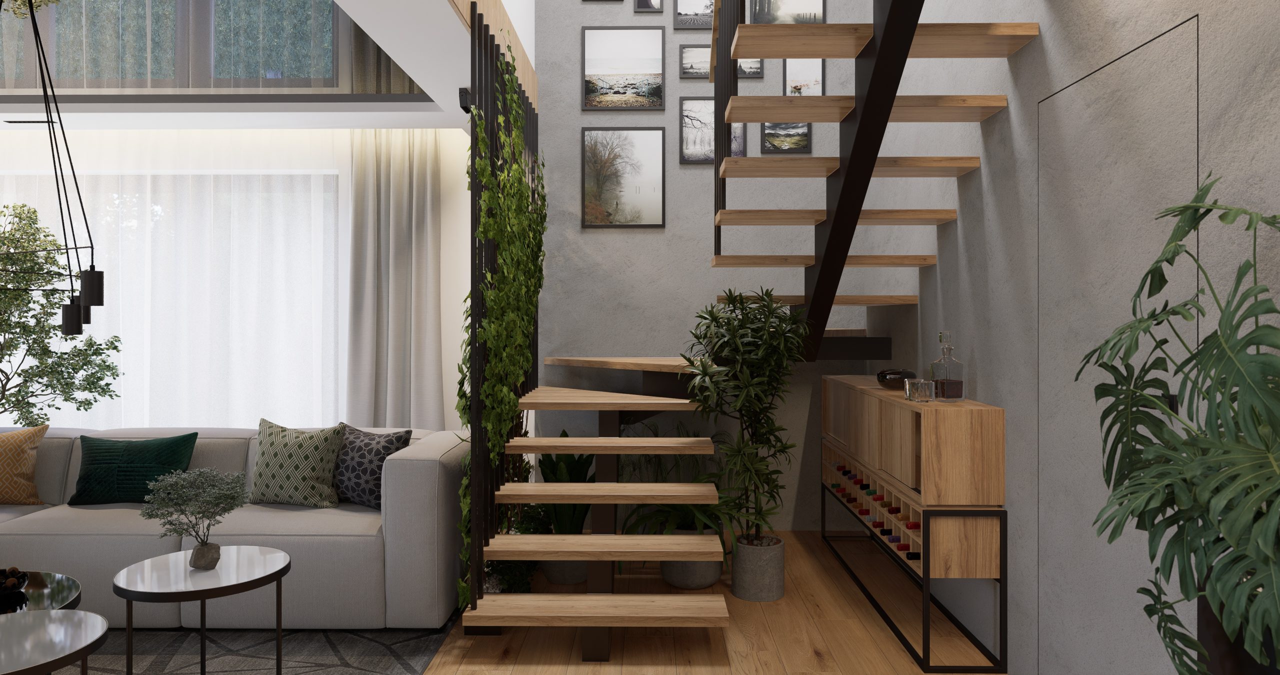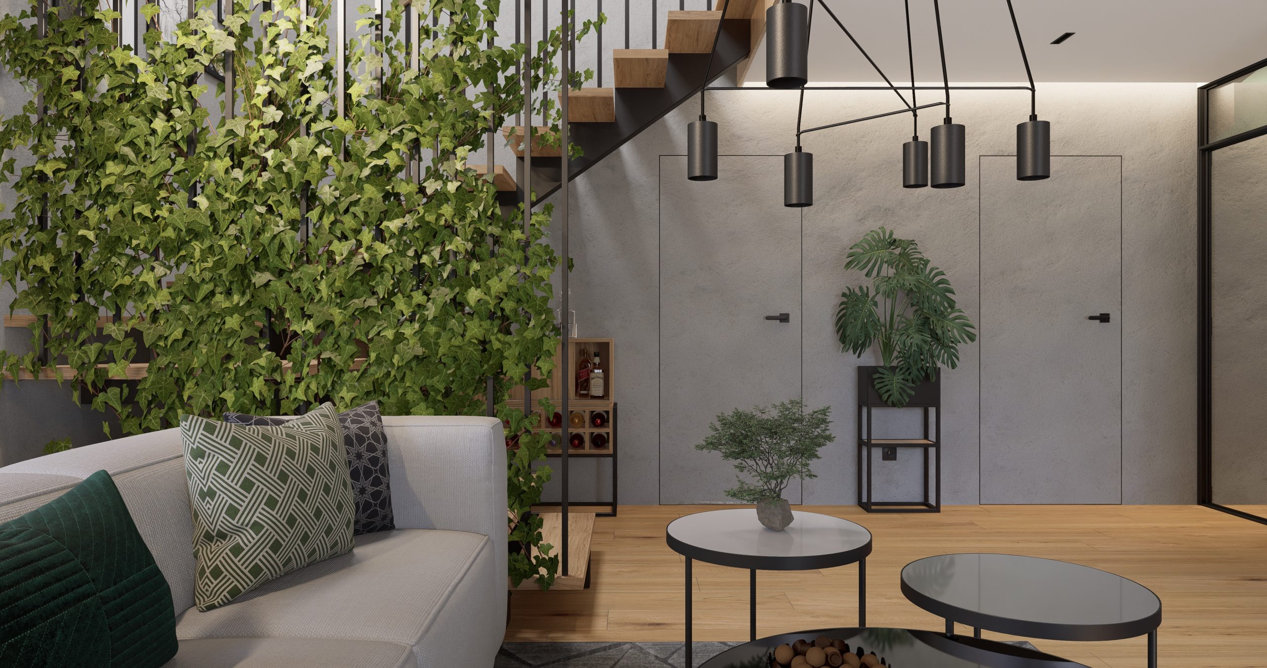 Ta przestrzeń została stworzona z myślą o klientach, którzy pragnęli otoczenia pełnego zieloni i przytulnego drewna. Otwarte półki i kwietniki na rośliny, a także schody zdobiące się pnącym bluszczem, to doskonałe rozwiązania dla pasjonatów botaniki. Loftowe elementy dodające industrialnego charakteru doskonale współgrają z nowoczesnym stylem.