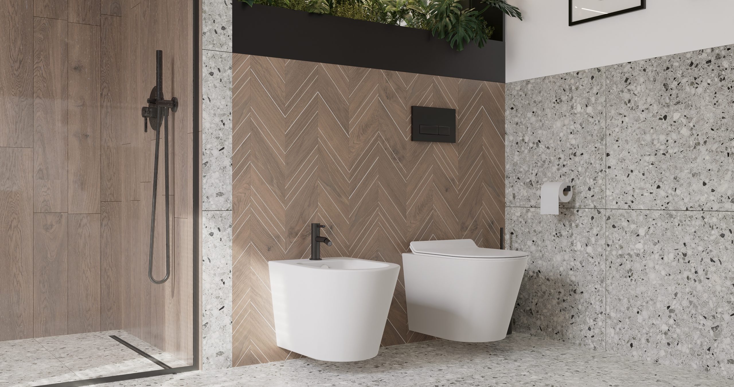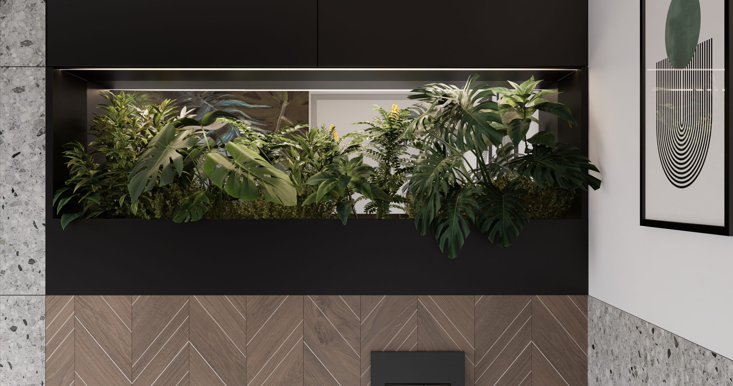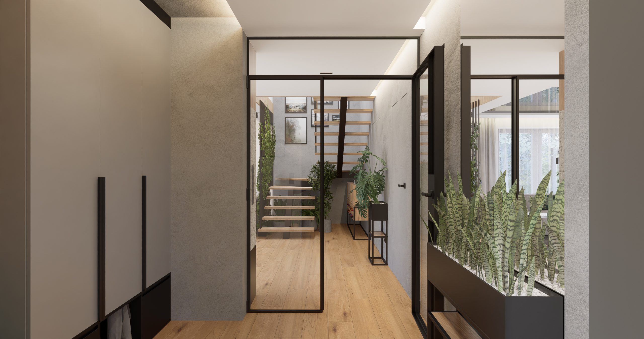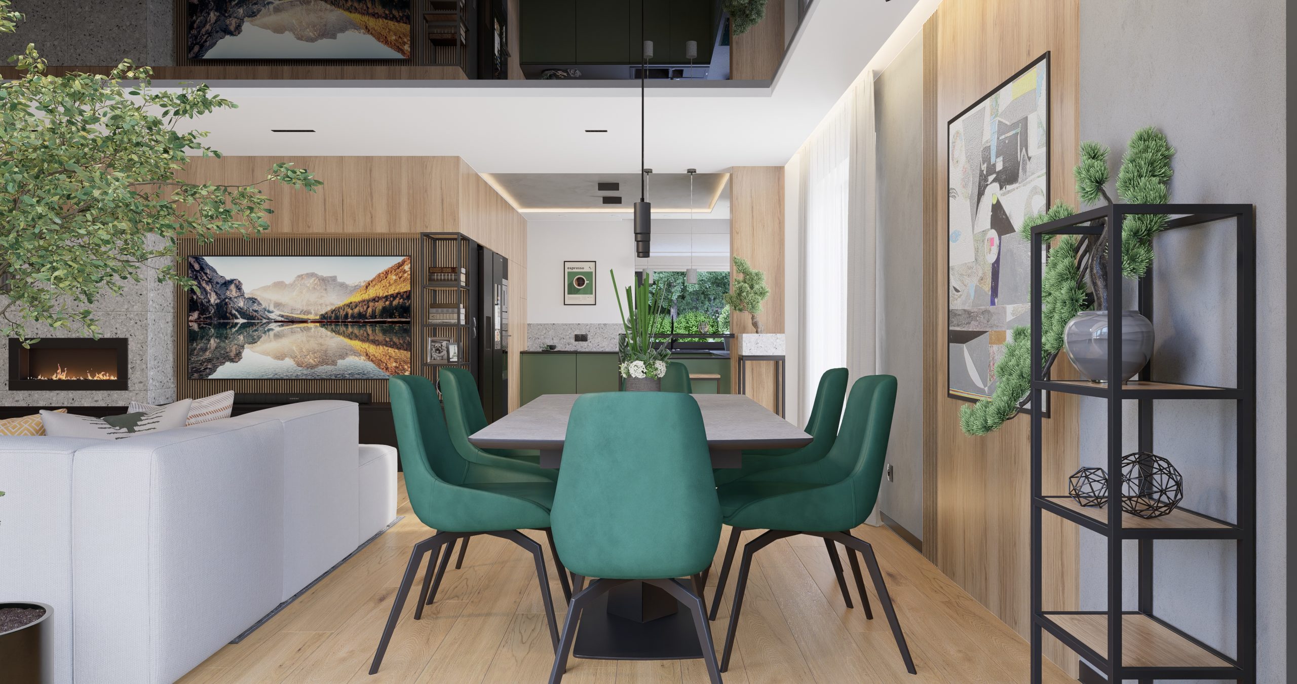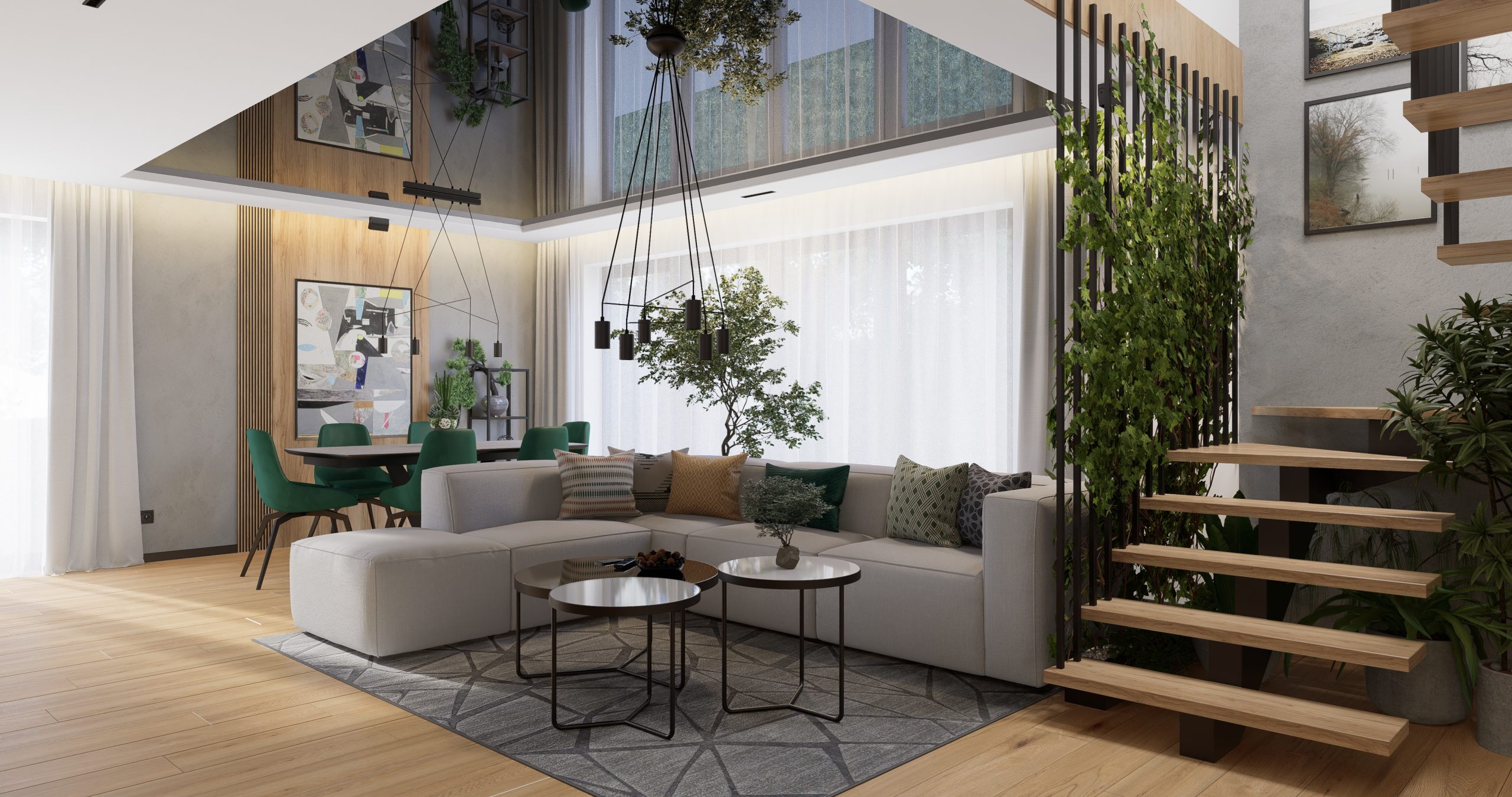 Ta przestrzeń została stworzona z myślą o klientach, którzy pragnęli otoczenia pełnego zieloni i przytulnego drewna. Otwarte półki i kwietniki na rośliny, a także schody zdobiące się pnącym bluszczem, to doskonałe rozwiązania dla pasjonatów botaniki. Loftowe elementy dodające industrialnego charakteru doskonale współgrają z nowoczesnym stylem.