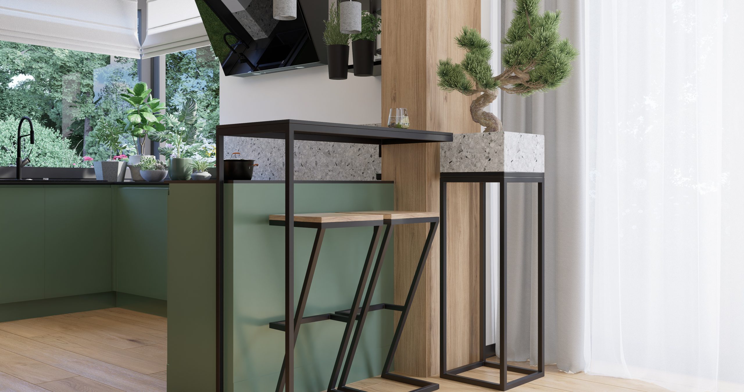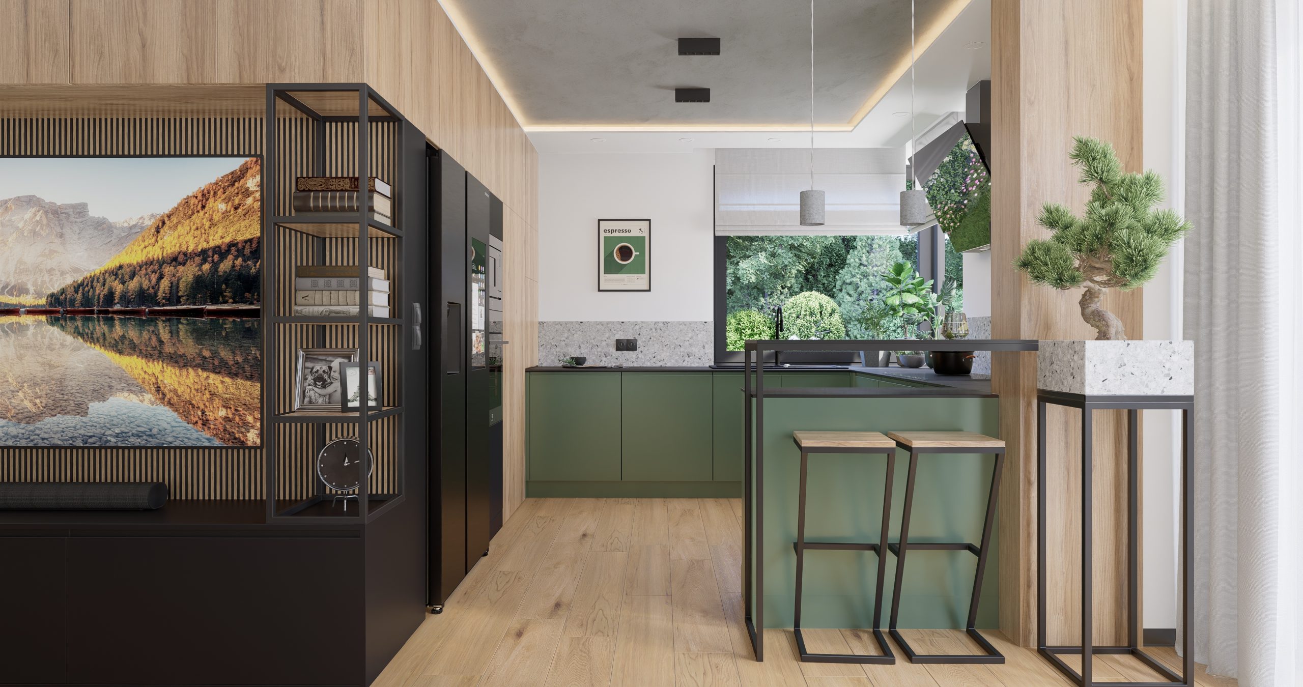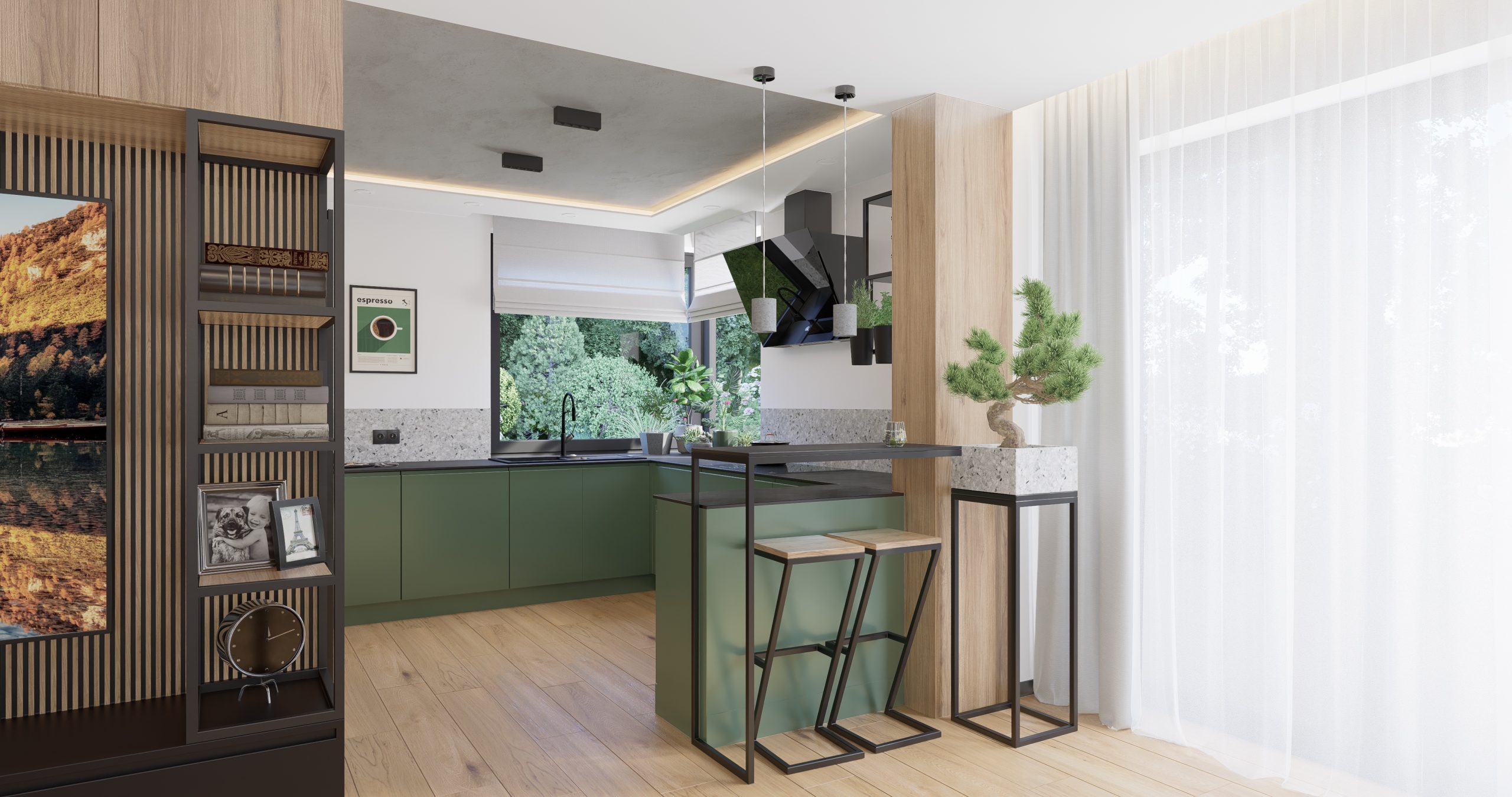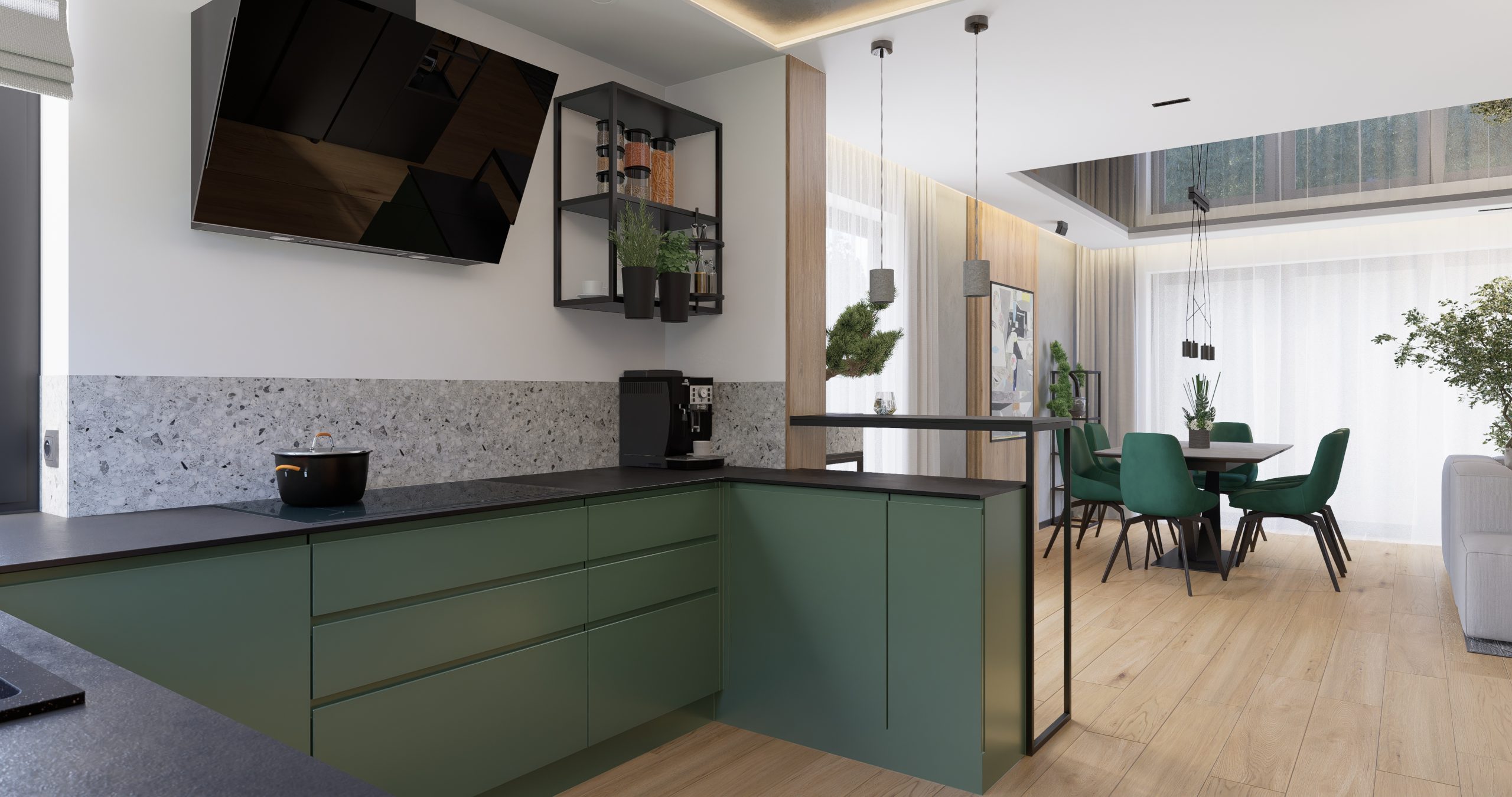 Kuchnia jest połączeniem natury, nowoczesności i industrialnego designu. Zielone fronty szafek stanowią serce tego projektu, nadając wnętrzu świeżość i harmonię. Surowość i wyrazistość betonowego sufitu oraz opraw oświetleniowych tworzą kontrast, który przyciąga uwagę. Lastryko i metalowa konstrukcja barku nadają wnętrzu charakteru, tworząc unikalny klimat.