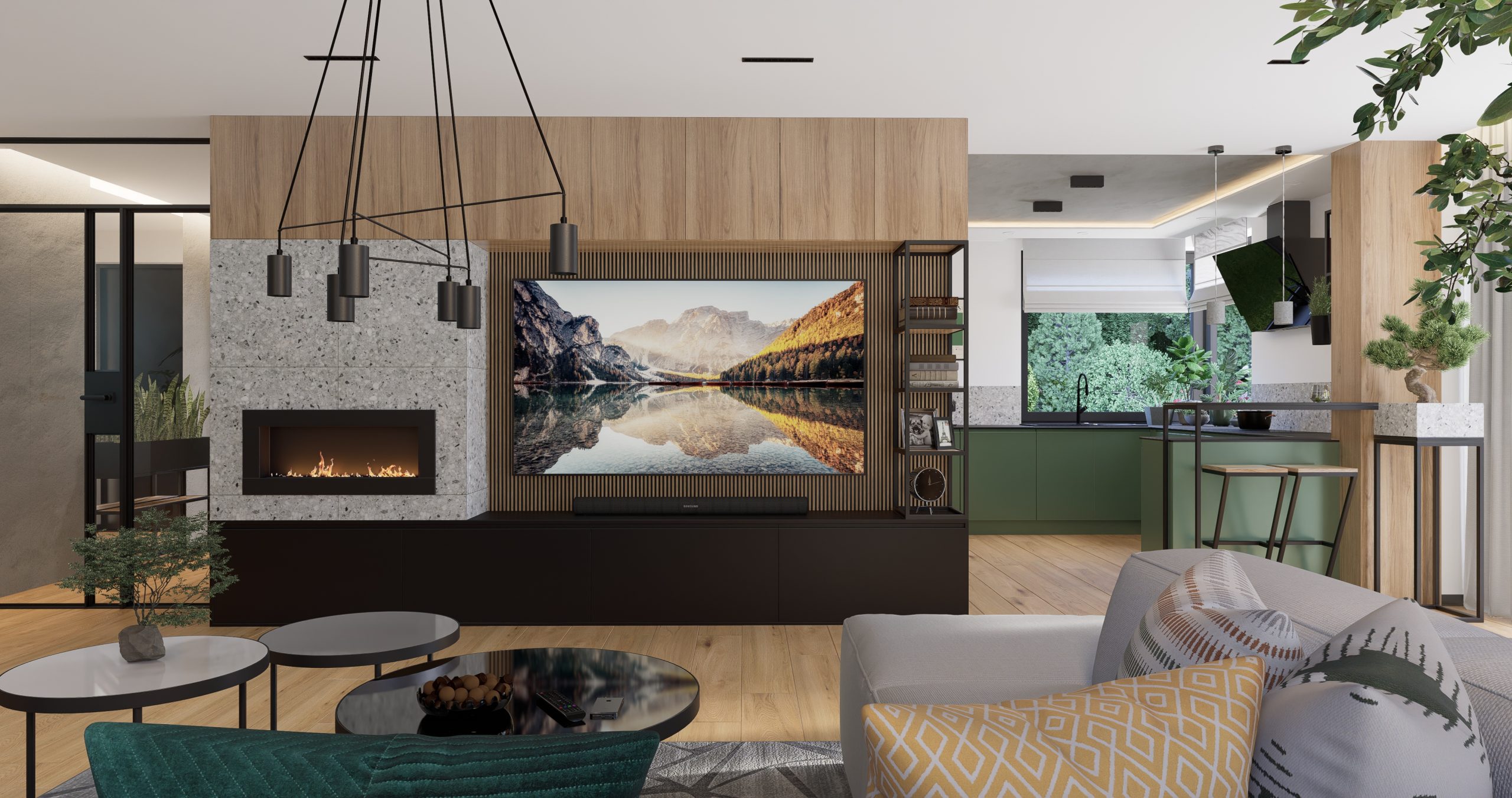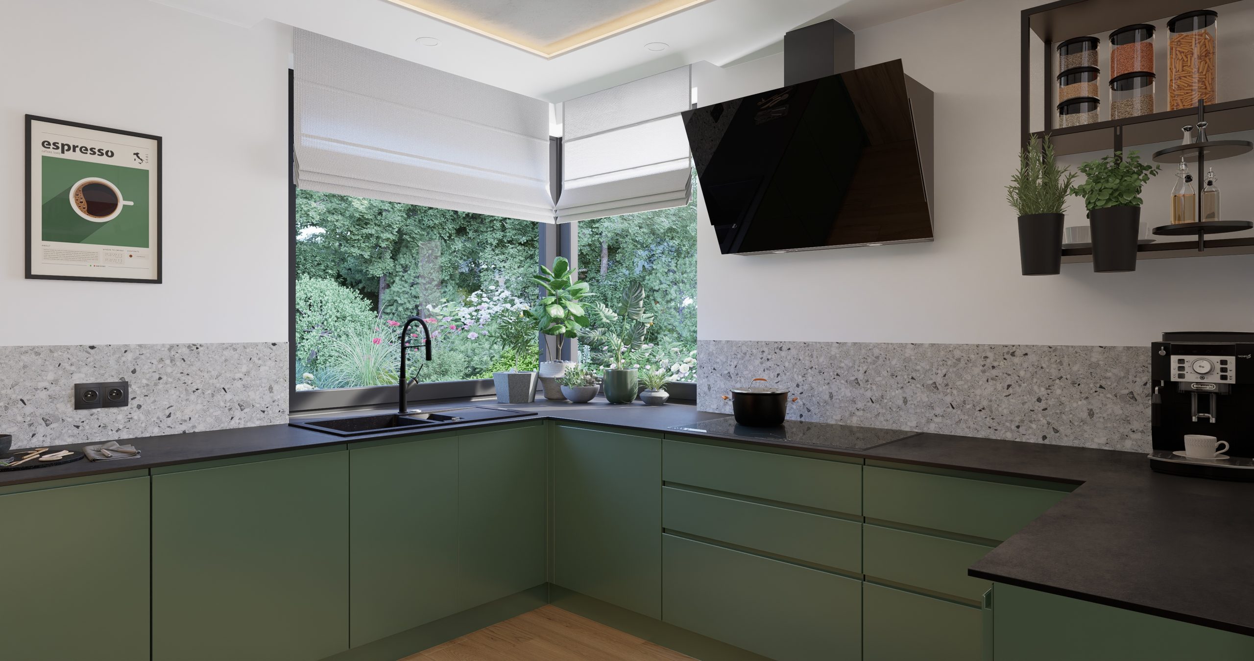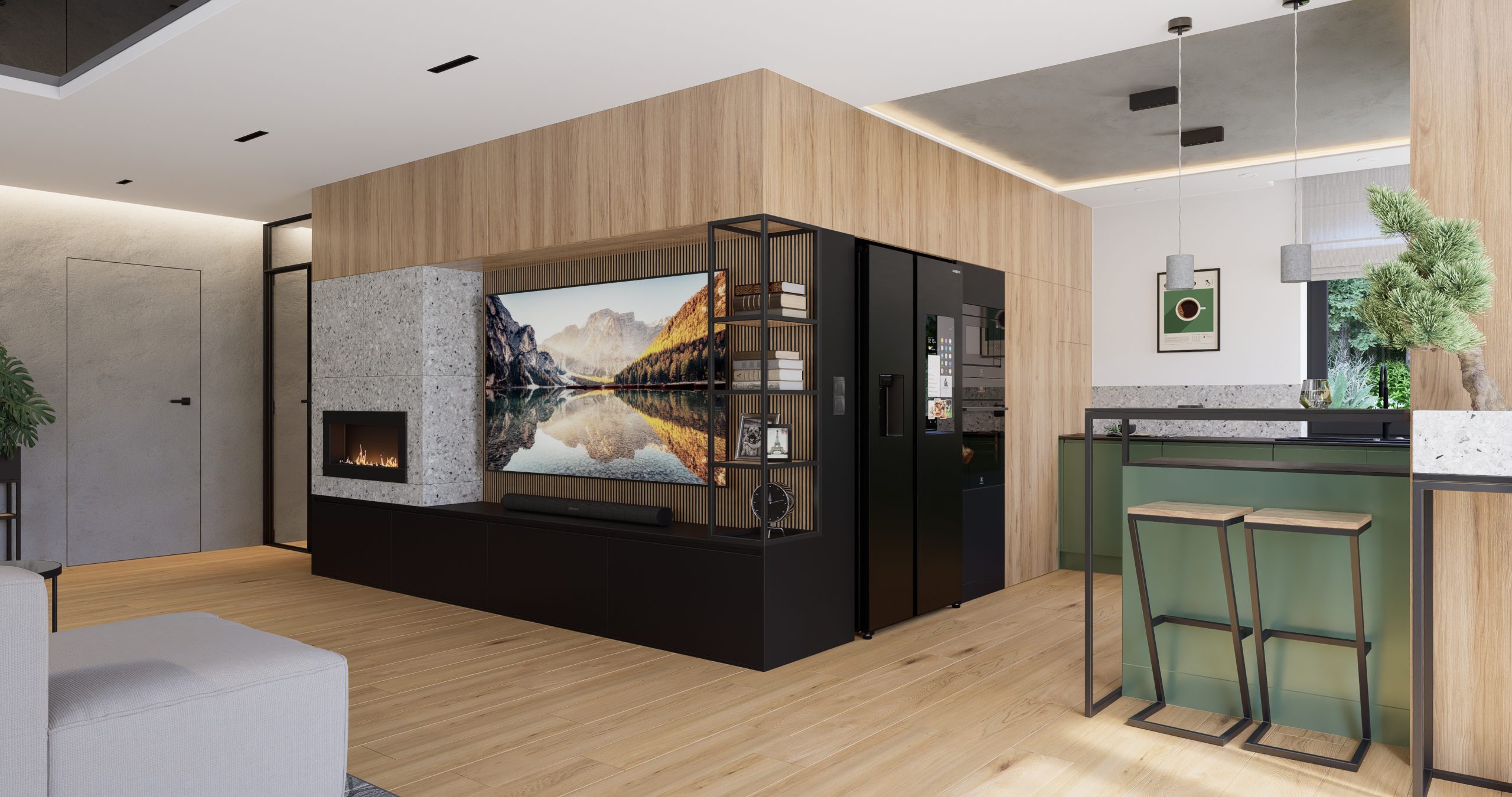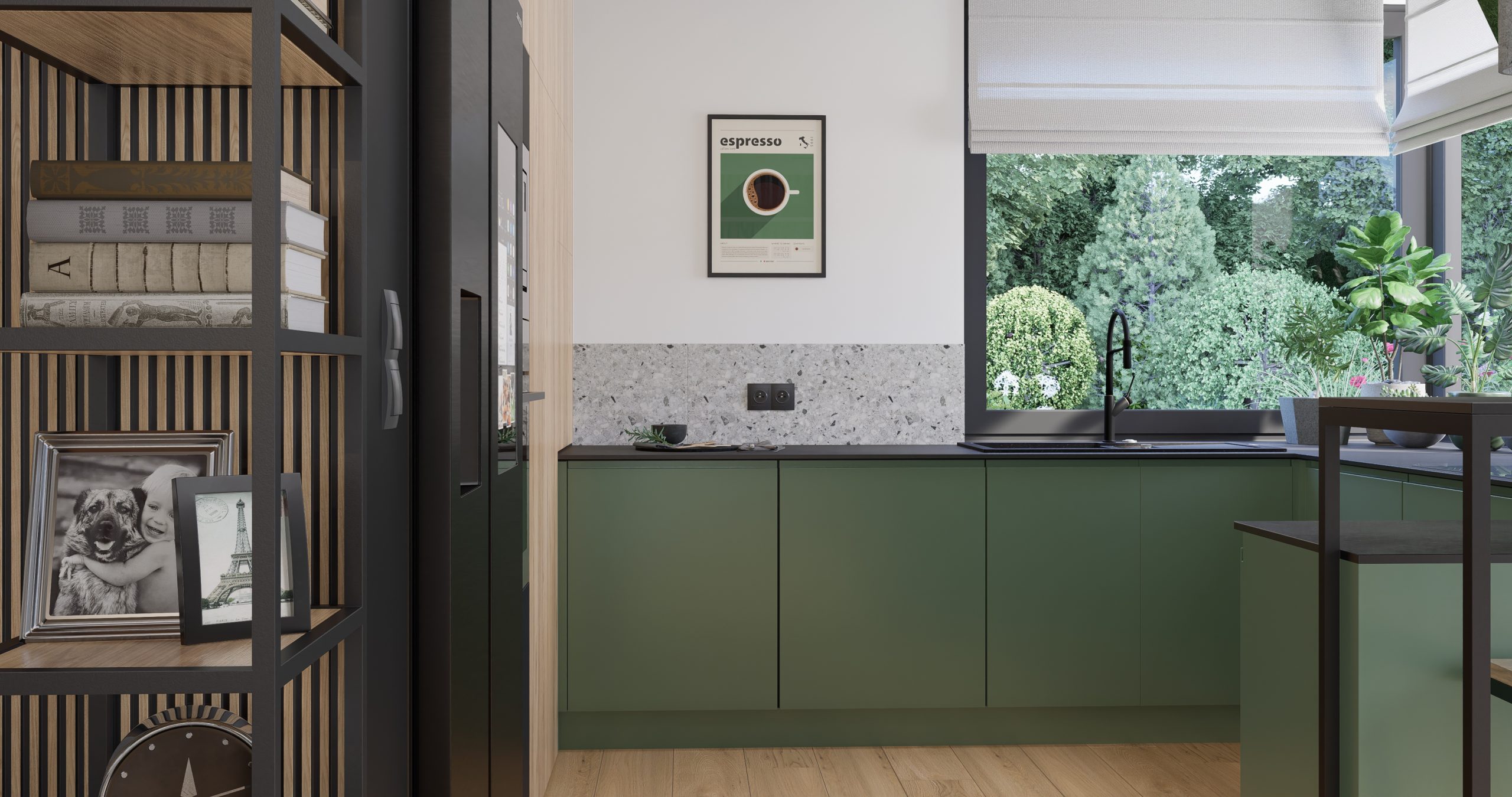 Kuchnia jest połączeniem natury, nowoczesności i industrialnego designu. Zielone fronty szafek stanowią serce tego projektu, nadając wnętrzu świeżość i harmonię. Surowość i wyrazistość betonowego sufitu oraz opraw oświetleniowych tworzą kontrast, który przyciąga uwagę. Lastryko i metalowa konstrukcja barku nadają wnętrzu charakteru, tworząc unikalny klimat.