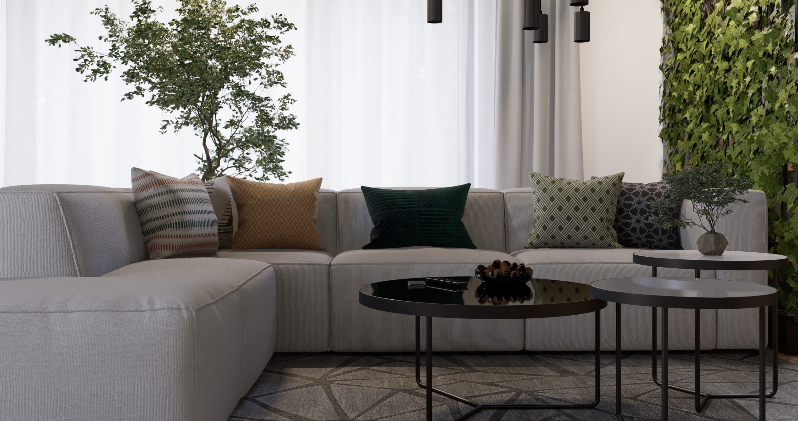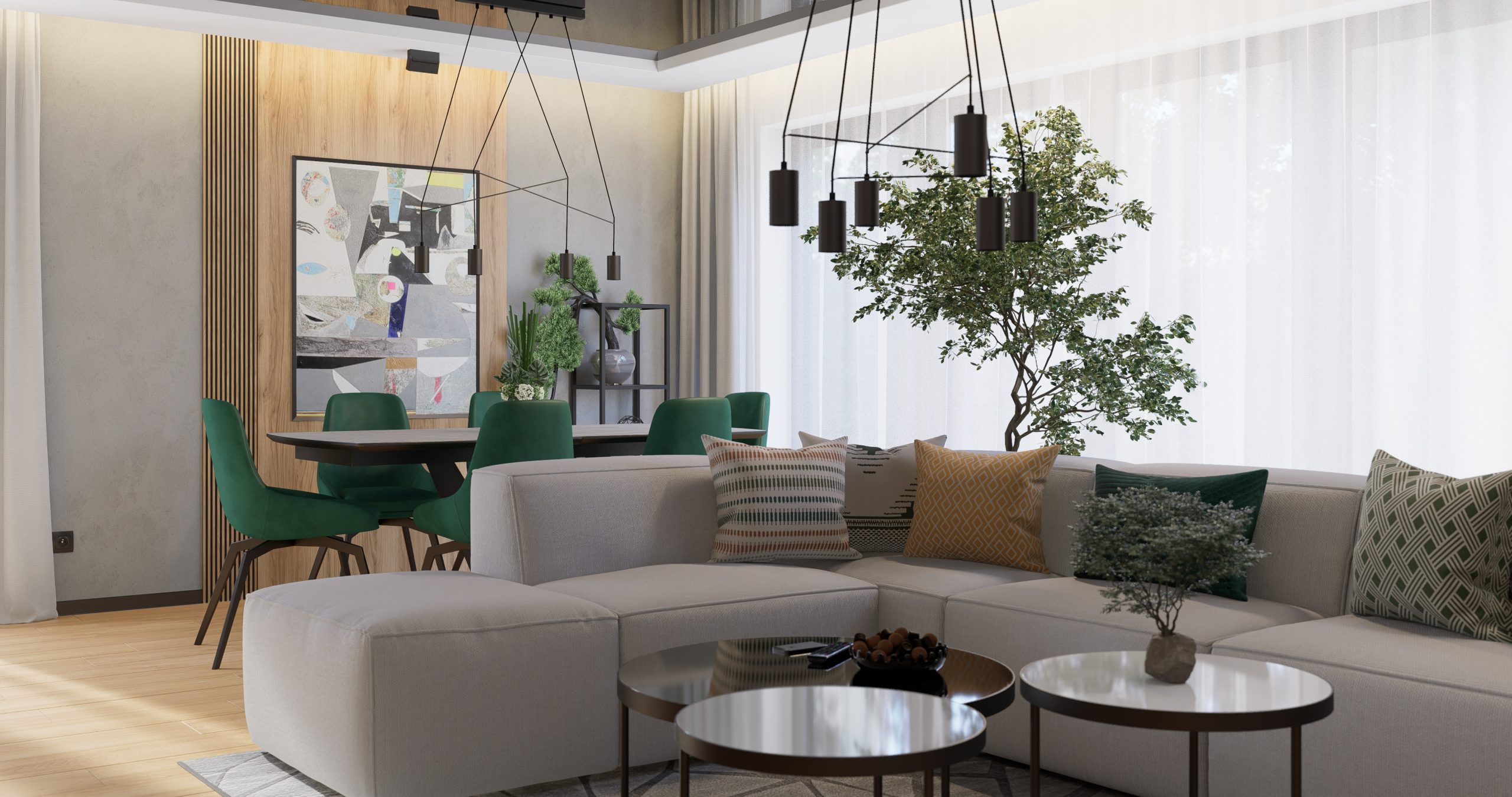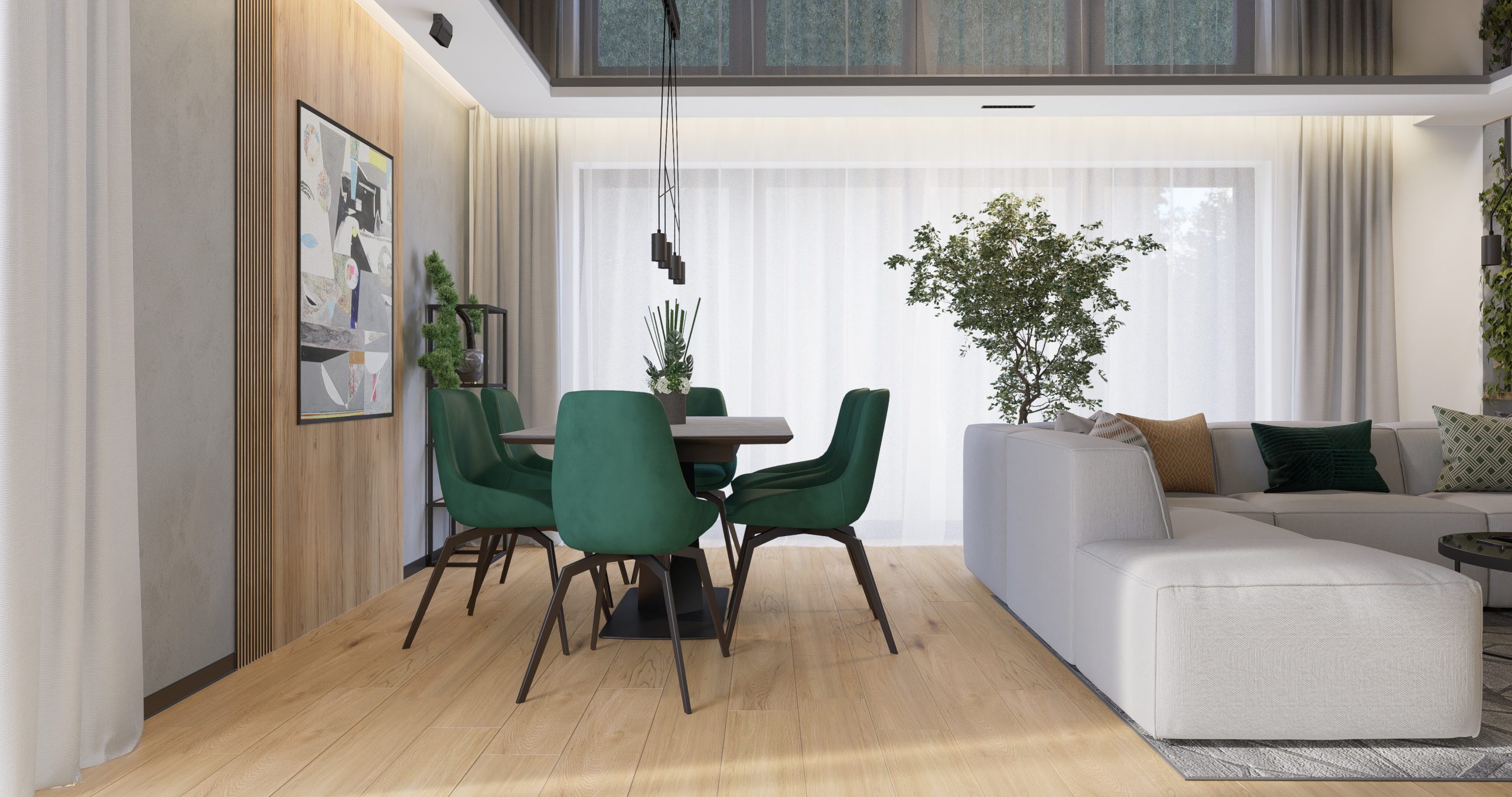 Każdy detal w części dziennej został starannie dobrany, aby stworzyć przestrzeń, która nie tylko jest funkcjonalna, ale również estetyczna. Duży, miękki narożnik zachęca do odpoczynku po intensywnym dniu. To nie tylko salon - to oaza spokoju, miejsce, w którym natura staje się integralną częścią wnętrza, a nowoczesność przeplata się z industrialnymi akcentami.